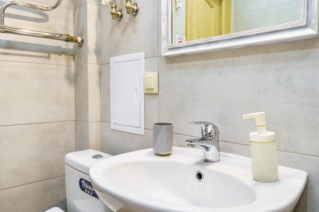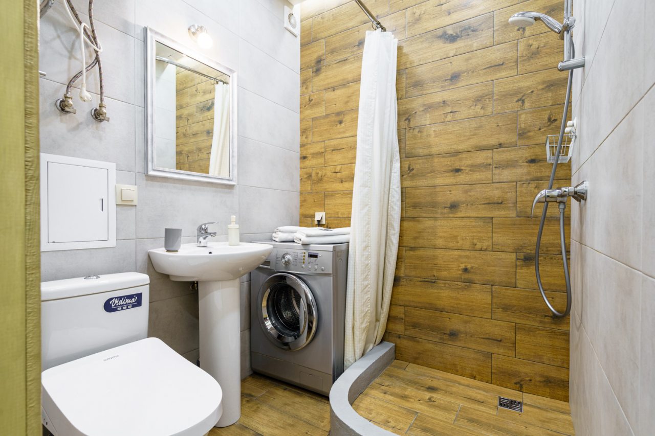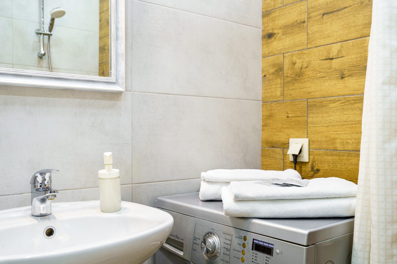 В апартаментах установлена просторная ванна, оформление интерьера выполнено с выдержанными акцентами и необычными декоративными элементами. Присутствует вся необходимая техника.