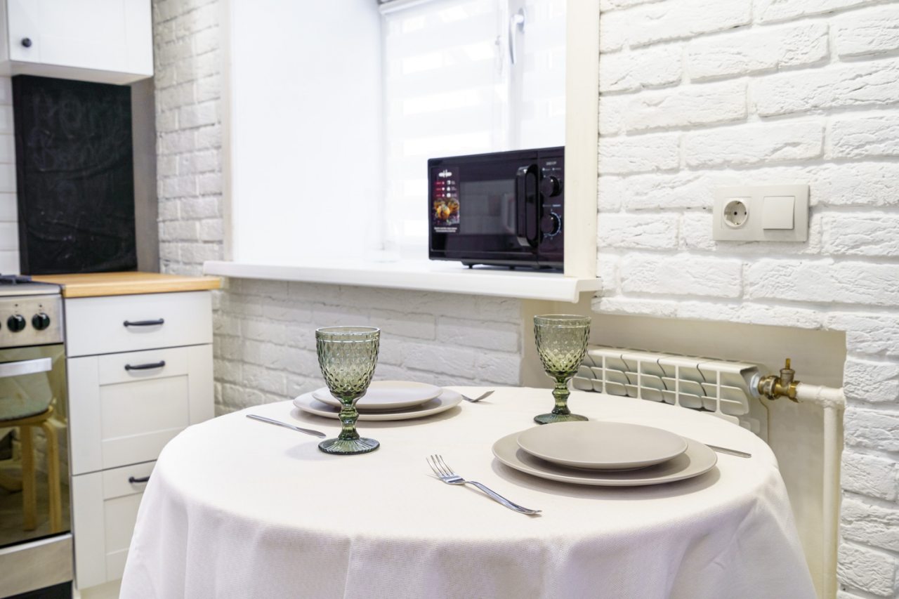 Просторная кухня оборудована плитой, холодильником, микроволновой печью, необходимой посудой и обеденным столом.