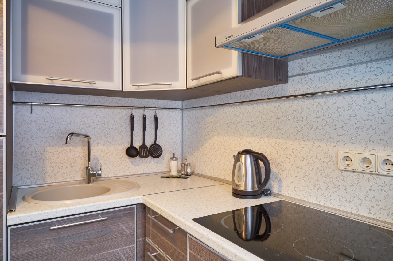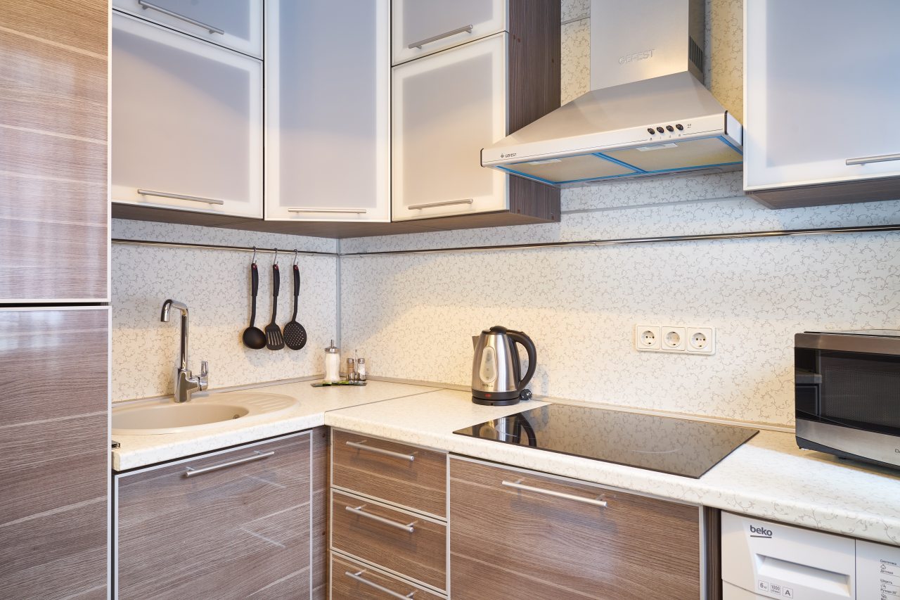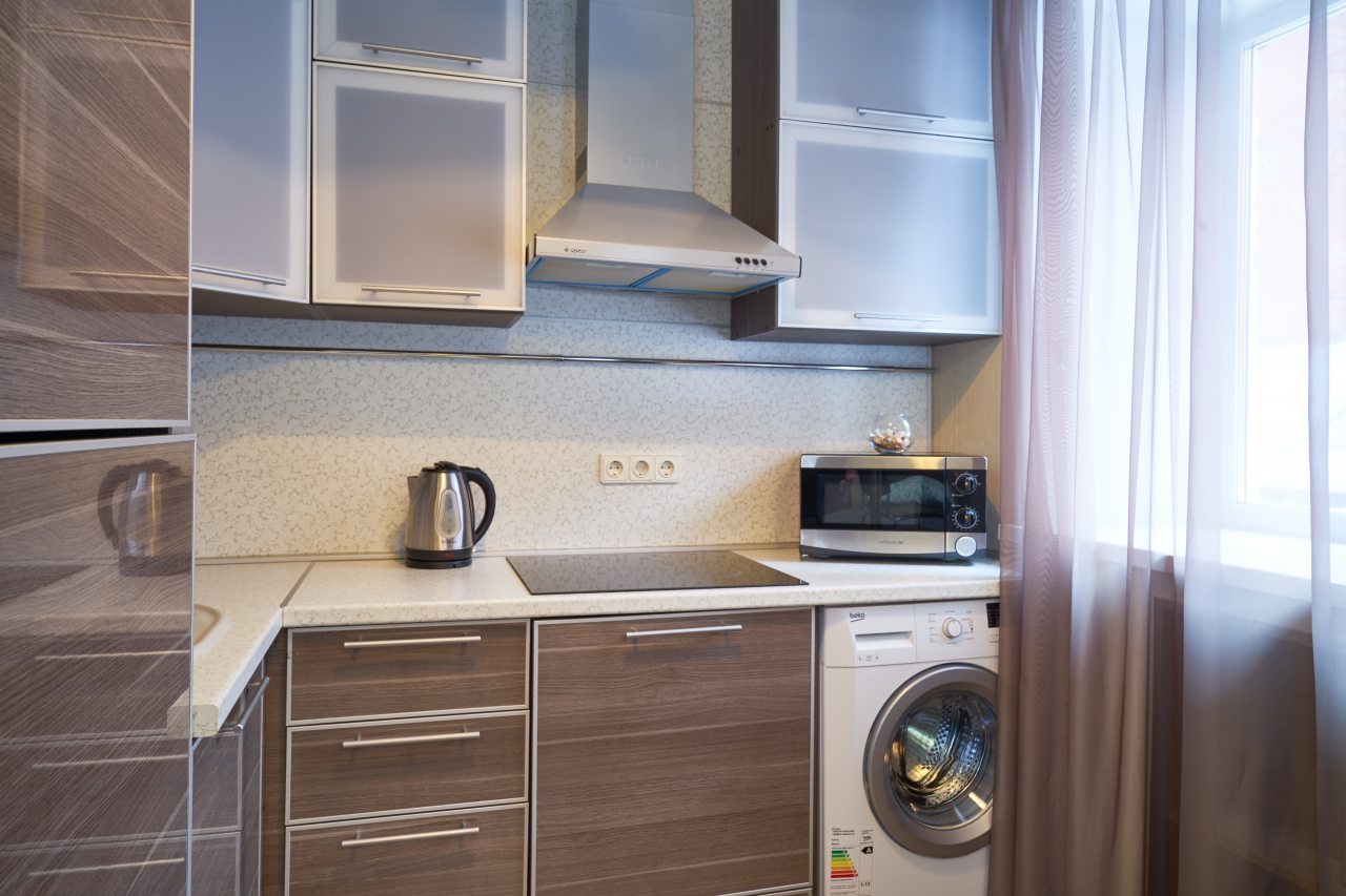 Кухня оборудована бытовой техникой, барной стойкой и посудой. Поблизости продуктовые магазины и пекарня.