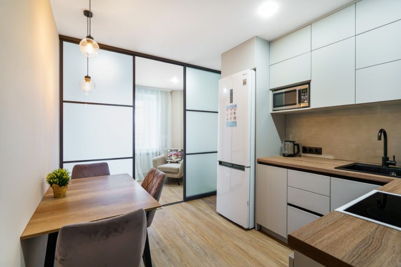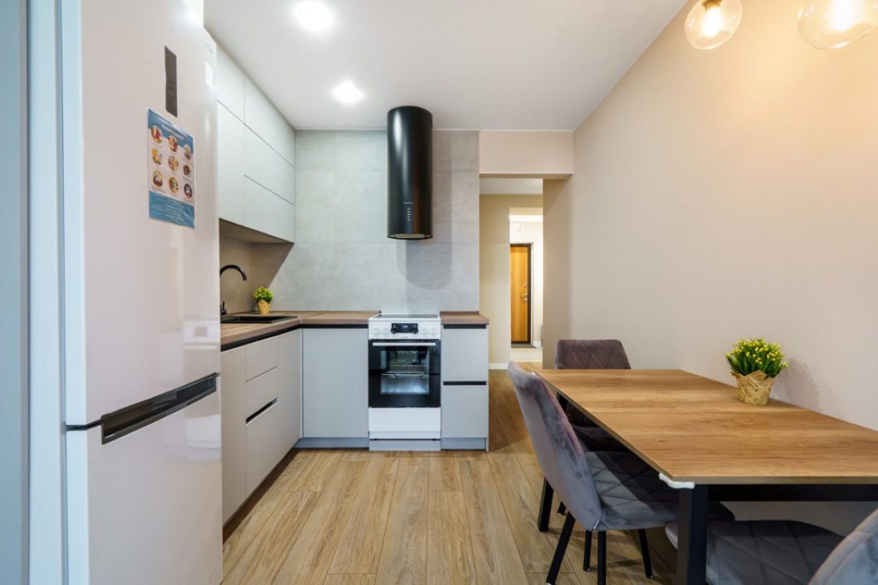 На уютной кухне будет приятно готовить любимые домашние блюда и напитки, так как в наличии плита, вытяжка, СВЧ-печь, духовой шкаф, холодильник, чайник, обеденная зона.