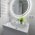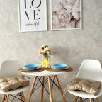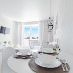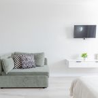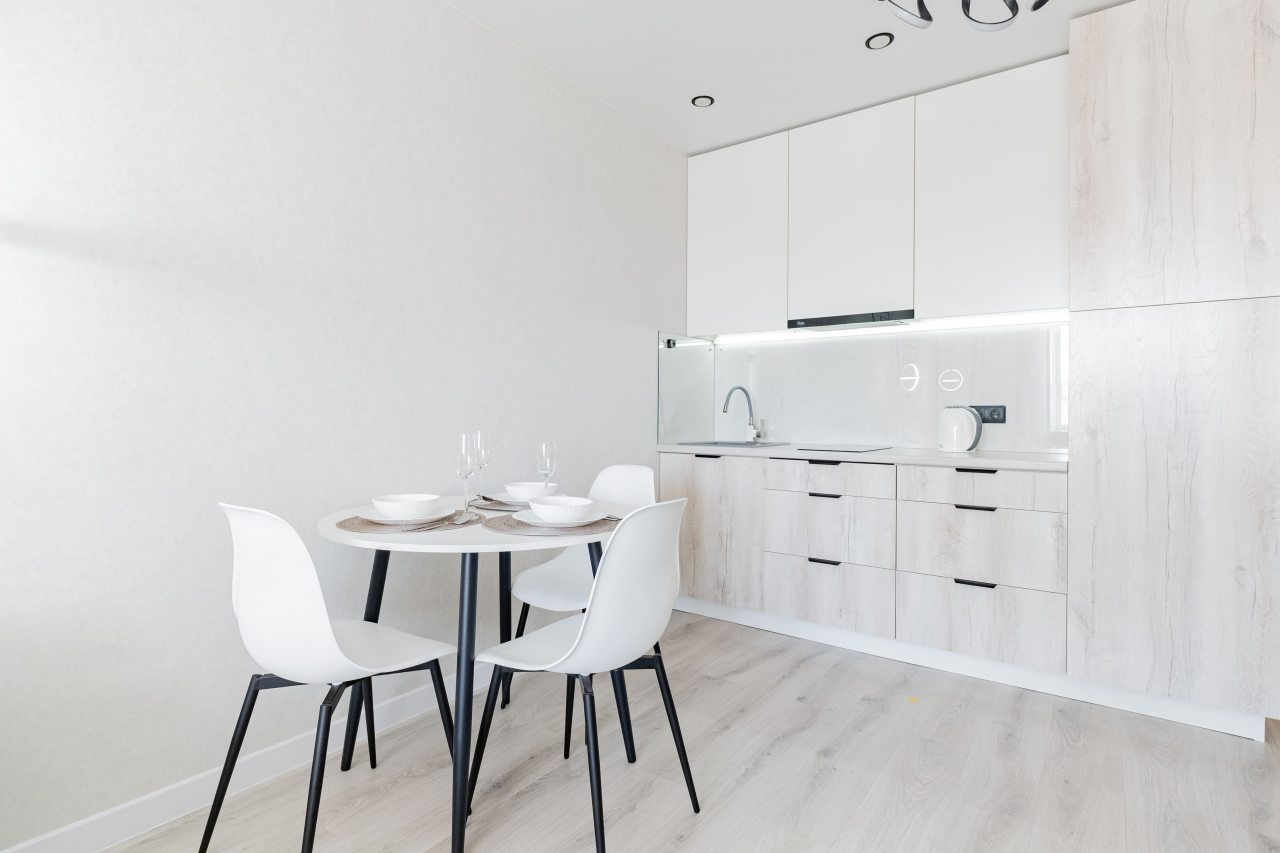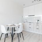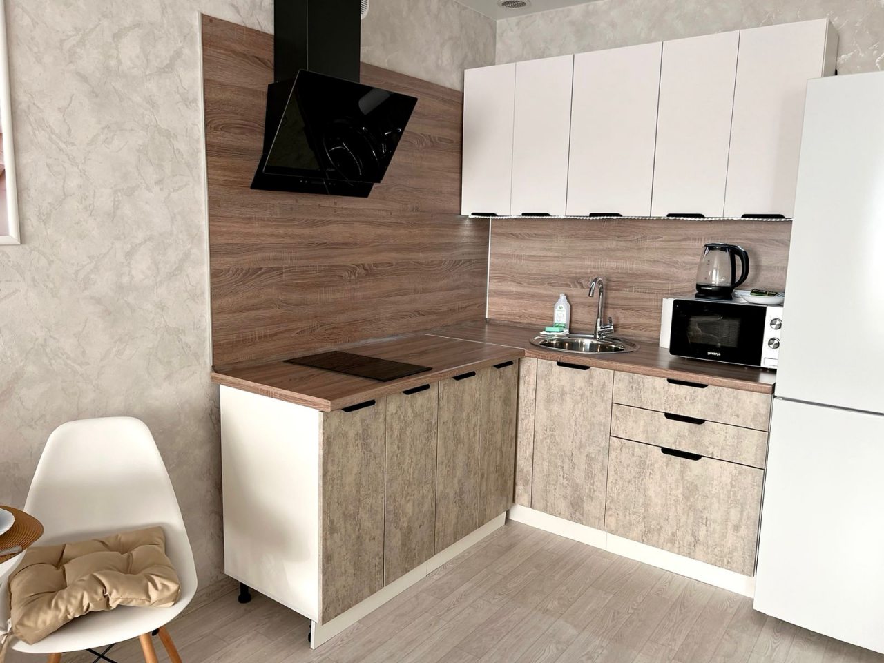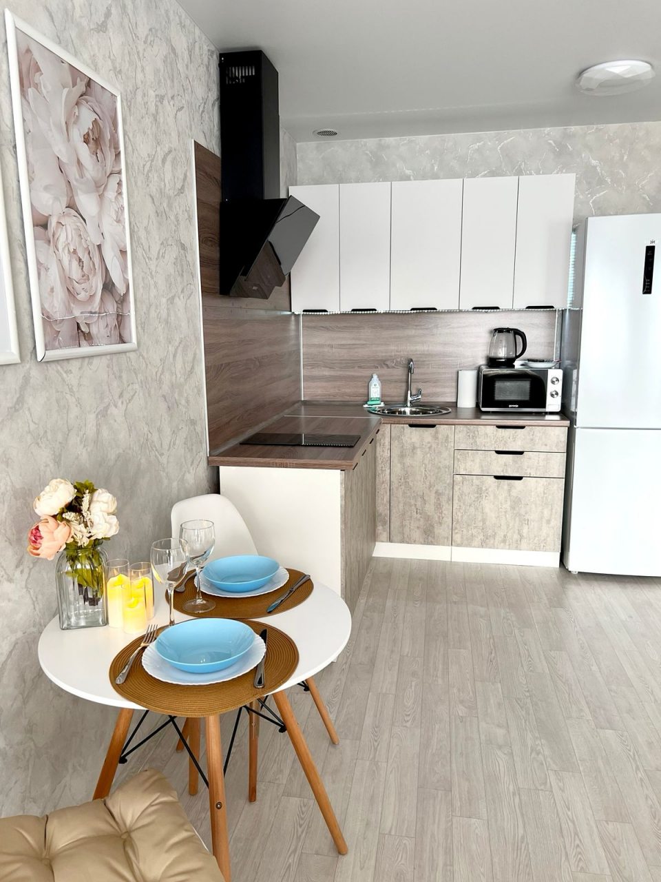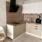 Компактная кухонная зона порадует вас наличием плиты, СВЧ-печи, холодильника, чайника, а также уютной обеденной зоной.