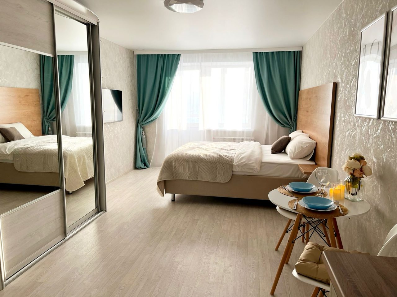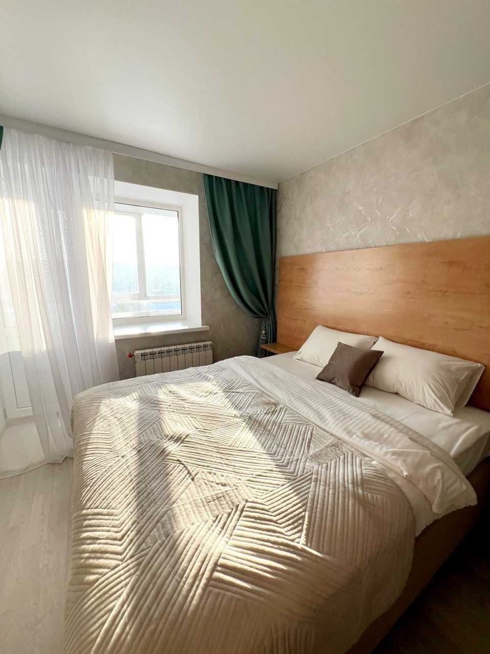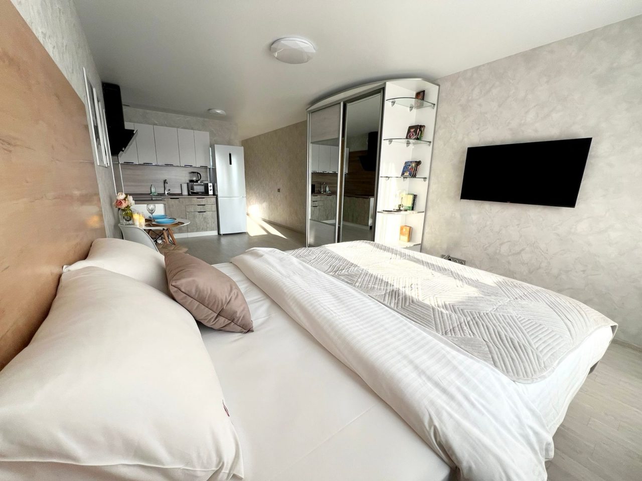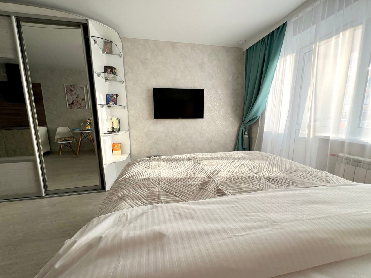 Внутри вас ожидает большая и удобная двуспальная кровать, ЖК-телевизор, вместительный шкаф-купе с зеркалом в полный рост, просторная лоджия с красивым видом на город, стиральная машина, а также полноценная ванна.