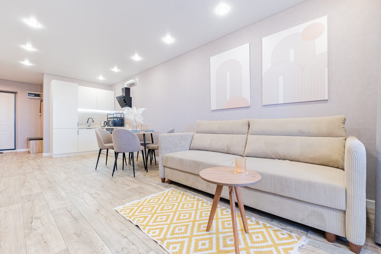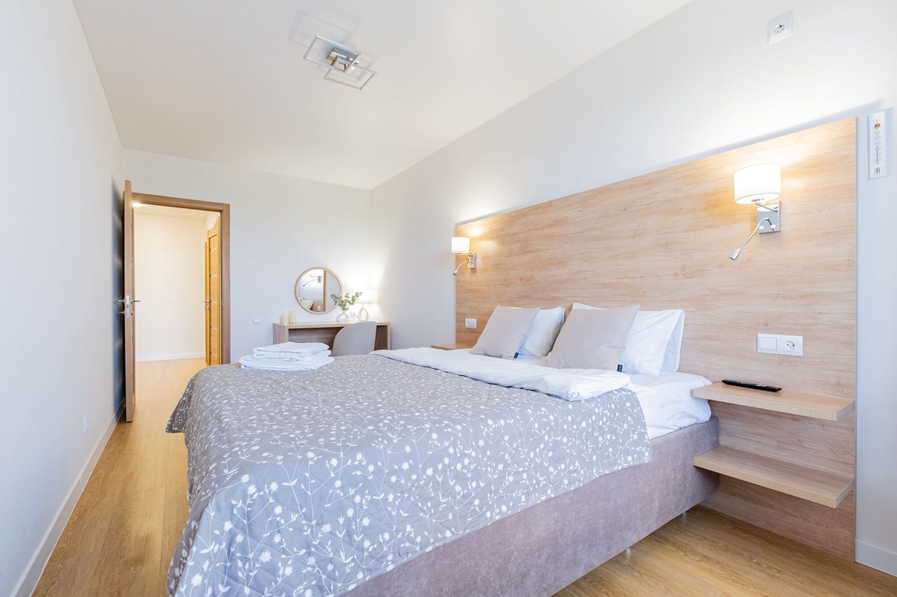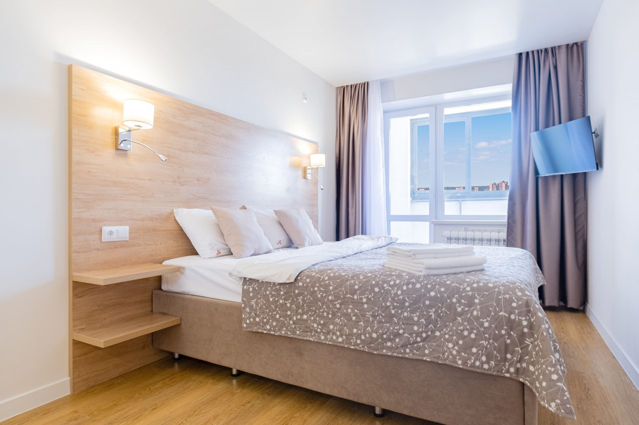 Для выбора представлено несколько вариантов апартаментов, внутри каждых вас ожидает удобное спальное место, вместительный шкаф, телевизор, ванная комната с необходимой сантехникой.