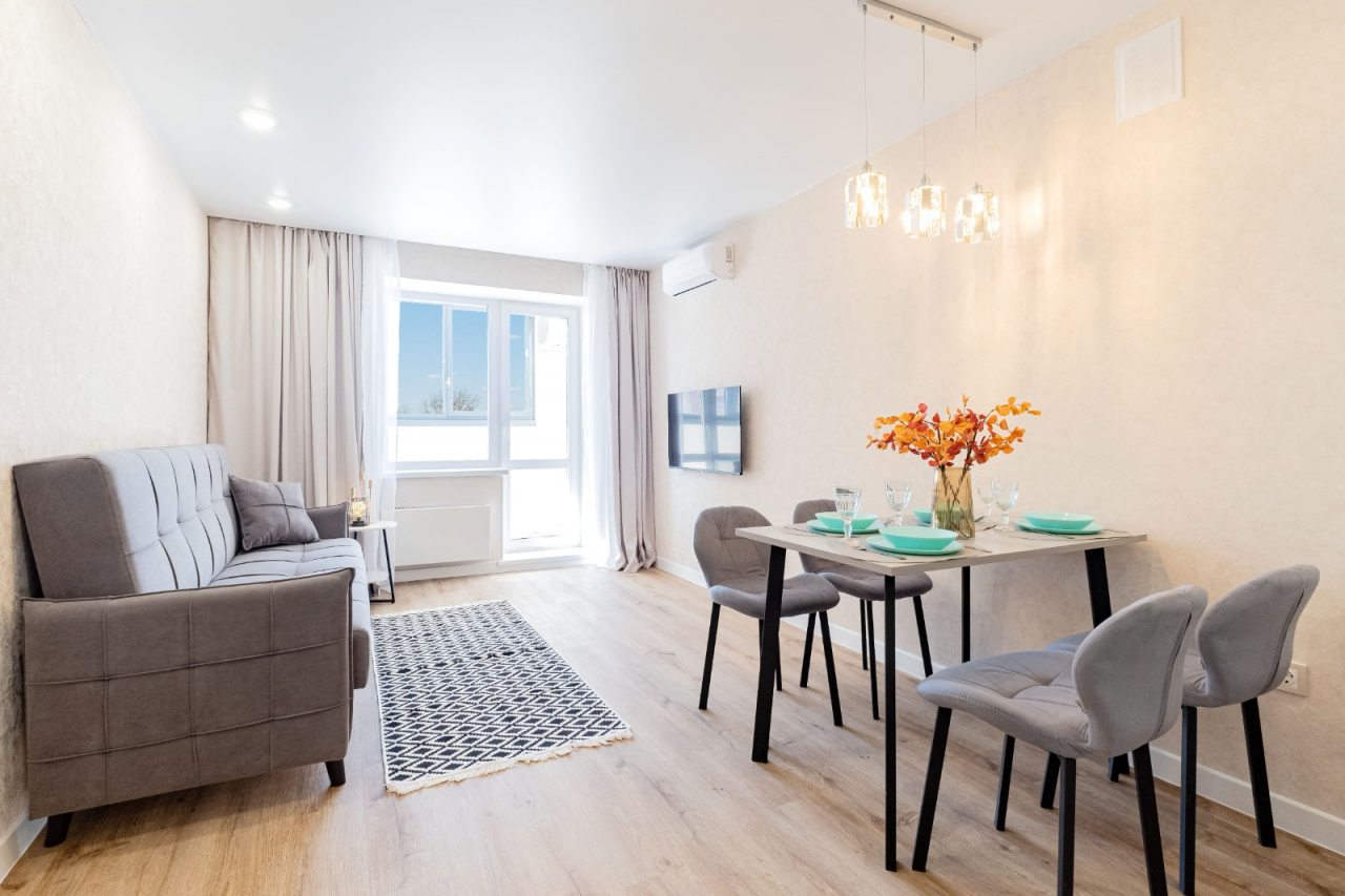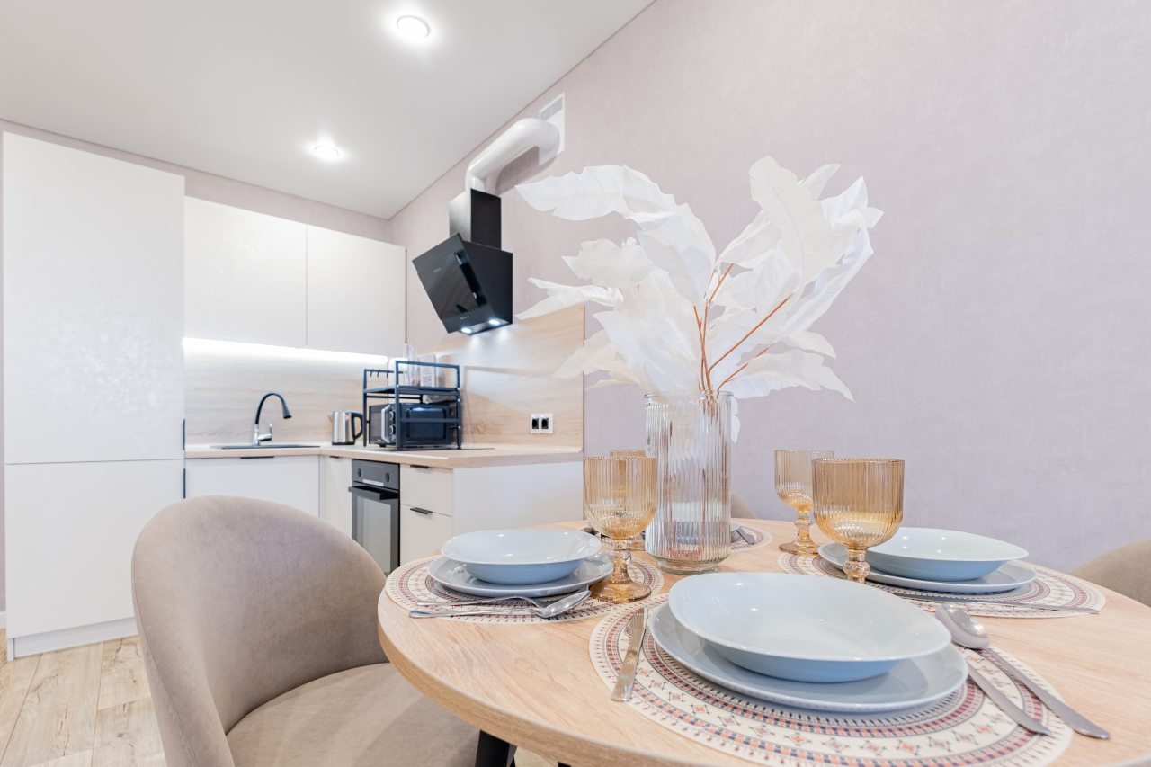 Комплектация кухонной бытовой техники может отличаться в зависимости от категории. В большинстве имеется СВЧ-печь, чайник, варочная панель, холодильник, красивая обеденная зона.