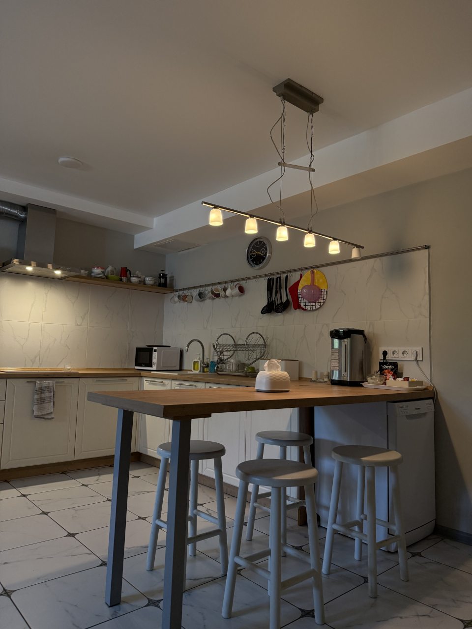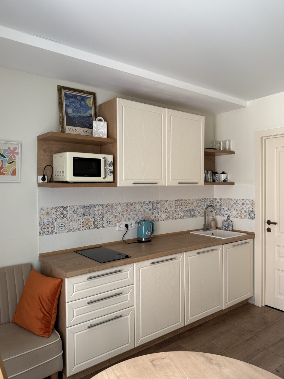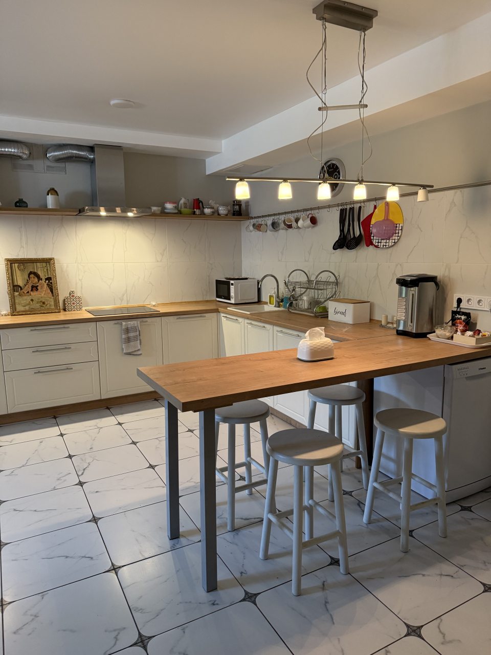 Просторная кухня обустроена гарнитуром, обеденной зоной и бытовой техникой. Поблизости есть кондитерская и продуктовый магазин.