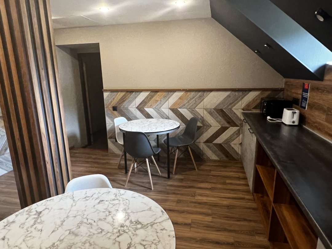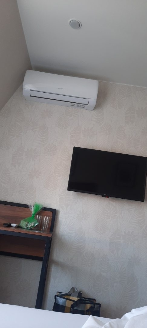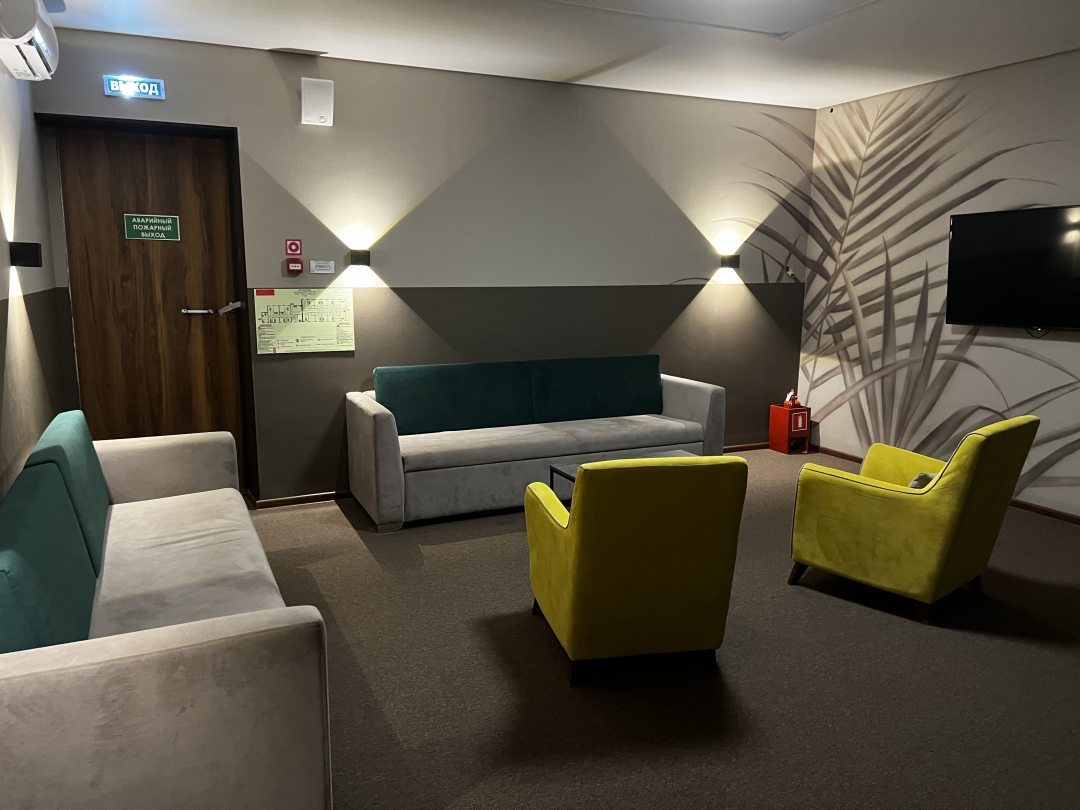 По воле случая оказались в Туапсе, до поезда оставалось примерно 10 часов, поезд ночной, решили снять номер в Смарт отель НЕО. Это отличная задумка, сделать отель на территории жд вокзала. Найти не составляет никакого труда, прозодите пункт досмотра, поднимаетесь по лесенке и направо, буквально несколько метров и двухэтажный отель. На ресепшене приветливо встретил администратор, так как номер ьыл предварииельно забронирован и оплачен, заполнили только анкеты и предъявили паспорта. Выдали ключ, наш номер на втором этаже, 202, всего на втором этаже 5 номеров и комната для питания(столы, стулья, кофемашина, микроволновка, возможно что- то есть еще, наш обзор был визуальным). В номере идеальная чистота, стильный дизайн, свежий ремонт, кстати во всем отеле очень чисто, есть зоны отдыха в холле, с мягкими зонами( диваны, кресла, пуфы- расцветка в комплементарной цветовой форме, очень красиво), паразили картины из сухоцветов. Продолжим по номеру- большая кровать с хорошим матрасом, что немало важно, сатиновое белье, белоснежное, имеется легкое одеяло прикраватные тумбочки, разетки и выключатели рядом с кроватью, по обе стороны от кровати- светильники. Имеется верхний свет, естественное освещение через мансардное окно. Напроттв кровати телевизор, имеется сплит система, стол, пуф, чашки с чайными ложками, стеллаж для одежды с зеркалом во весь рост. Совмещенная душевая, санузел, рукомойник с жидким мылом, душевая кабина( напор воды хороший), полотенца- большое банное и для умывания( или головы), единственное хотелось бы, чтобы было ножное полотенуе или хотя бы коврик при выходе из кабины. Так как отель находится непостредственно в здании вокзала, шум от поездов и громкоговорителя присутствует, но приглушенно и не раздражает. Впервые увидели, чтобы отель находился в здании вокзала, это очень удобно, цена демократичная, отдохнуть в перерыве между поездами, тем более, если долго ожидать, просто замечательно. Однозначно рекомендую, мы остались в полном восторге. Сам город очень понравился, особенно доброжелательность работников общественного питания.