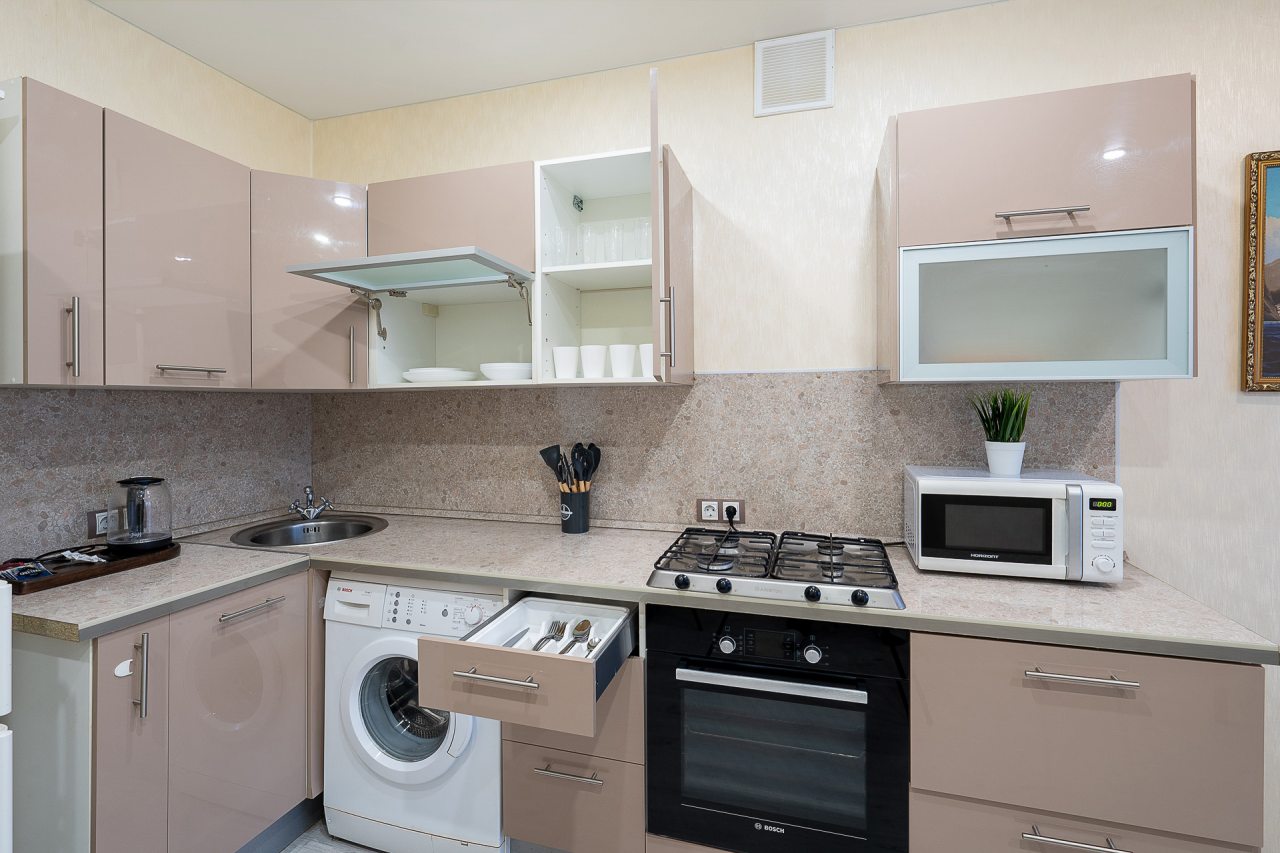 Кухня укомплектована современной бытовой техникой: имеются микроволновая печь, газовая плита, духовой шкаф, чайник, холодильник. Можно приготовить еду дома или пойти на ужин в один из ресторанов неподалеку. В окрестностях работают продуктовые магазины.