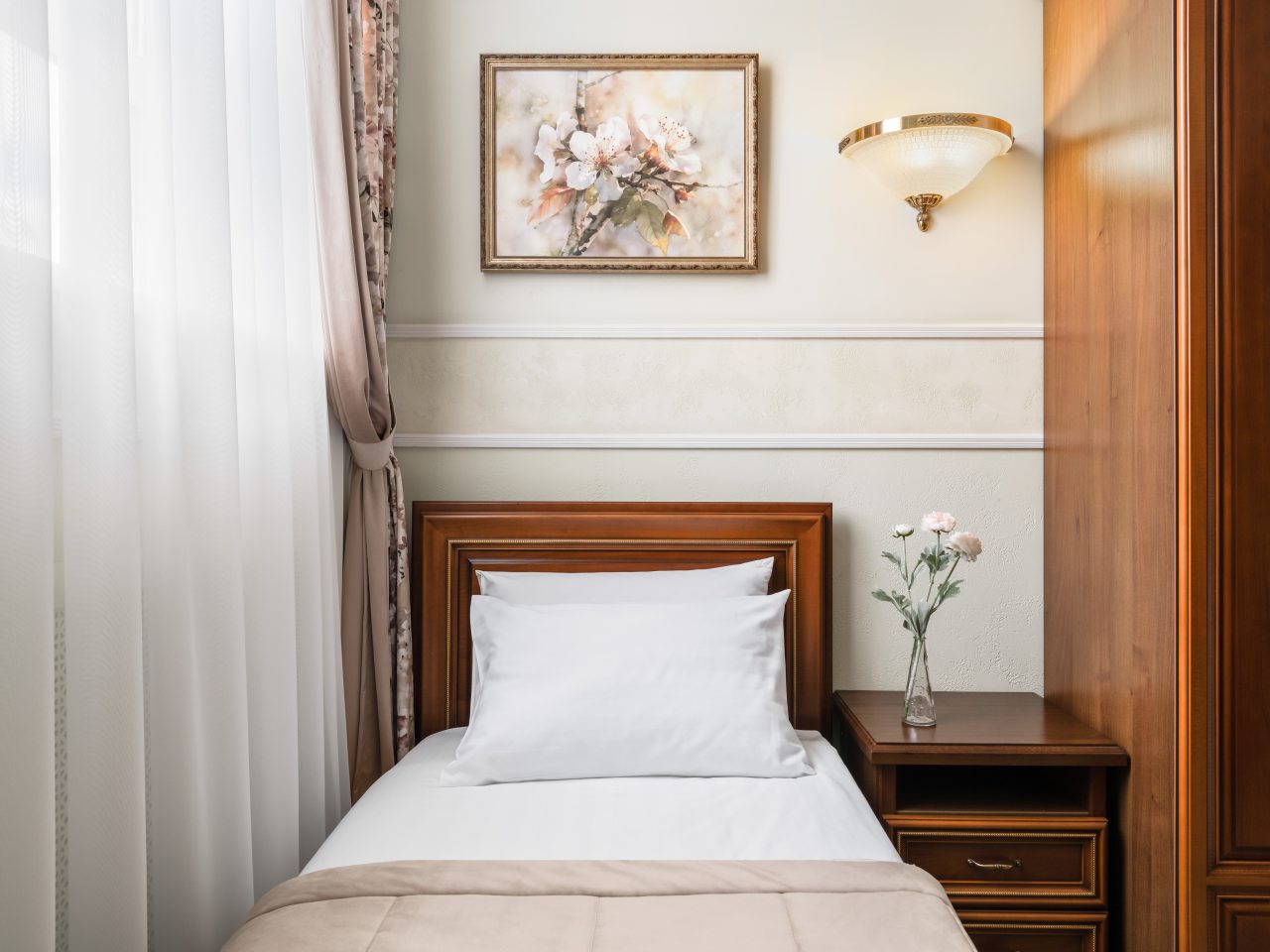 Номер одноместный стандарт. Маленький, но уютный. Чисто. Матрас в меру мягкий. Ежедневно меняли полотенца и набор средств для душа, даже зубные щетки и пасту. Ремонт в номерах хороший, мебель качественная, светильники прекрасные, зеркало как в музее))) Приятный бонус - посещение бассейна. Расположение отличное: в шаговой доступности прекрасный парк, пешком под горочку до Кремля (для жителя СПб - рукой подать, остальным 5 остановок на транспорте). Рядом торговый центр и есть где пообедатьпоужинать. Остановка транспорта близко. Территория тихая, освещенная. Сотрудники внимательные и любезные. Лучшего места для проживания в командировке не найти. На проспекте филармония, драматический театр))) Рекомендую к проживанию тем, кому важно хорошо отдохнуть вечером и ночью)))