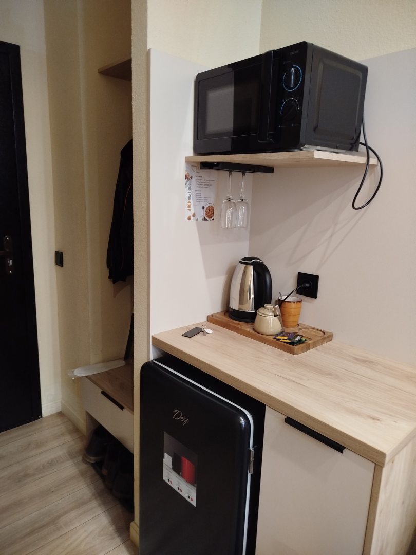 Кухонный уголок оборудован электрическим чайником, микроволновой печью, холодильником и посудой. В двух шагах продуктовые магазины и кафе.