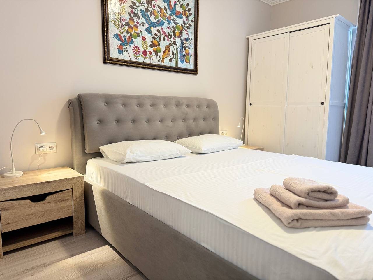 Для гостей подготовлены квартиры разных категорий. Для отдыха предоставляется мягкая кровать с теплым одеялом, также стоит раскладной диван. В распоряжении постояльцев кондиционер, обогреватель и телевизор. Имеются гладильные принадлежности, набор полотенец и постельное белье. Работает бесплатный Wi-Fi. Ванная комната обустроена стиральной машиной, феном и новой сантехникой.