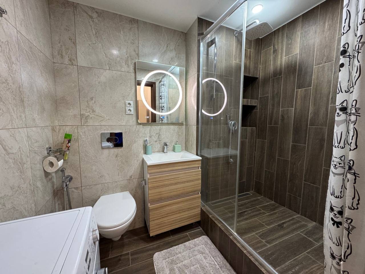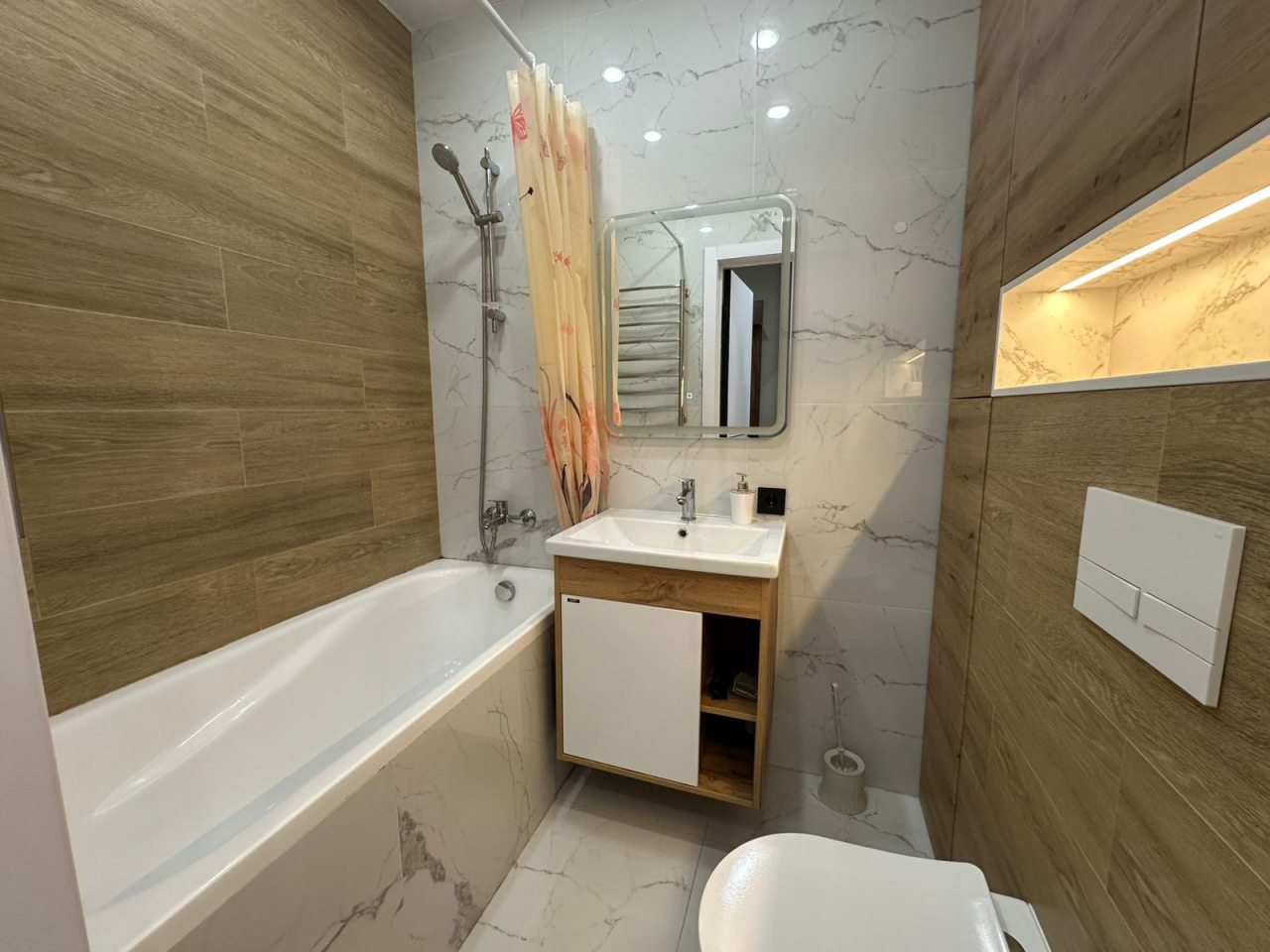 В ванной нет нормальной шторки, которая бы полностью закрыла ванну, чтобы брызги не летели на пол. Также в ванной нет коврика, поэтому вышагиваешь либо на пол (плитка, теплого пола нет), либо в тканевые тапочки, а потом ходишь в мокрых))
