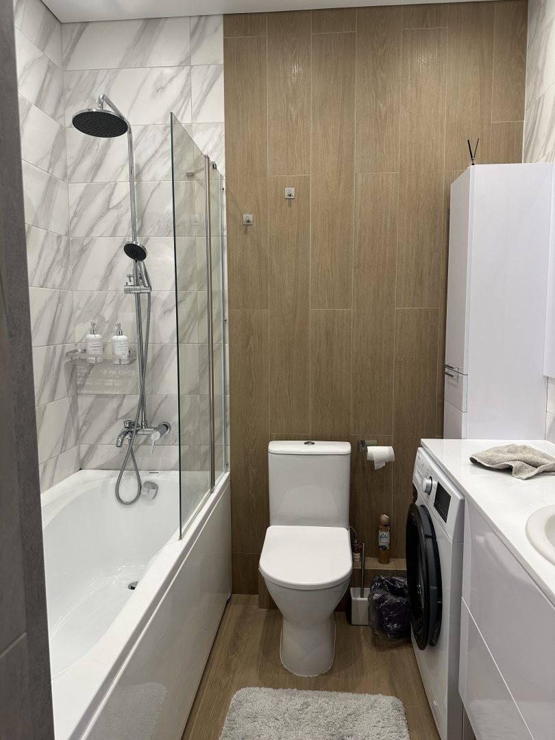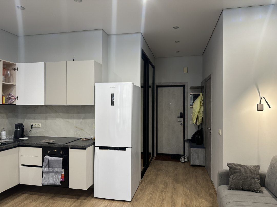 Всё выглядело так, как на фото — стильно и чисто. Район новый и тихий, можно расслабиться. Приятно было найти в холодильнике бутылочку воды — мелочь, но заботливо. Звукоизоляция на высоте, за двое суток не услышали ни звука от соседей. Очень удобно, что рядом кафе и небольшой супермаркет. Заселение прошло гладко.