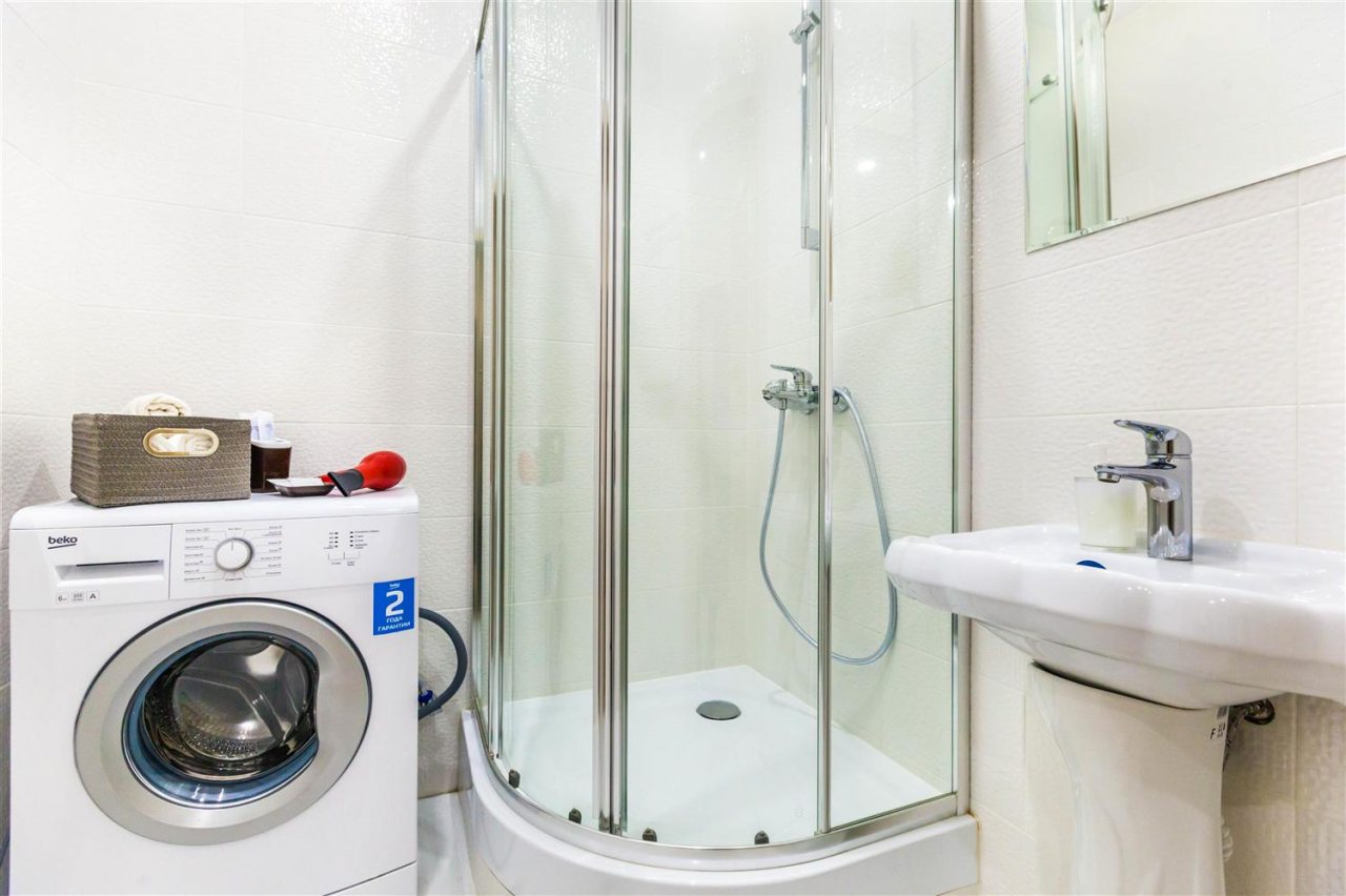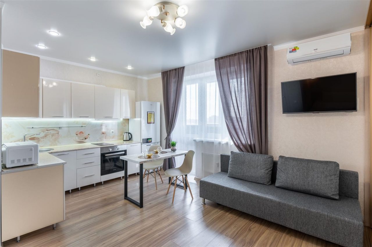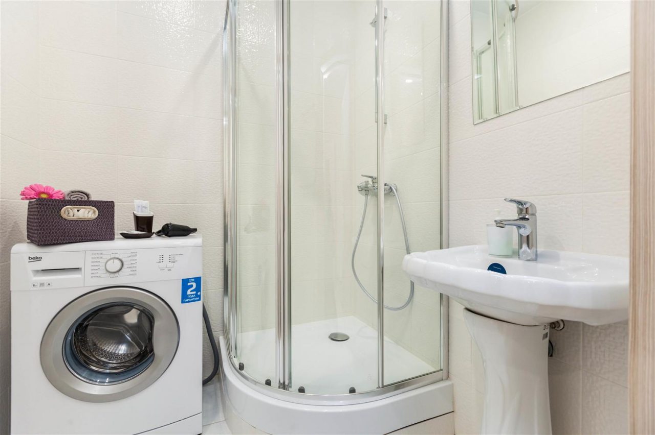 В апартаментах выполнен современный ремонт в светлых классических тонах, установлена комфортабельная мягкая и корпусная мебель. Среди удобств гости смогут воспользоваться Wi-fi и телевизором. Собственная ванная комната оснащена стиральной машиной. Предоставляется набор полотенец.
