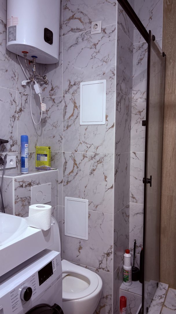 Продуманная планировка и наличие всего необходимого для проживания, включая посуду и стиральную машину. Район спокойный, рядом продуктовый магазин и транспорт.