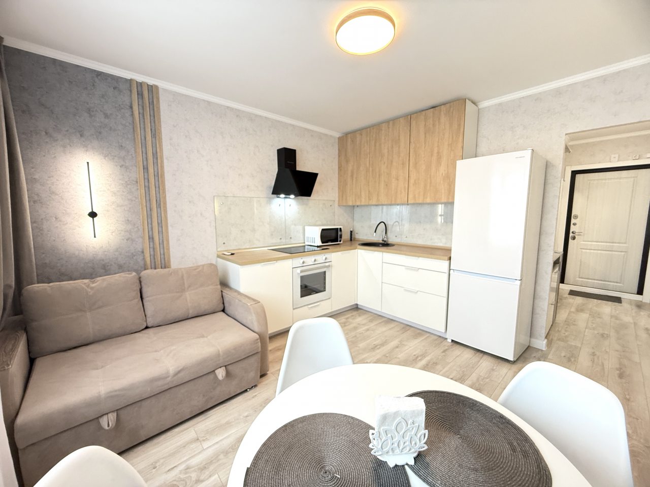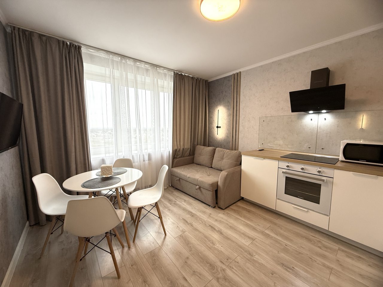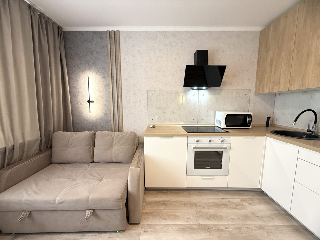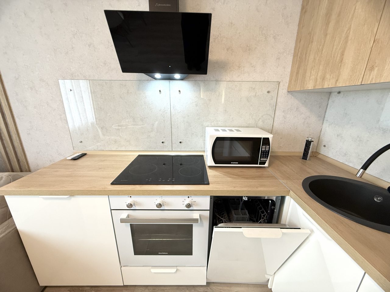 Зона кухни укомплектована обеденной зоной, вытяжкой, плитой, СВЧ-печью, духовым шкафом, чтобы вы могли радовать себя приготовлением любимых блюд.