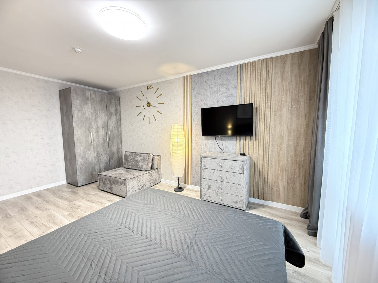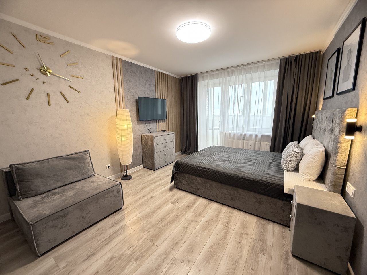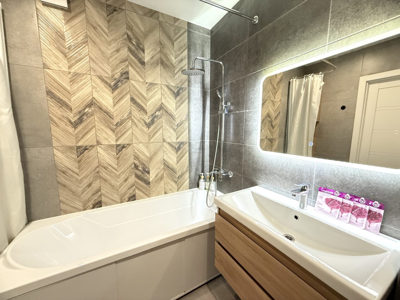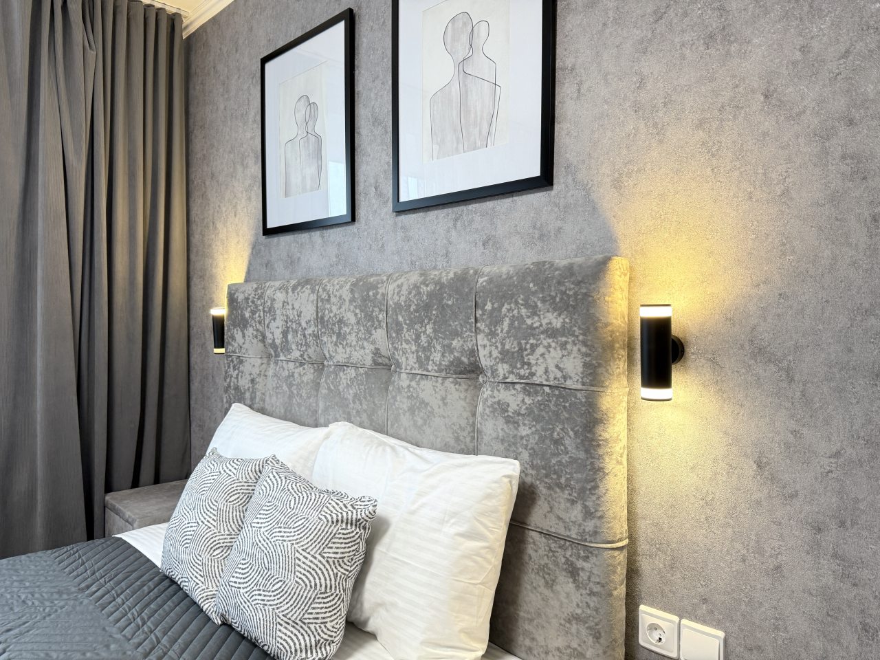 Внутри гостей ожидает кровать с качественным и удобным матрасом, плотные шторы, балкон, настенные бра для уютного вечернего света, телевизор, комод, вместительный шкаф, ванна и стиральная машина.