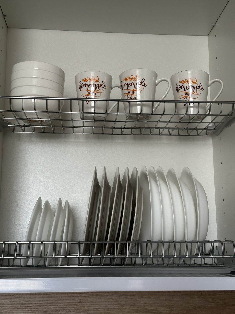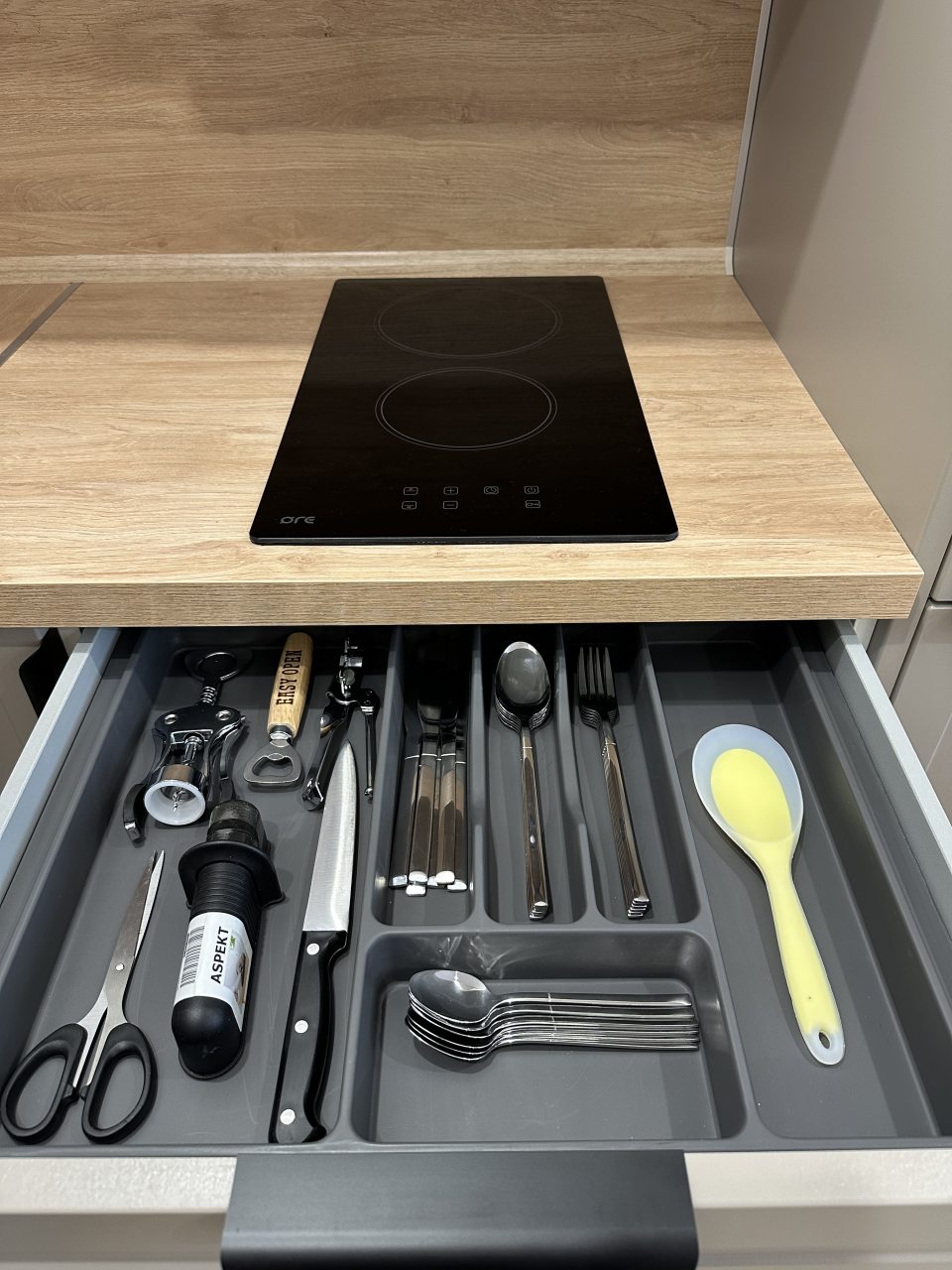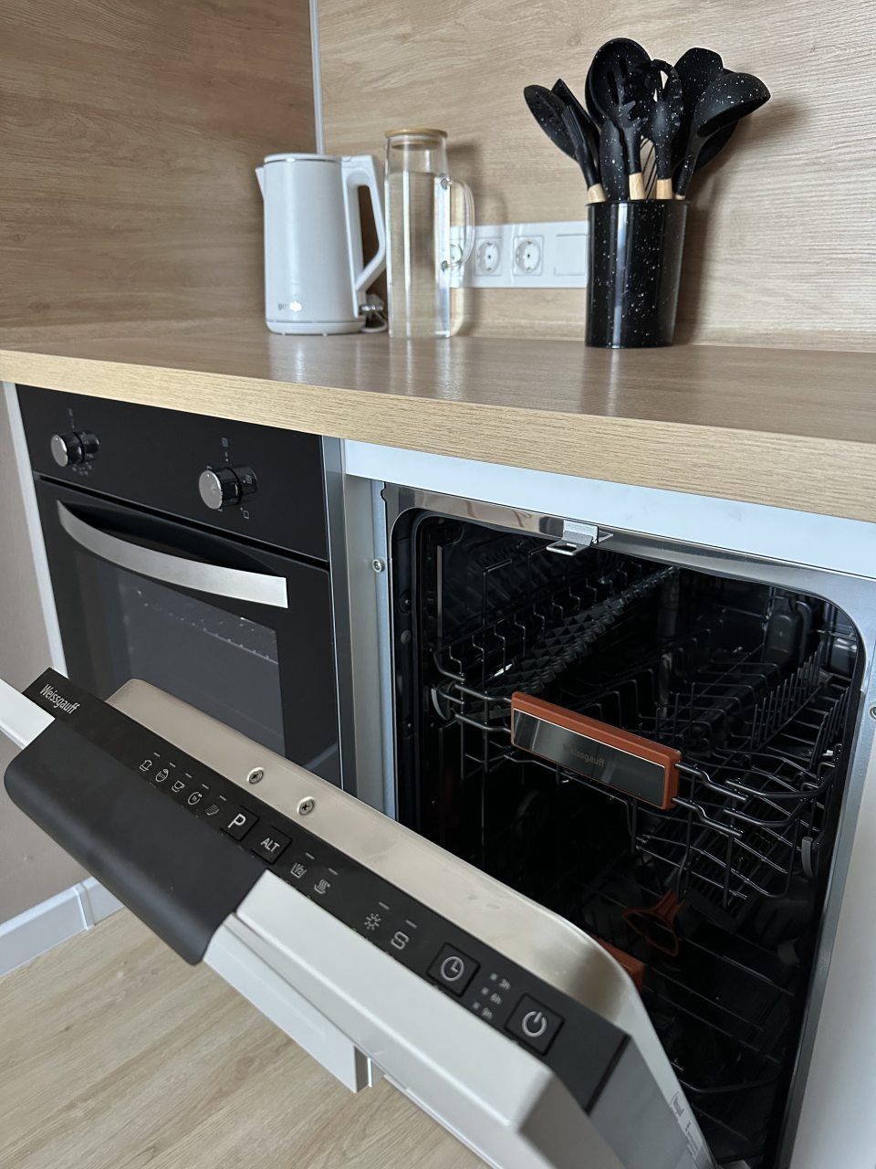 Кухонная зона укомплектована посудой, духовым шкафом, посудомоечной машиной, столовыми приборами, плитой, уютной обеденной зоной.