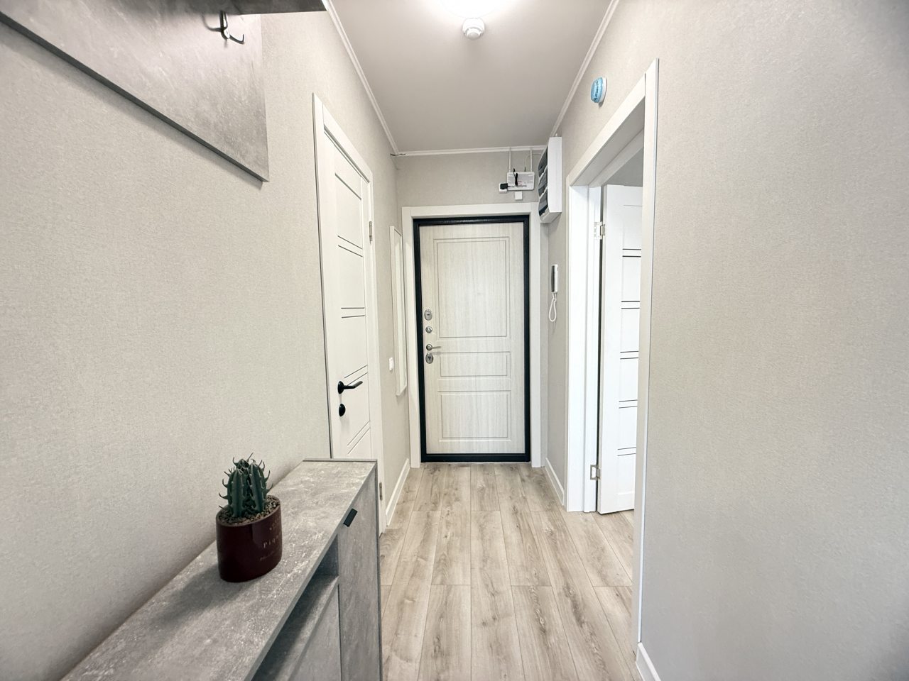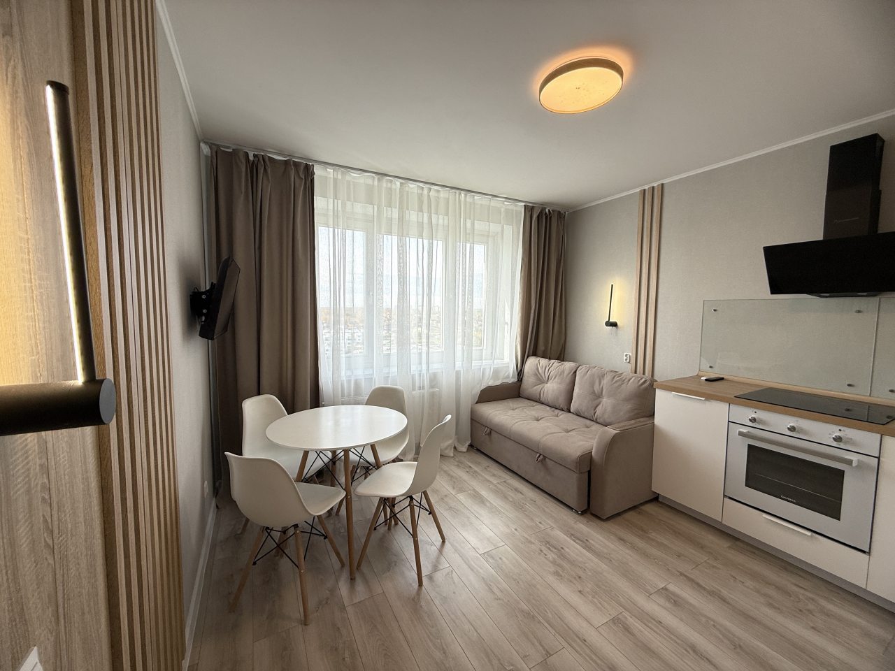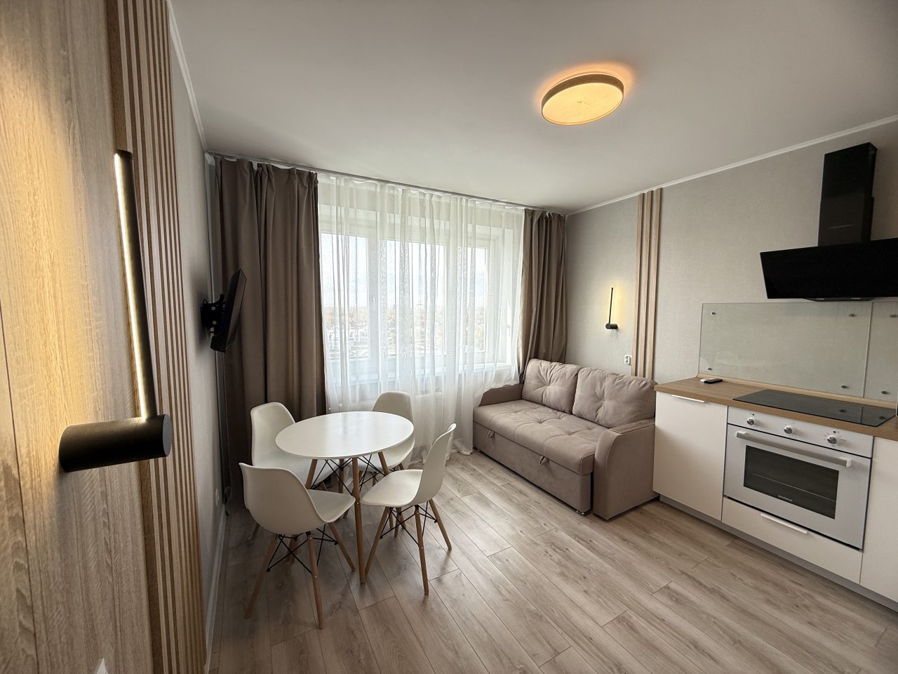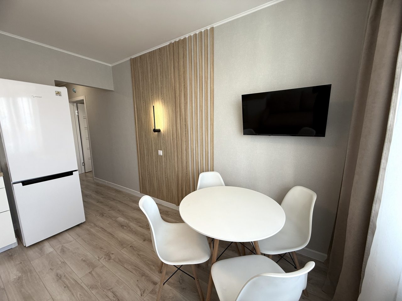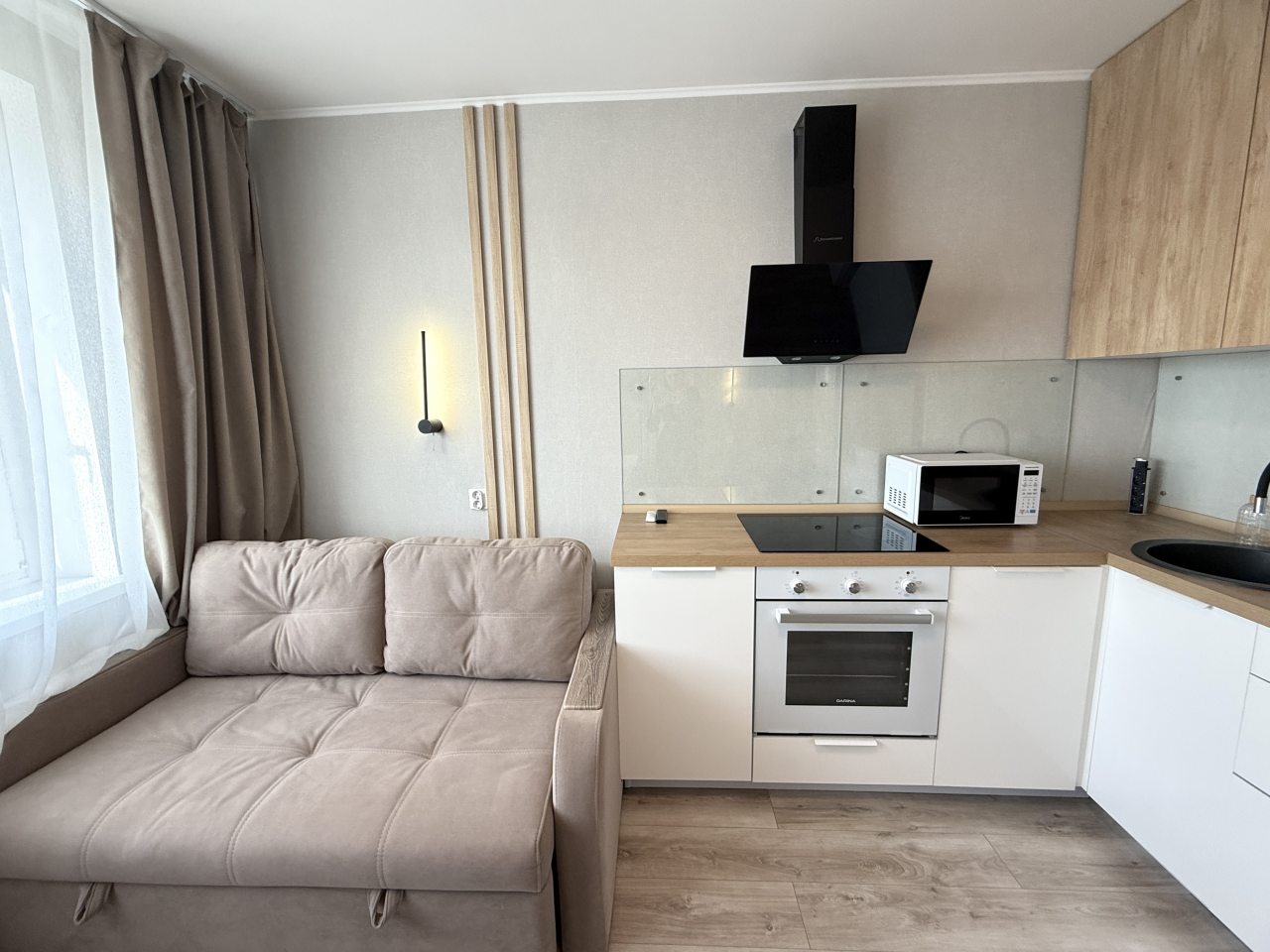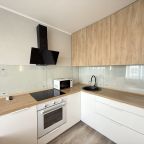 На стильной кухне будет приятно готовить любимые блюда, так как в наличии есть духовой шкаф, СВЧ-печь, варочная панель, холодильник, вытяжка и обеденная зона.