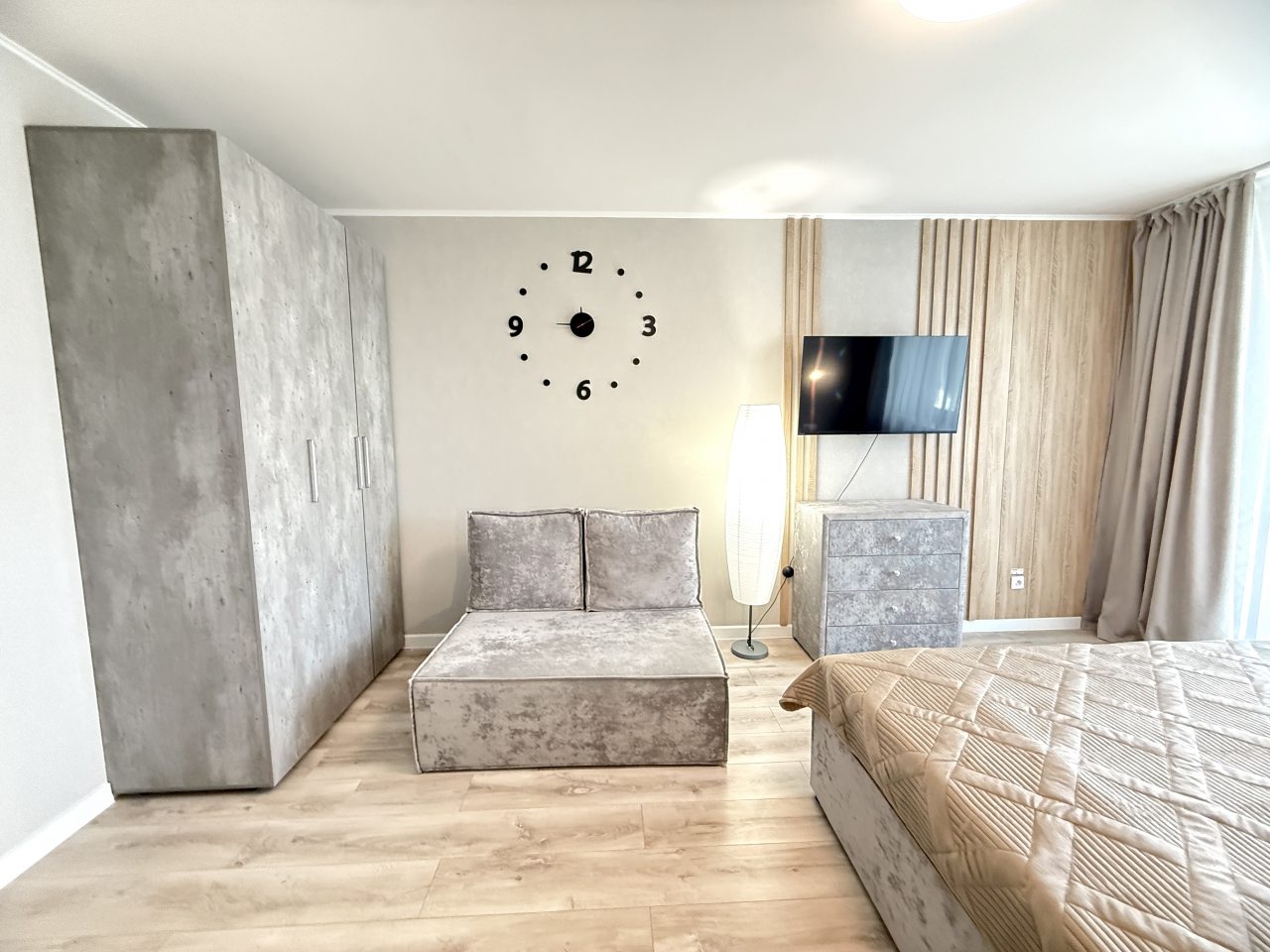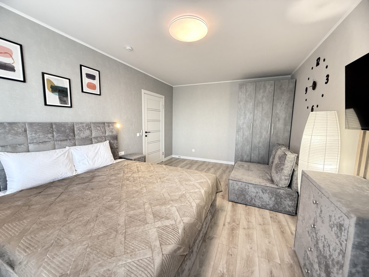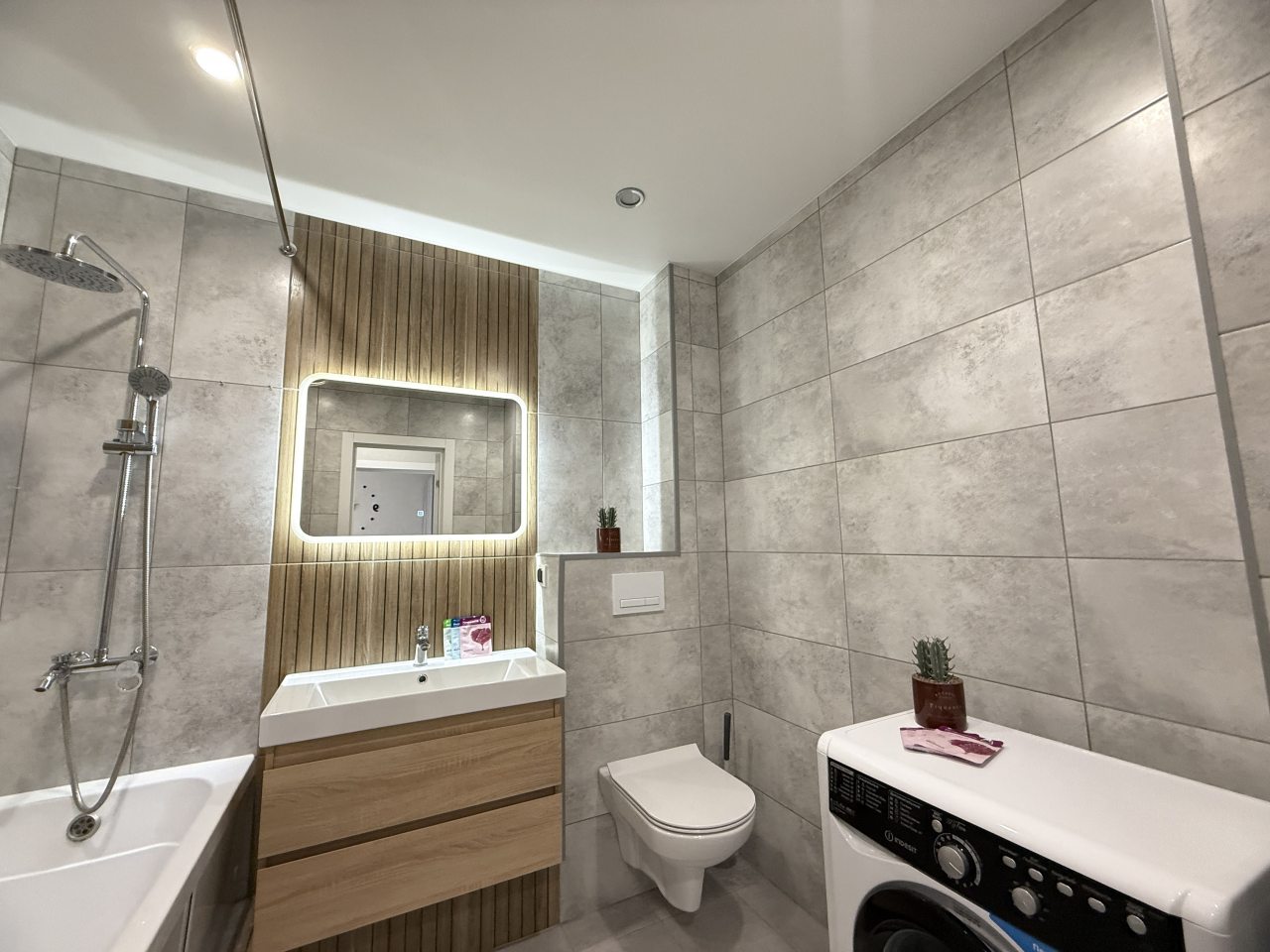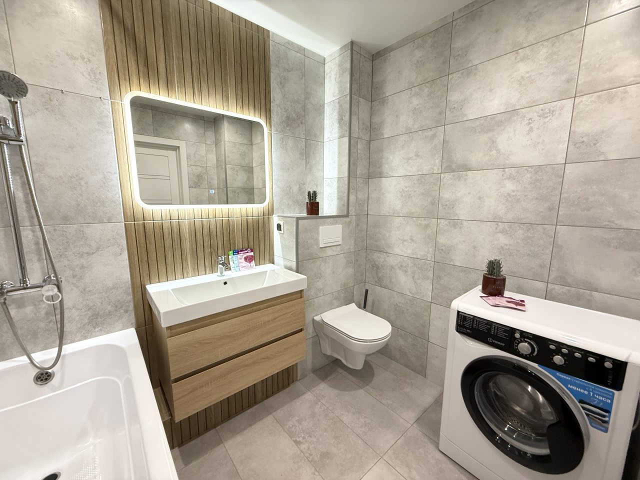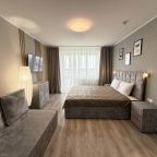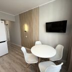 Это прекрасный вариант для размещения семьей или небольшой компанией, так как в наличии как двуспальная кровать с мягким изголовьем, так и удобный диван, а также вместительный шкаф, комод, телевизор, полноценная ванна, стиральная машина и туалетно-косметические принадлежности.
