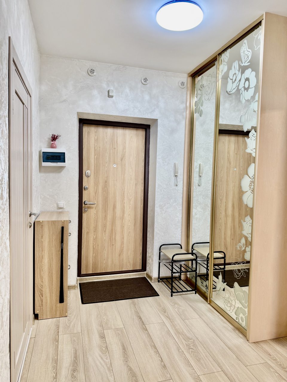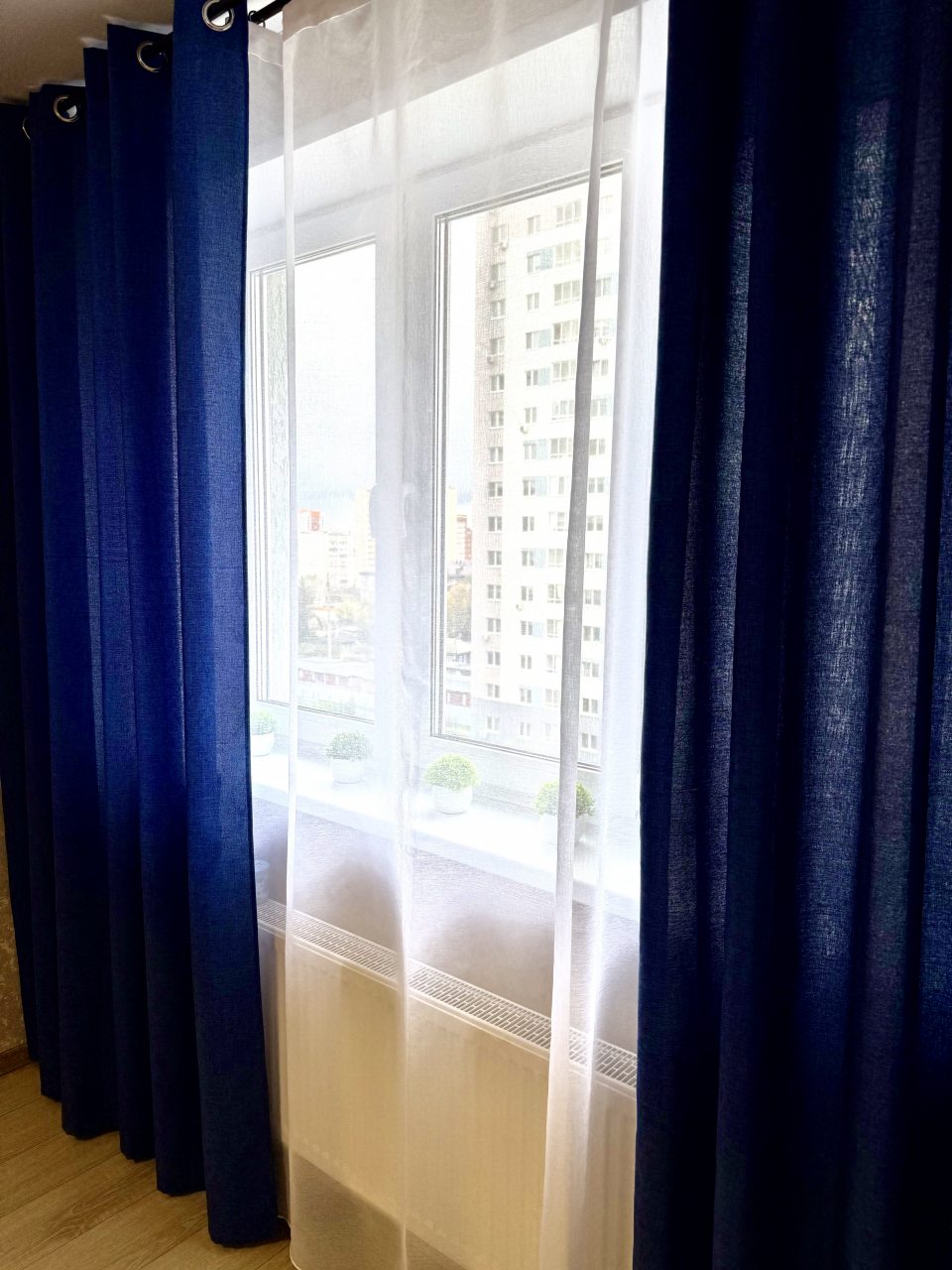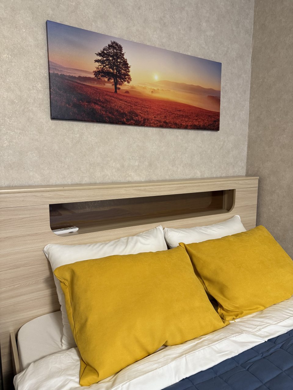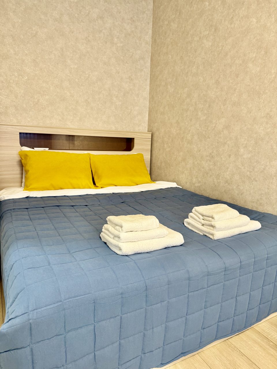 Внутри гостей ожидает удобная двуспальная кровать, телевидение, комплект полотенец, затемненные шторы для качественного сна, шкаф-купе с зеркалом, санузел со стиральной машиной, уютный балкон с панорамными окнами.