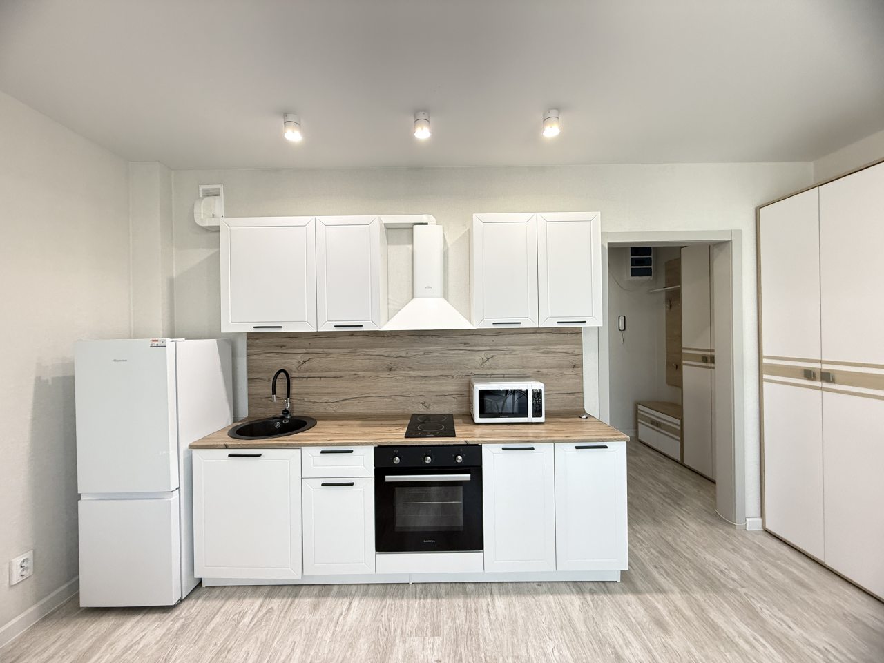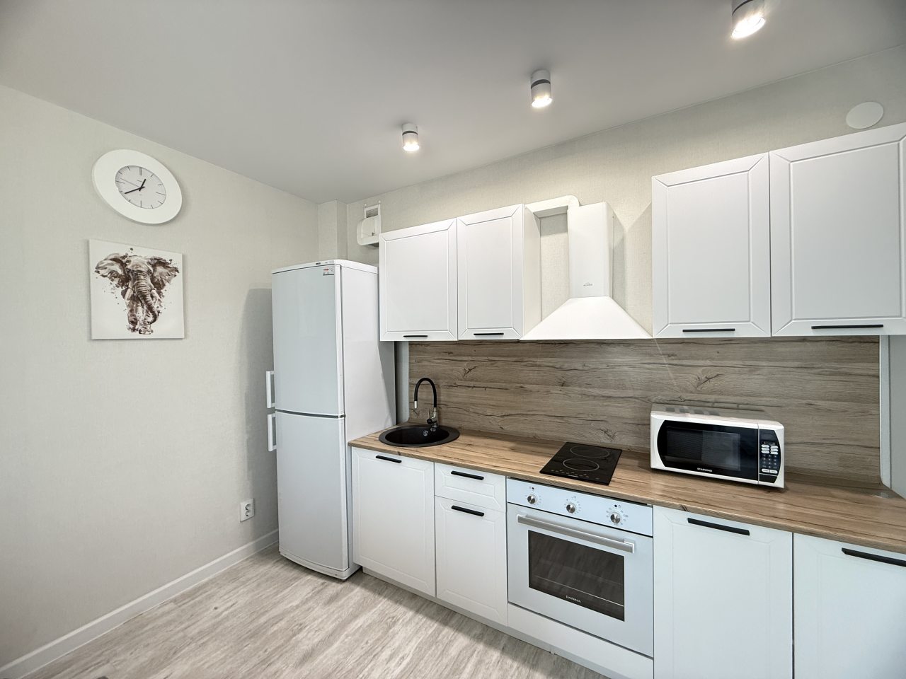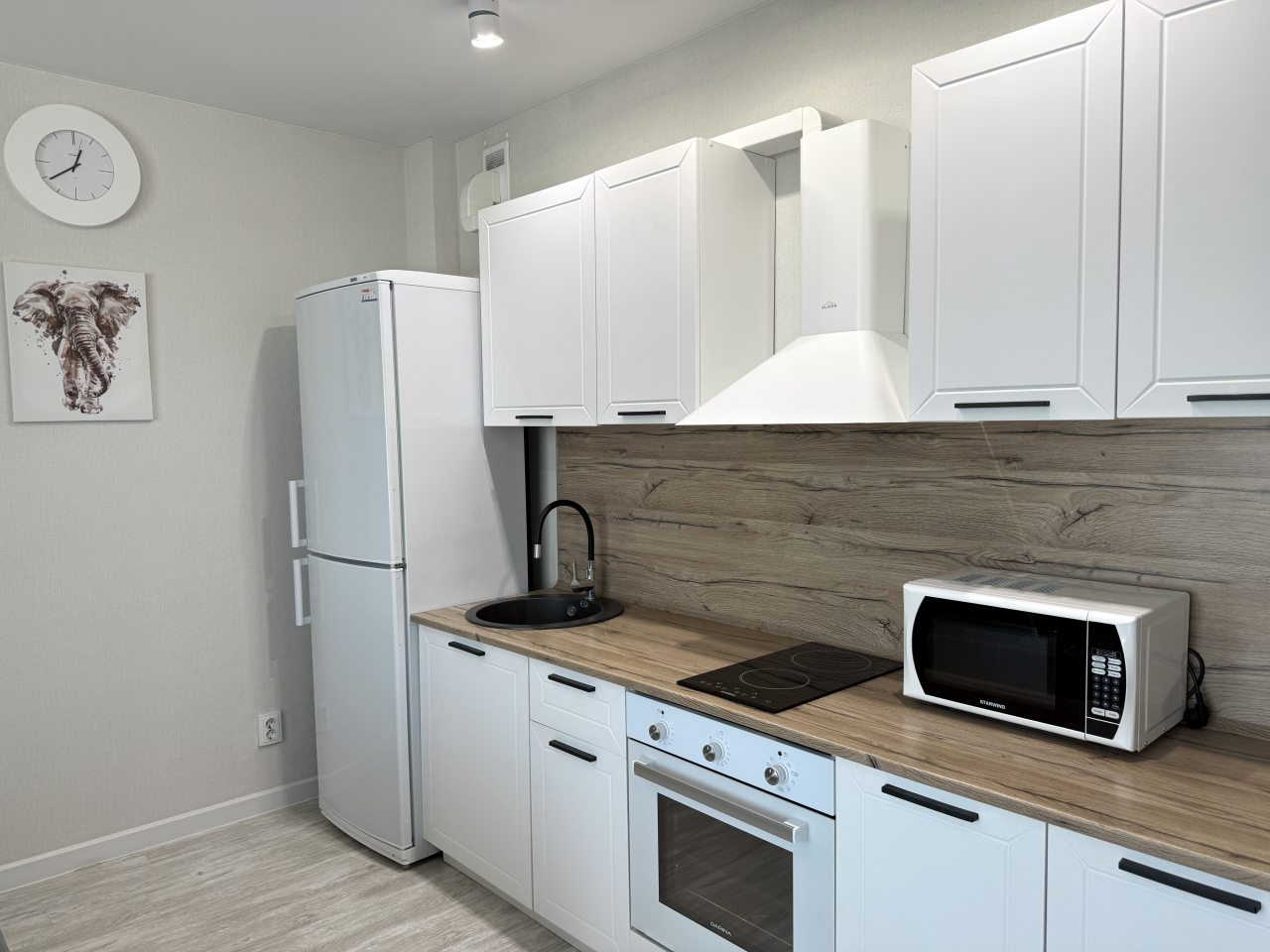 На кухне есть всё необходимое для приготовления еды и напитков, в том числе варочная панель, СВЧ-печь, холодильник и духовой шкаф.