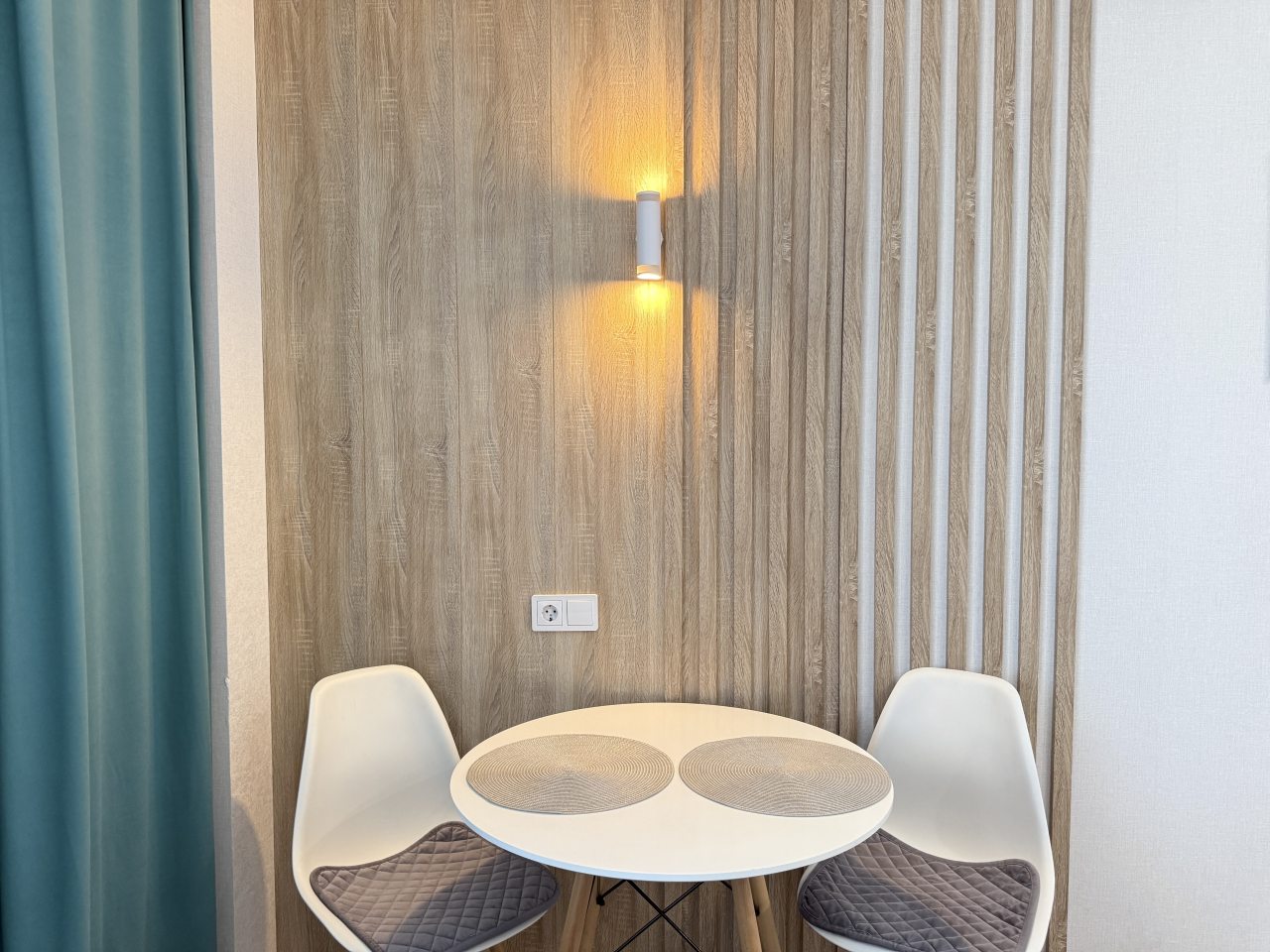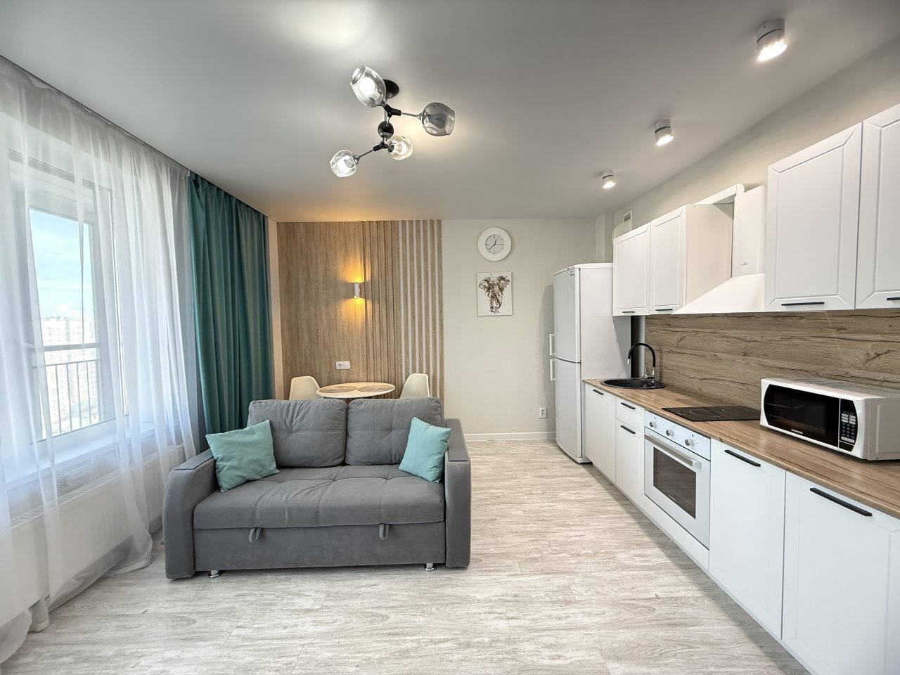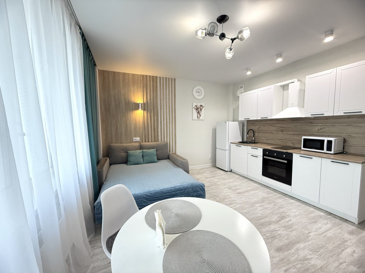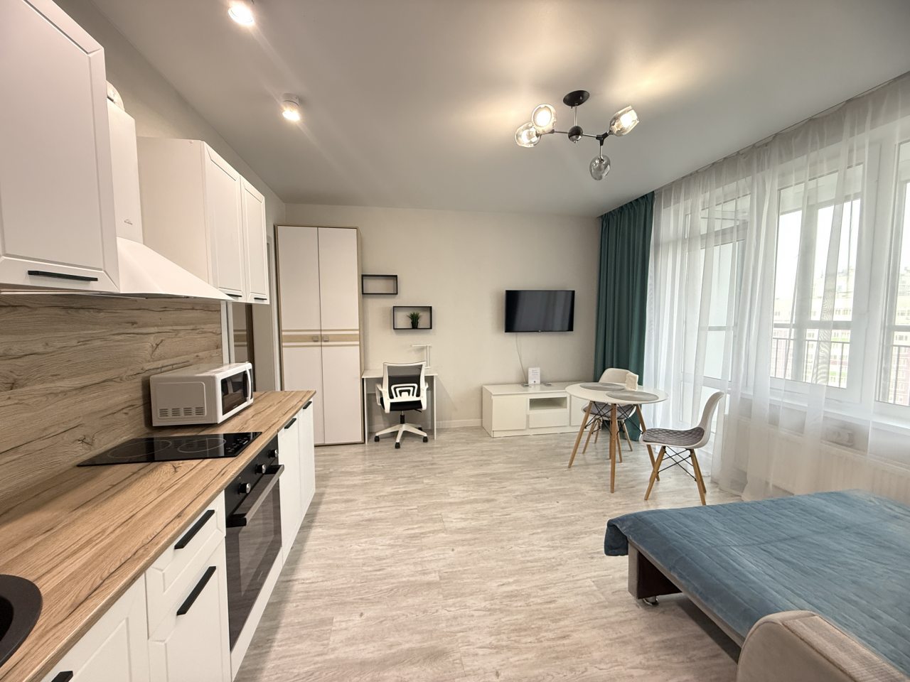 На кухне есть всё необходимое для приготовления еды и напитков, в том числе варочная панель, СВЧ-печь, холодильник и духовой шкаф.