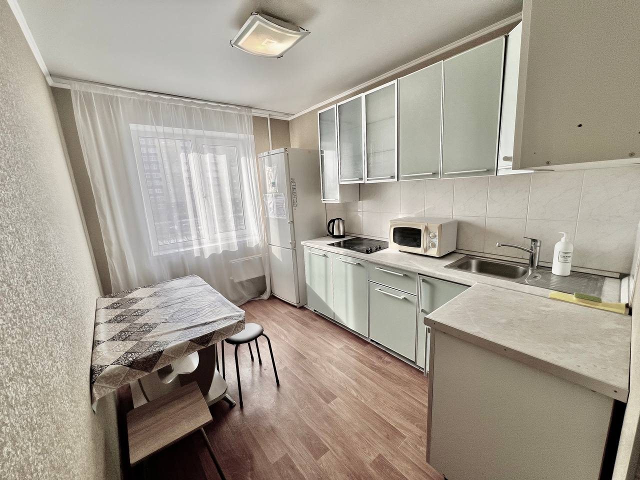 На кухне есть варочная панель, холодильник, чайник, микроволновая печь, посуда. В шаговой доступности есть заведения быстрого питания, кафе и магазины.