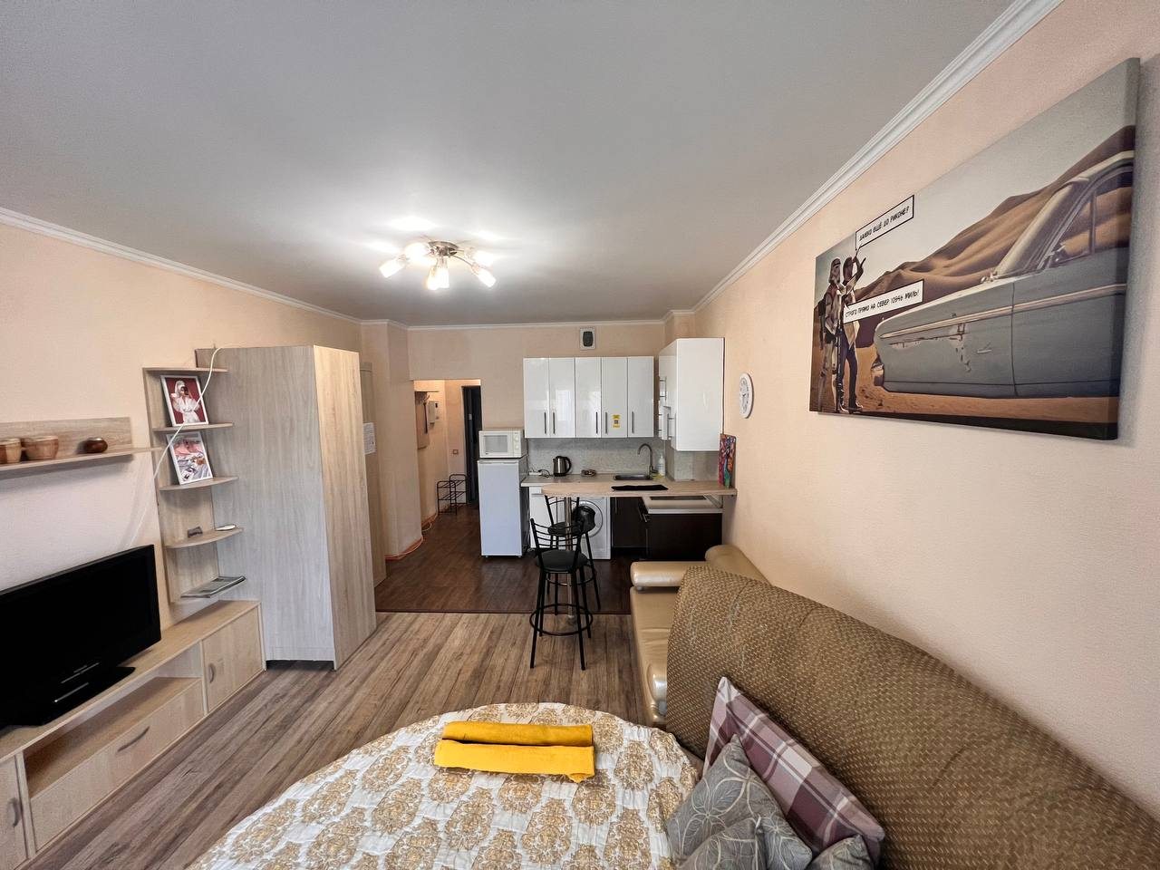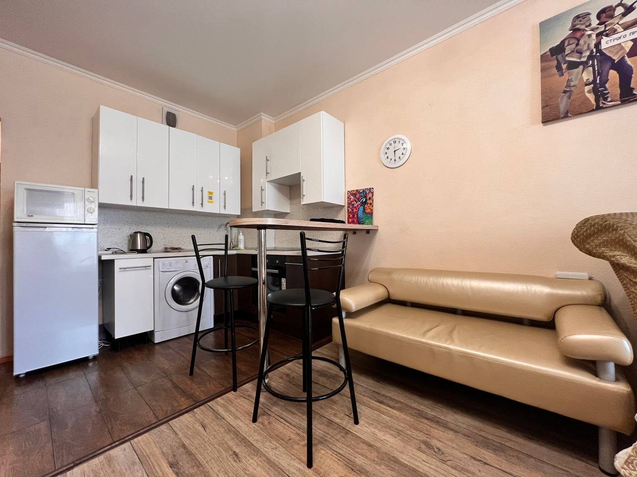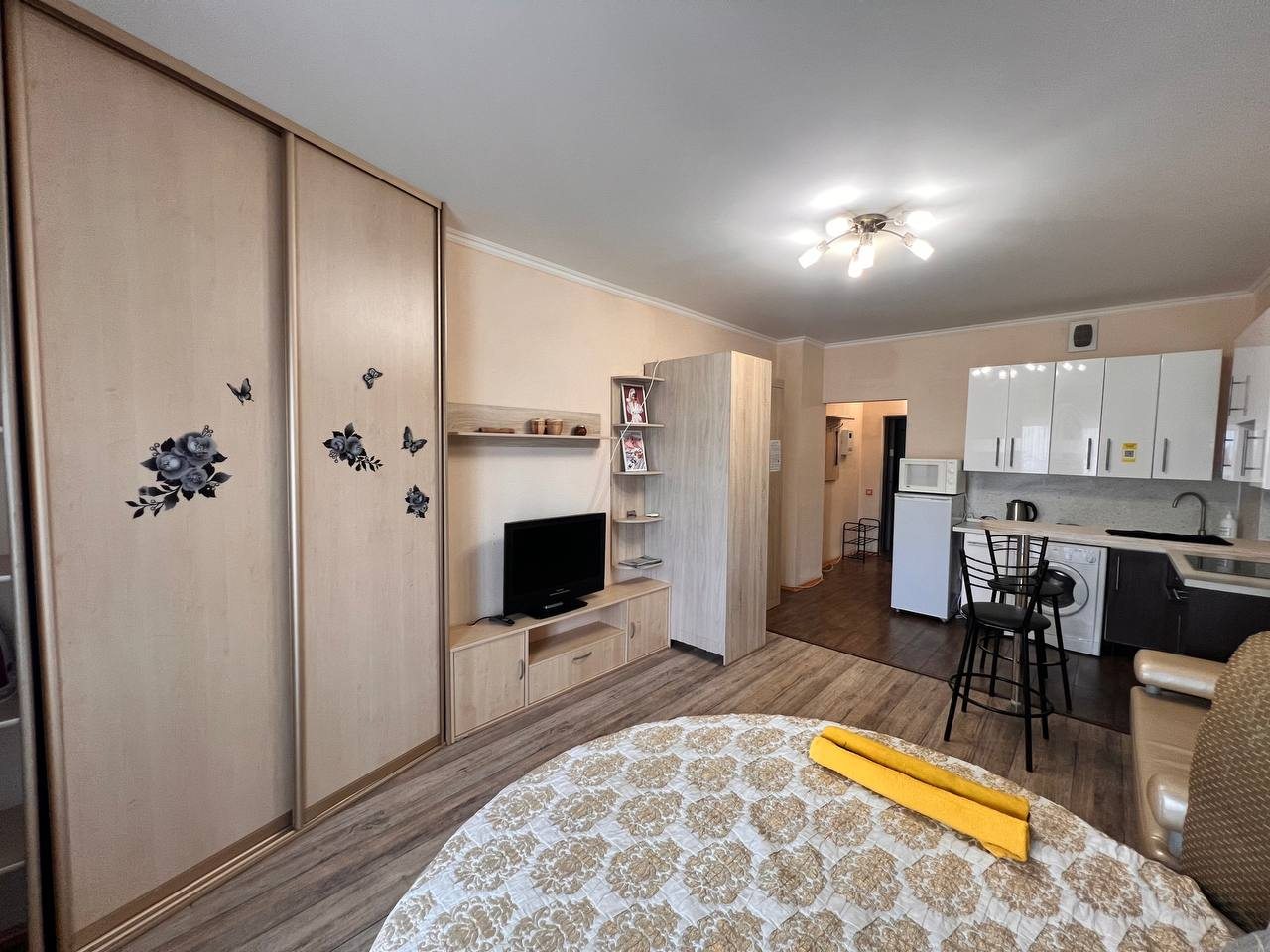 Квартира имеет современный и стильный дизайн, предлагая комфортное проживание. Для гостей доступны: удобное спальное место, диван, телевизор и ванная комната с качественной сантехникой. Апартаменты полностью оборудованы для долгосрочного проживания.