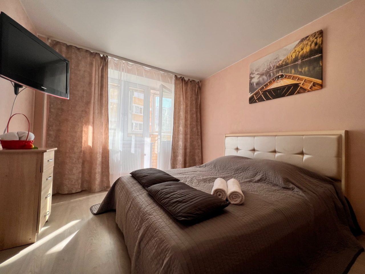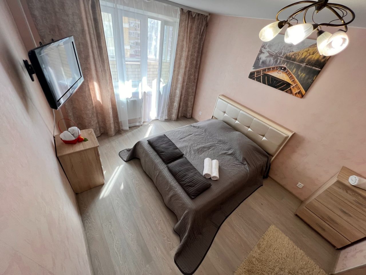 В квартире имеется стандартный набор мебели и техники. На двуспальной кровати будет удобно смотреть телевизор, также отдых возможен на мягком диване. В доступе у постояльцев бесплатный интернет, а также гладильные и гигиенические принадлежности.