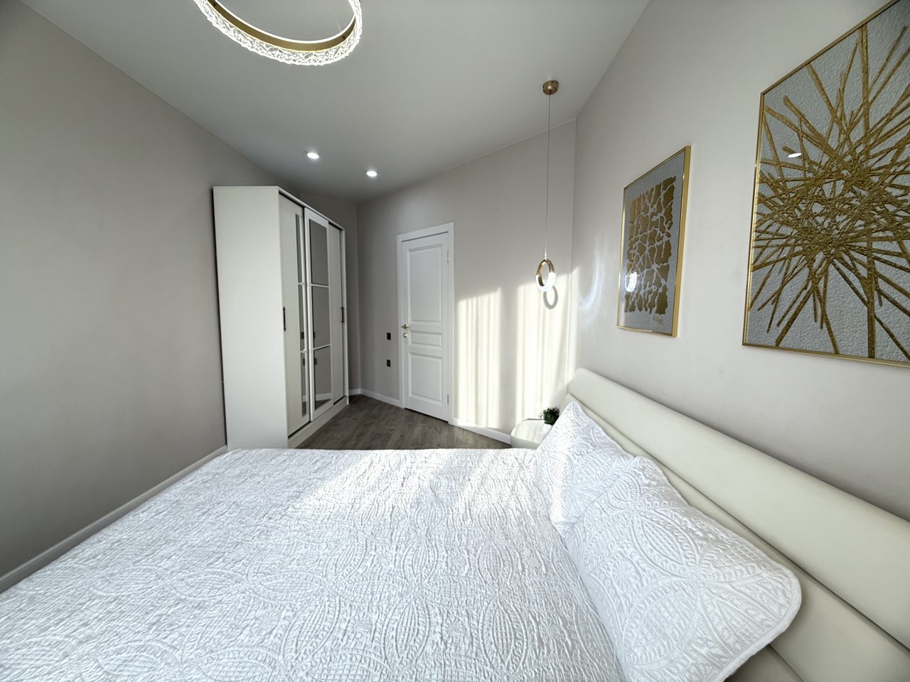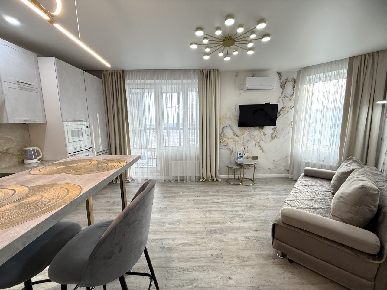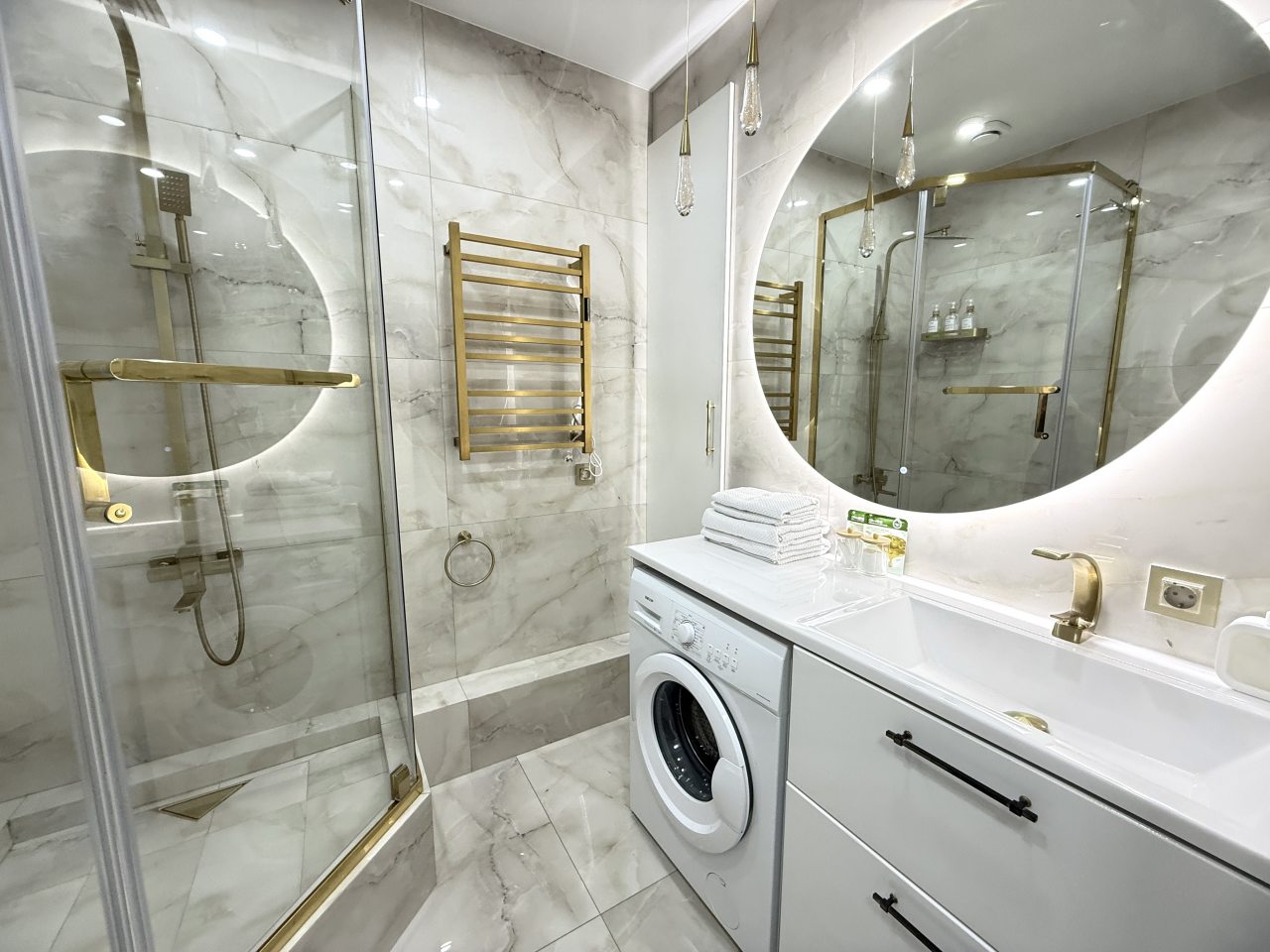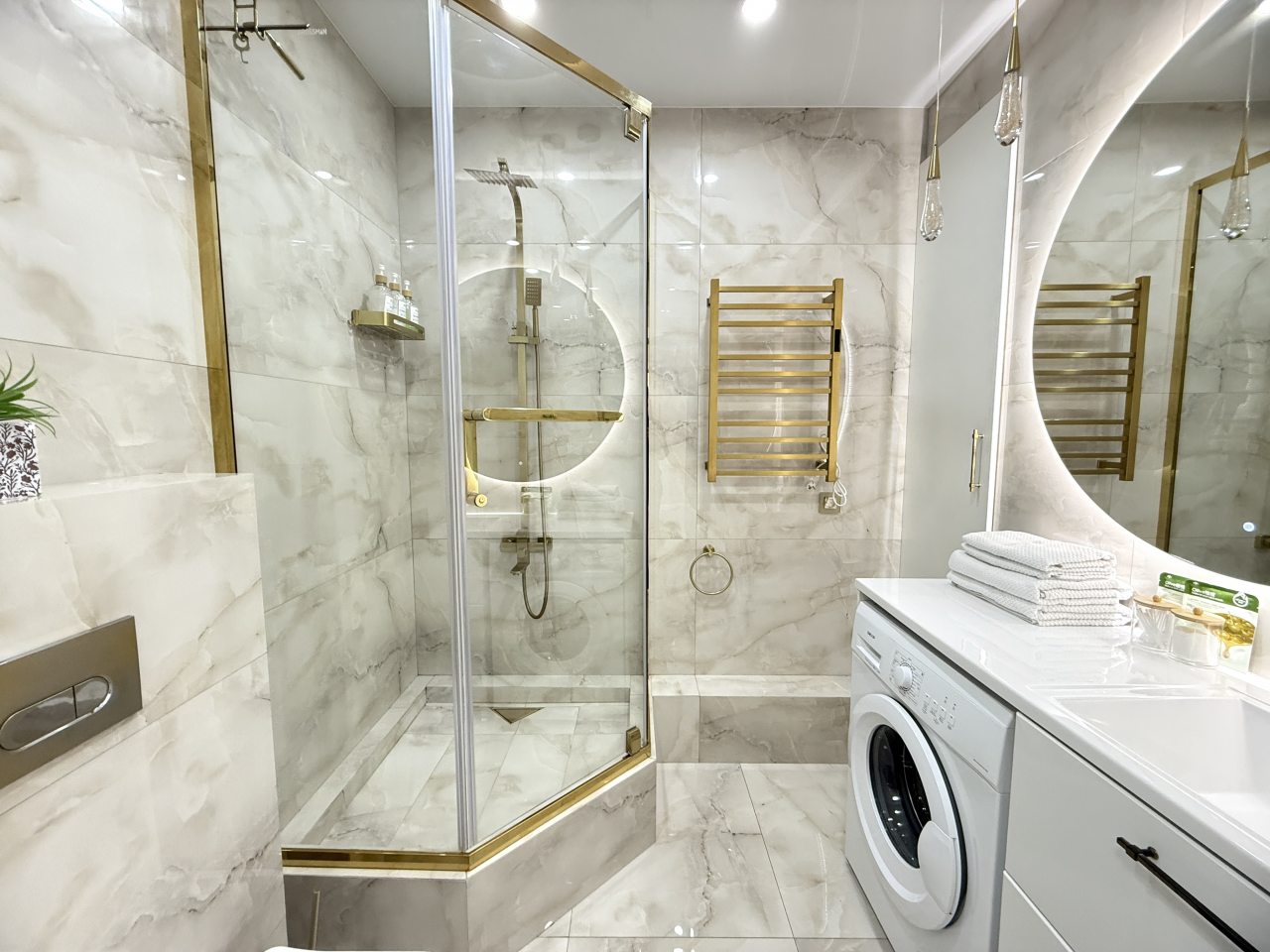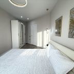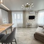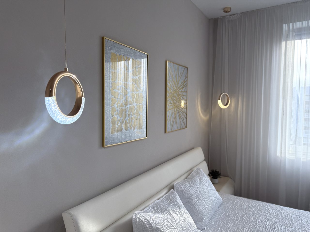 Внутри гостей ожидает удобная для сна двуспальная кровать, мягкий диван с телевизором, различные сценарии освещения, стиральная машина, санузел с душевой, шкаф с зеркалом в полный рост, набор полотенец и средств для личной гигиены, а также лоджия с панорамным остеклением.