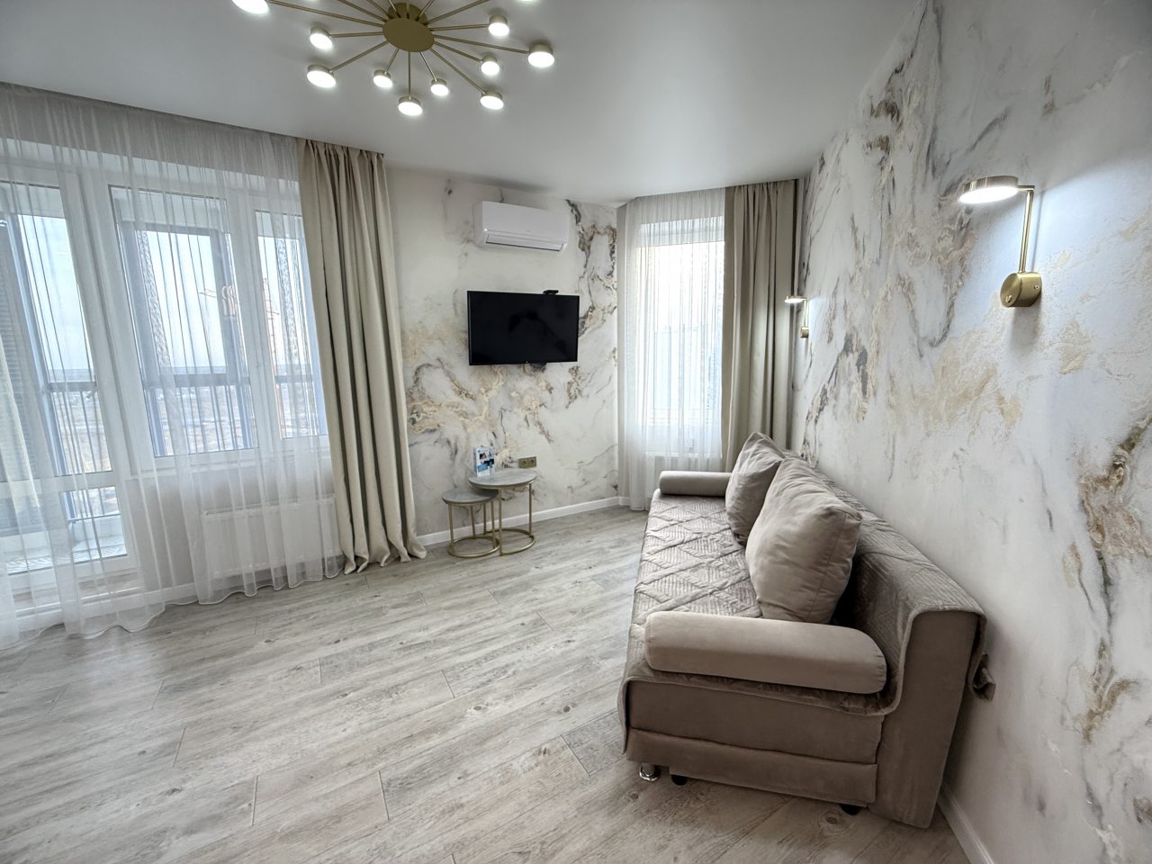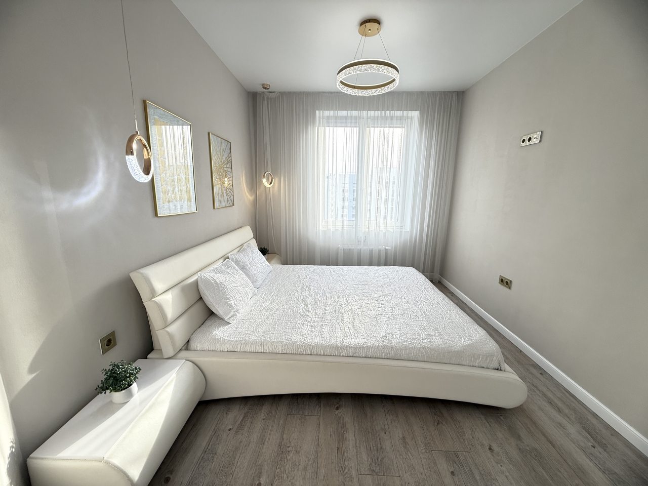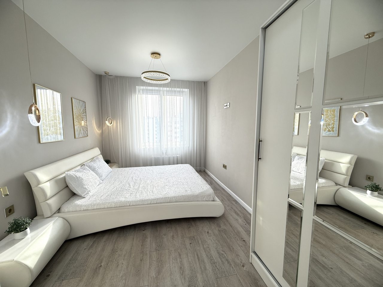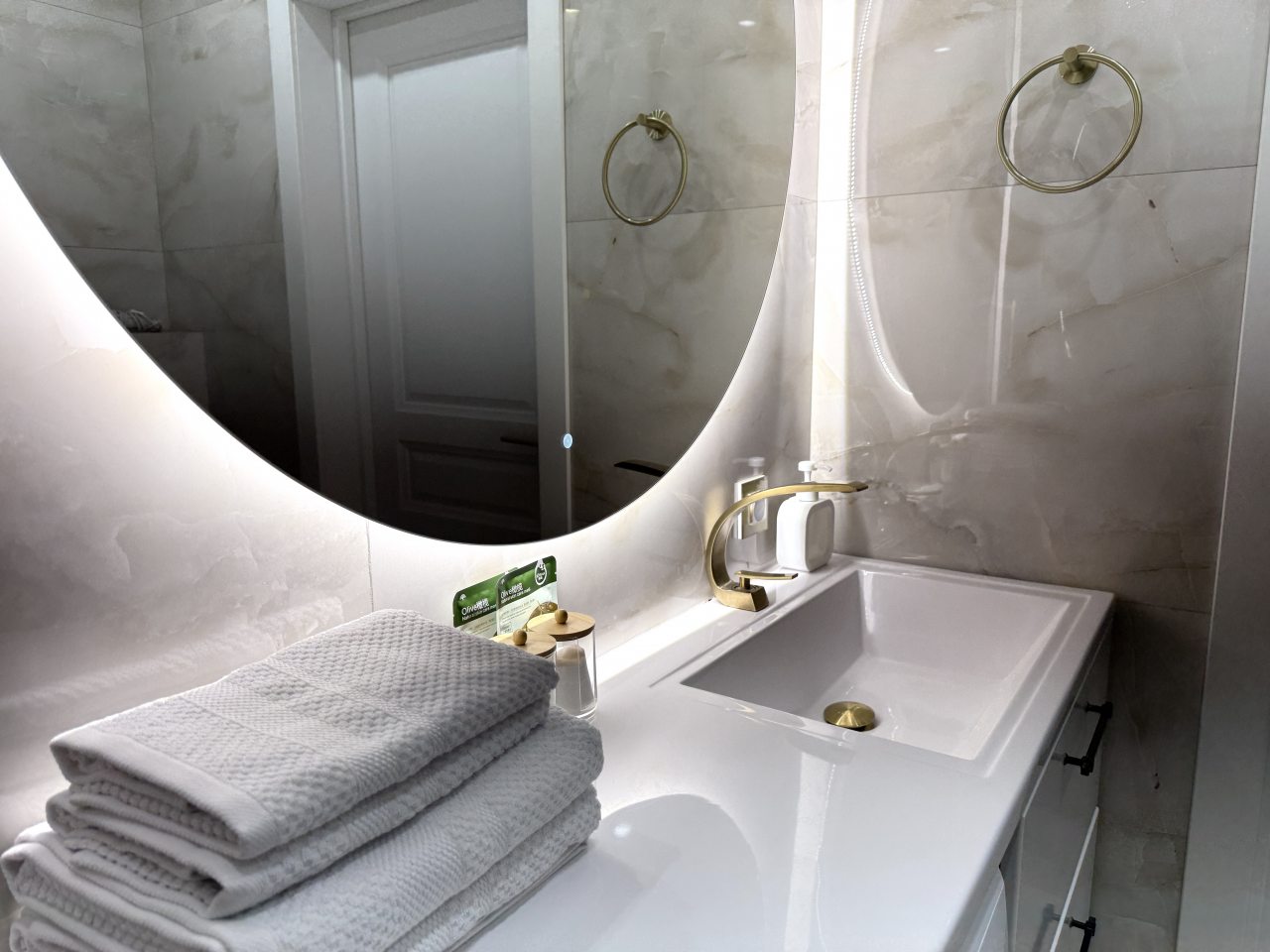 Внутри гостей ожидает удобная для сна двуспальная кровать, мягкий диван с телевизором, различные сценарии освещения, стиральная машина, санузел с душевой, шкаф с зеркалом в полный рост, набор полотенец и средств для личной гигиены, а также лоджия с панорамным остеклением.