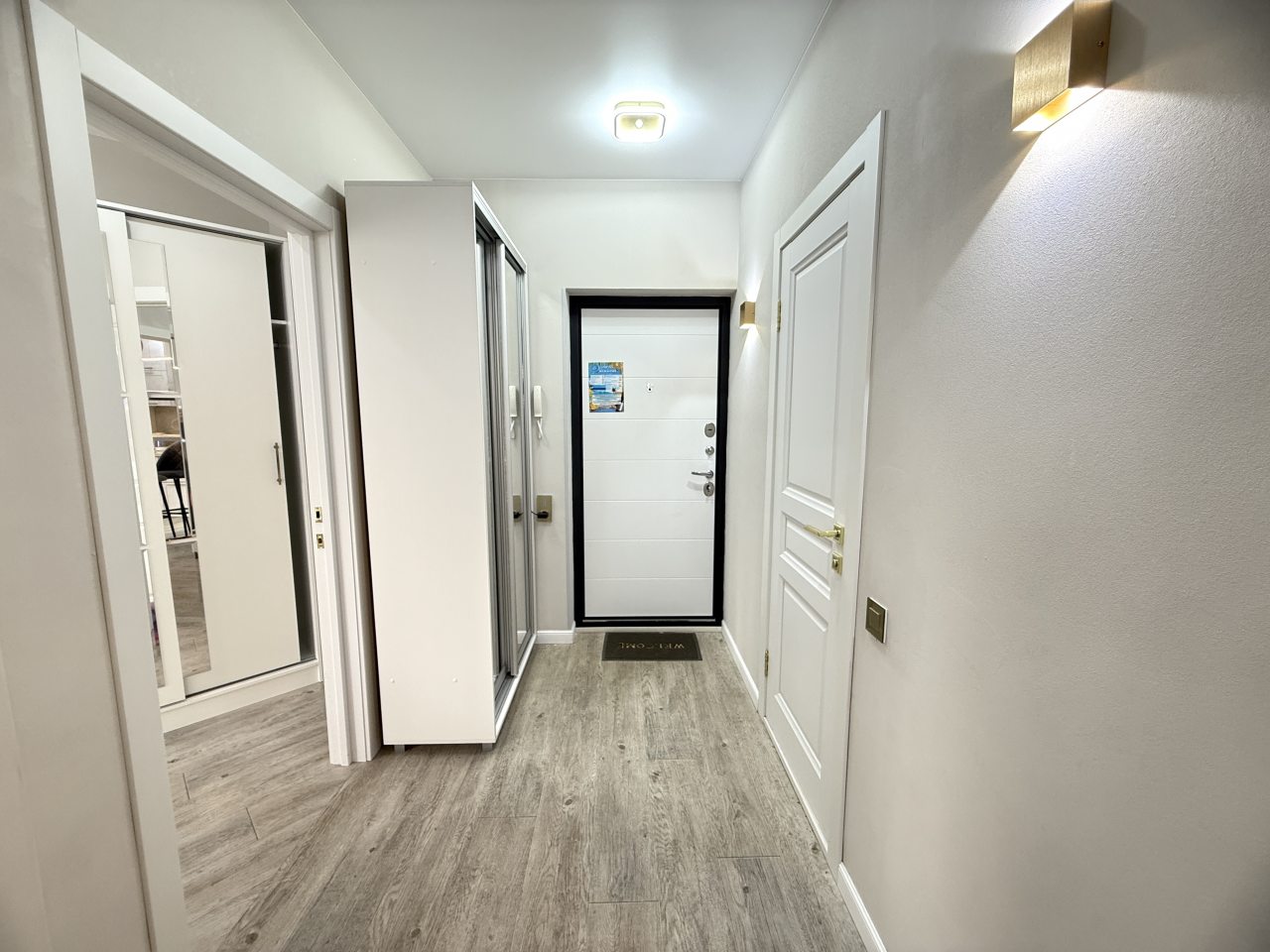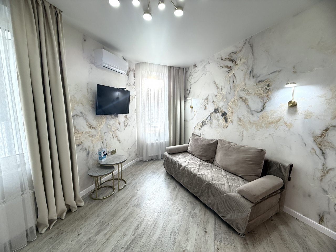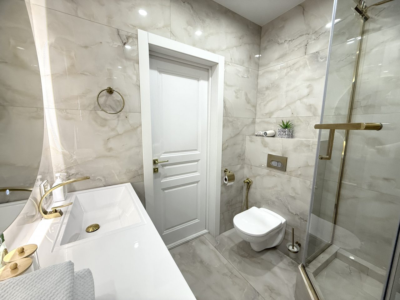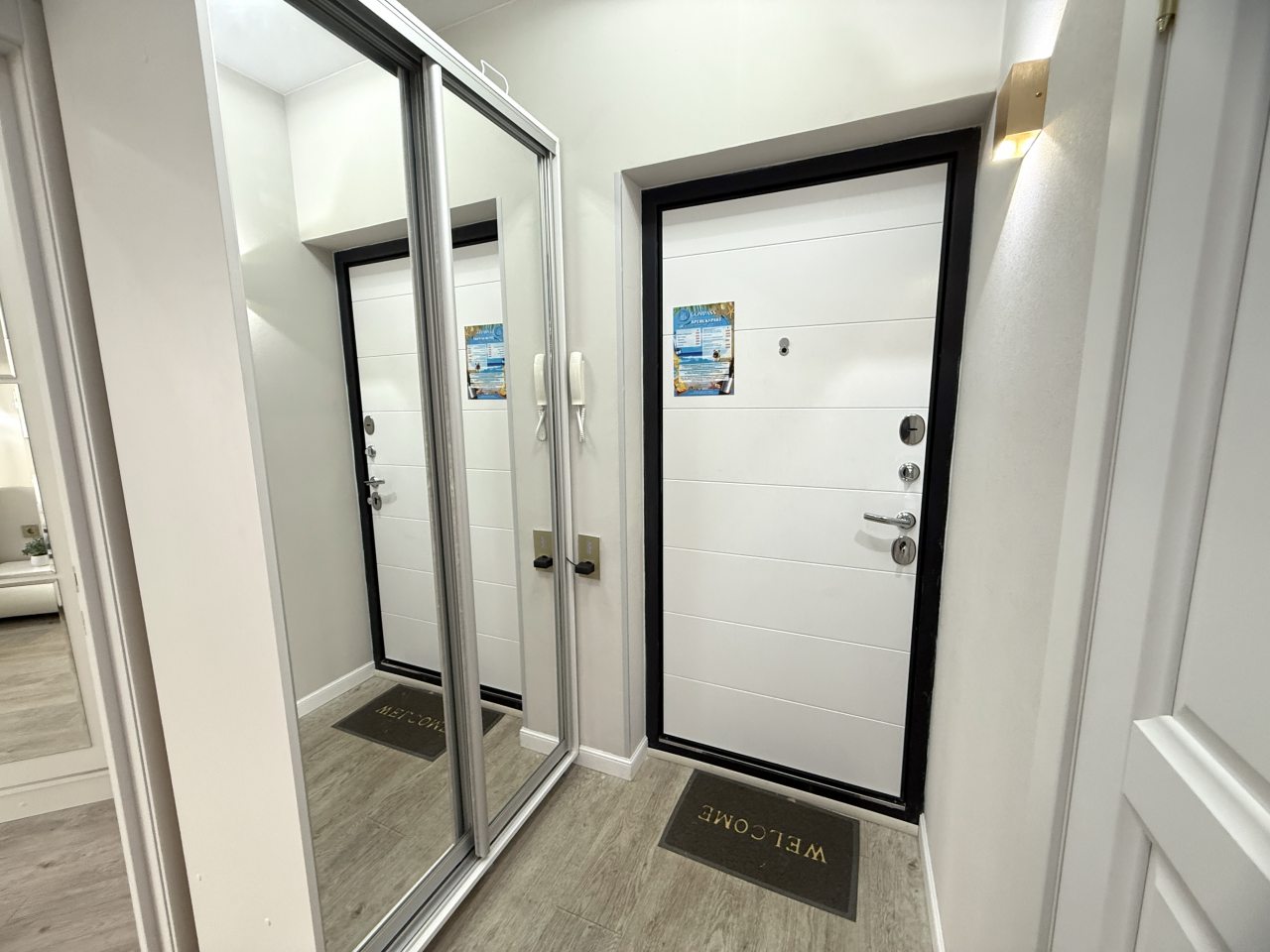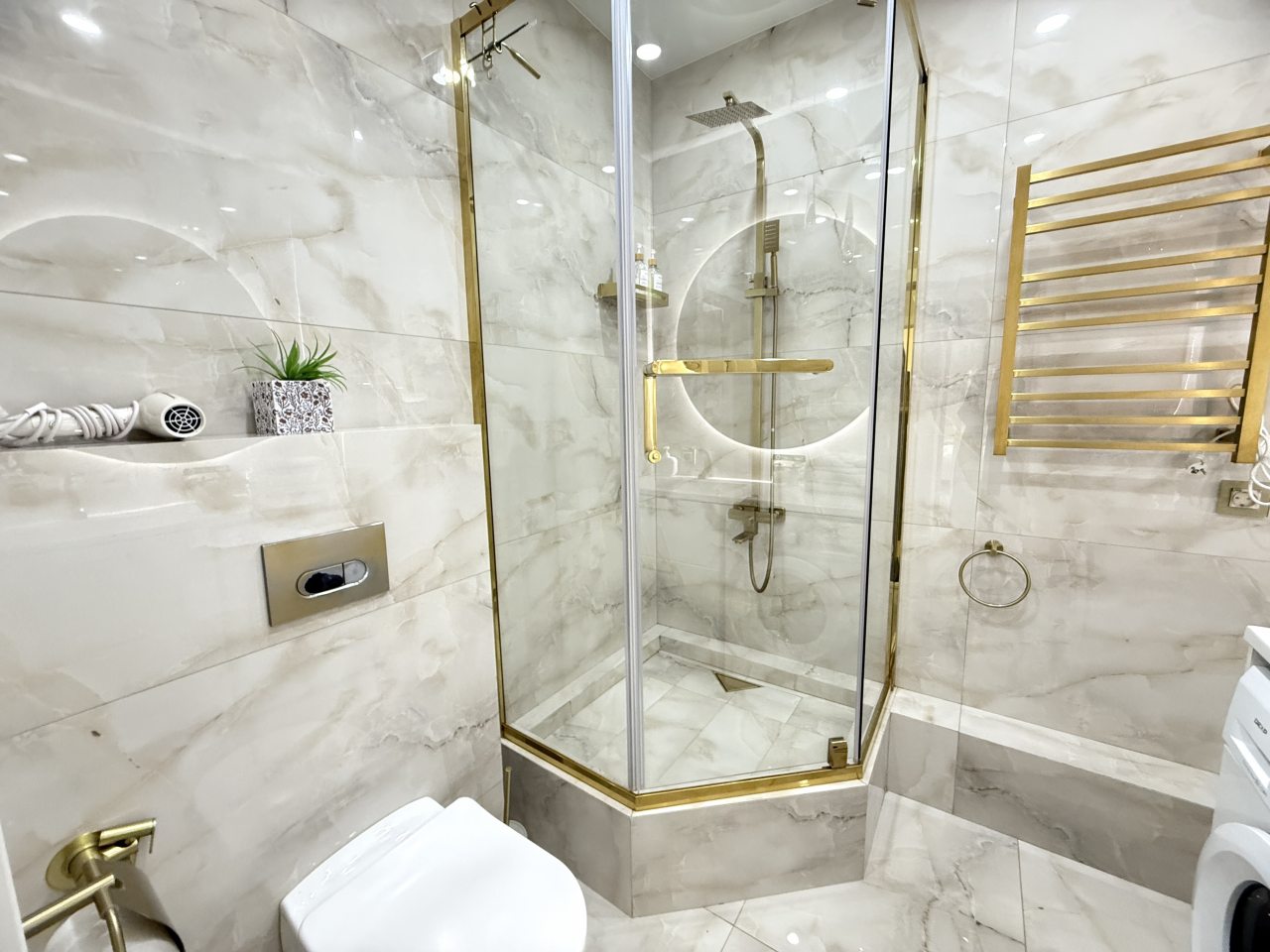 Внутри гостей ожидает удобная для сна двуспальная кровать, мягкий диван с телевизором, различные сценарии освещения, стиральная машина, санузел с душевой, шкаф с зеркалом в полный рост, набор полотенец и средств для личной гигиены, а также лоджия с панорамным остеклением.
