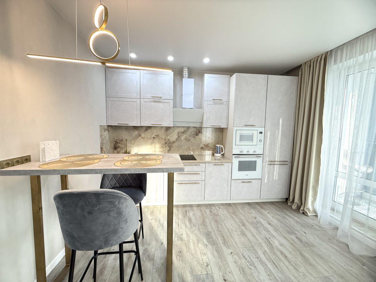 На светлой кухне будет приятно готовить любимые блюда, так как в наличии есть духовой шкаф, СВЧ-печь, варочная панель, холодильник, чайник и обеденная зона.