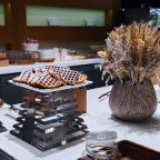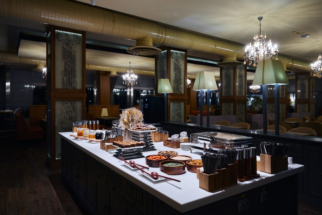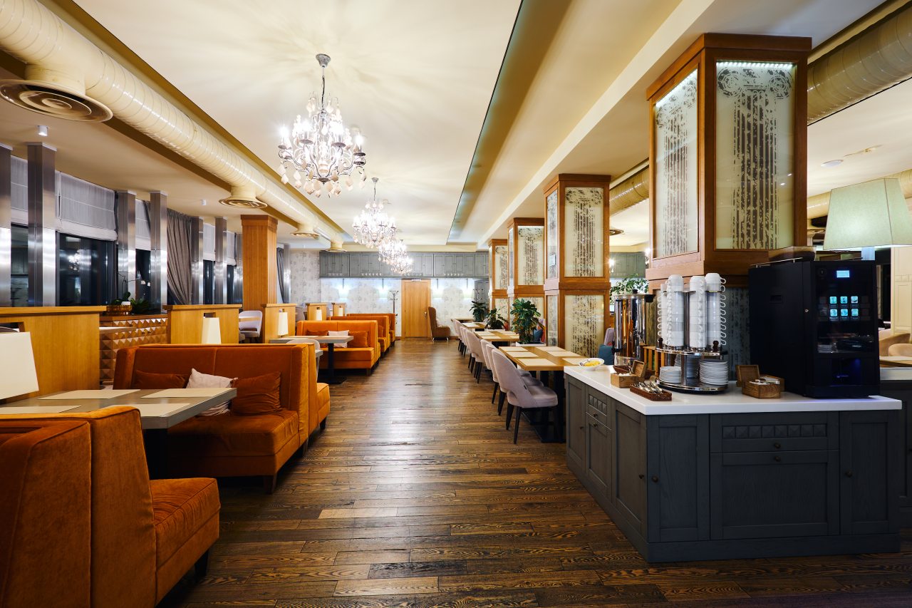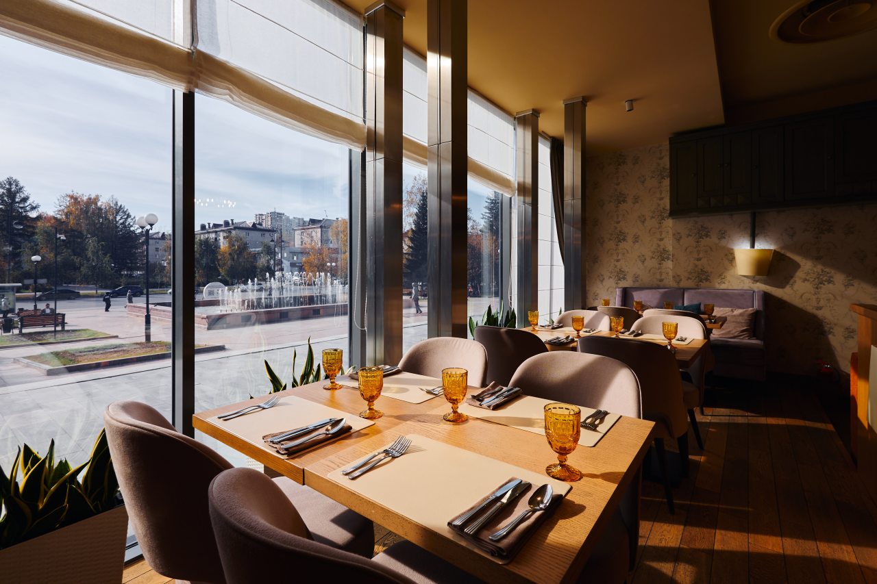 Просторный зал с панорамными окнами. Гостям предлагаются, как традиционные, так и блюда сибирской кухни, а соблазнительные десерты не оставят равнодушным ни одного любителя сладостей.