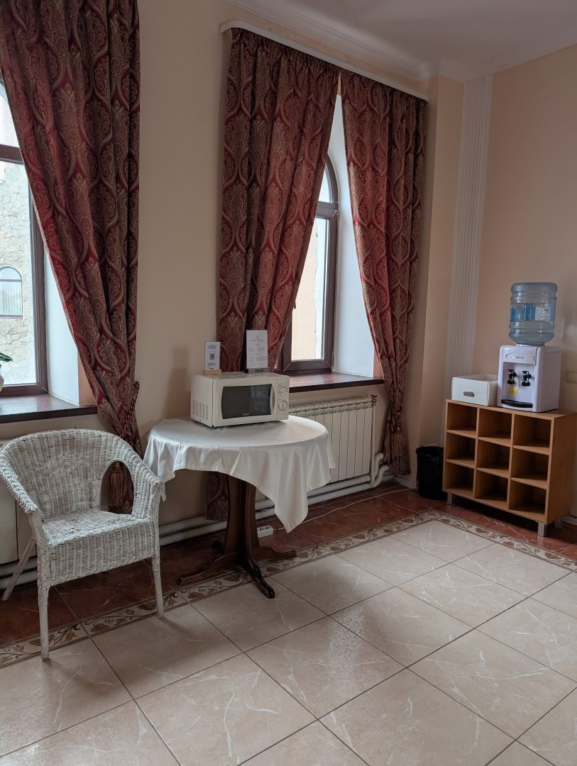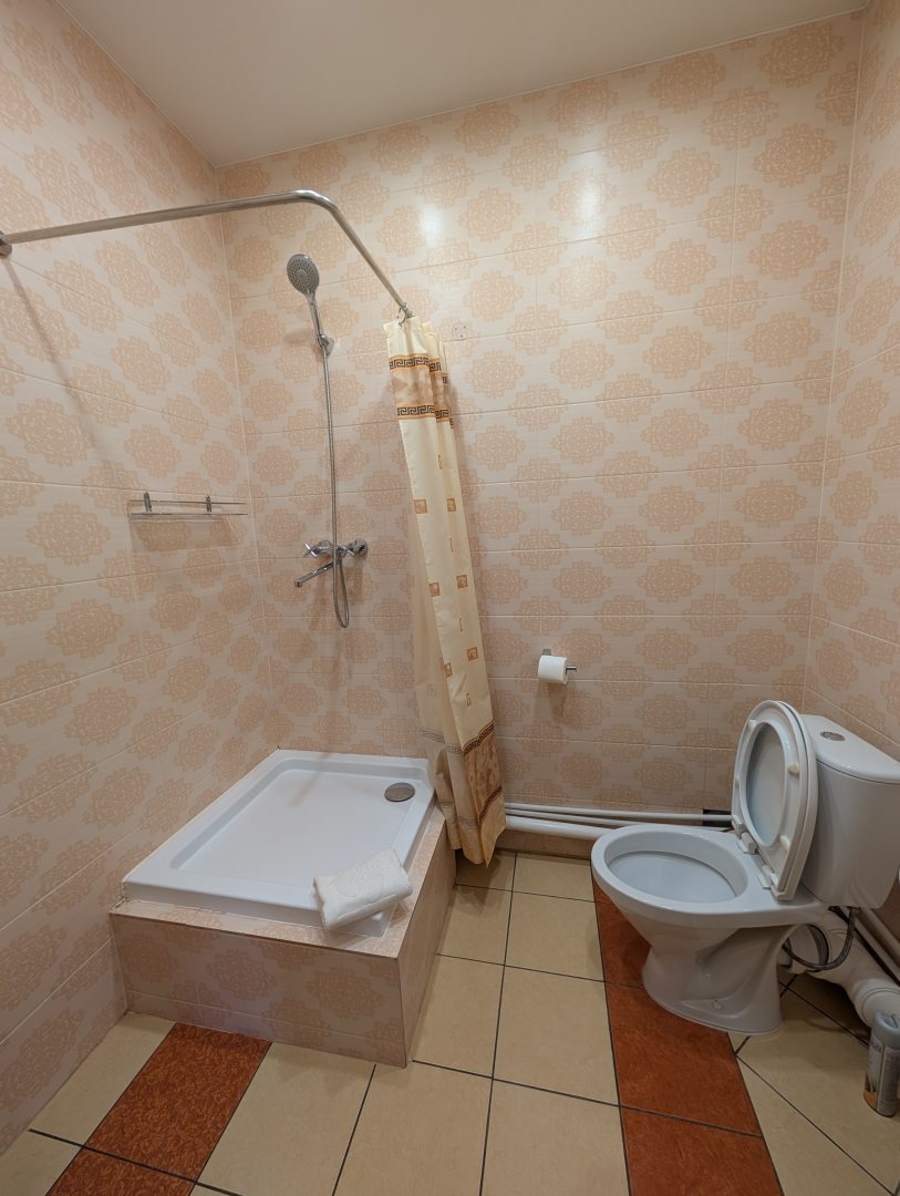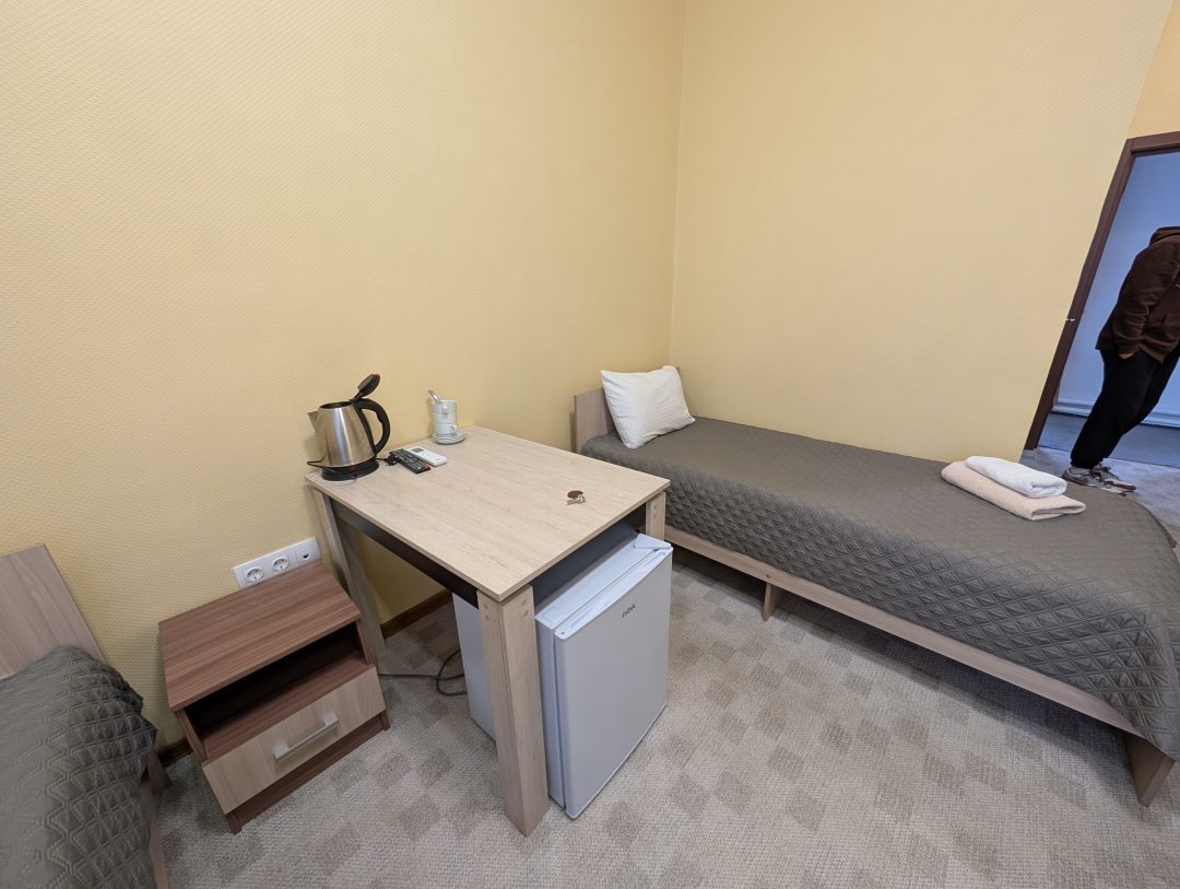 Отель недалеко от ЖД вокзала. Рядом есть рынок, где есть кафе- столовая "хорошее место", работает до 19.00 по будням. Номера в отеле находятся на 3 этажах, лифта нет. Сотрудники отеля отзывчивые приятные люди. В отеле предоставляют завтраки. Это готовые вторые блюда, выпечка, блинчики и т.п. Выбираете еду и разогреваете в микроволновке, есть чай, сахар. Также в фойе есть холодильник с вкусным мороженым и кофейный аппарат. Если есть желание полакомится, можно купить и мороженое и кофе. На этажах есть микроволновка, кулер с водой, в номере у нас был холодильник и чайник чашками. Мы жили в 3 местном номере. В номерах чисто просторно. Есть по два полотенца каждому и общее полотенце под ноги, мыло, гель и шампунь. Постельное белье чистое. В номере санузел. Также предоставляется услуга раннего заезда и позднего выезда. В целом нам отель понравился, рекомендуем!!!