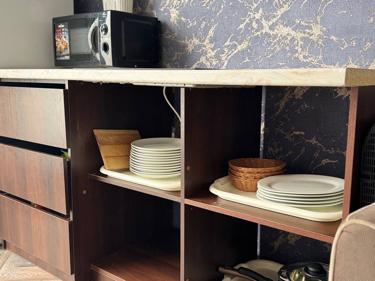 На общей кухне вы обнаружите всю необходимую посуду, а также варочную панель и микроволновую печь для самостоятельного приготовления вкусных домашних блюд. А за дополнительную плату вы сможете насладиться континентальным завтраком или заказать еду и напитки в номер.