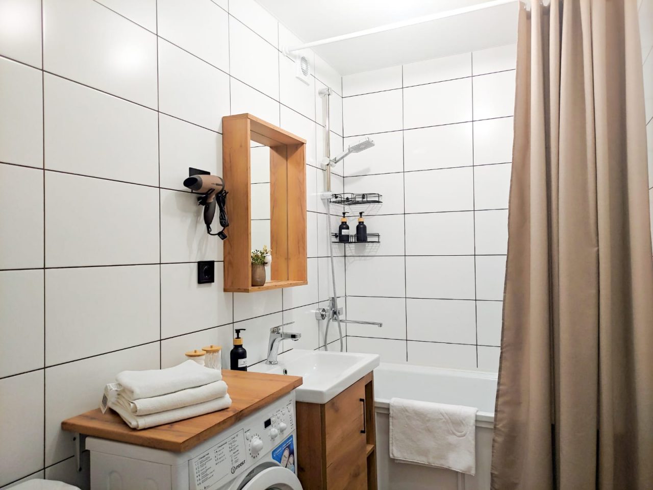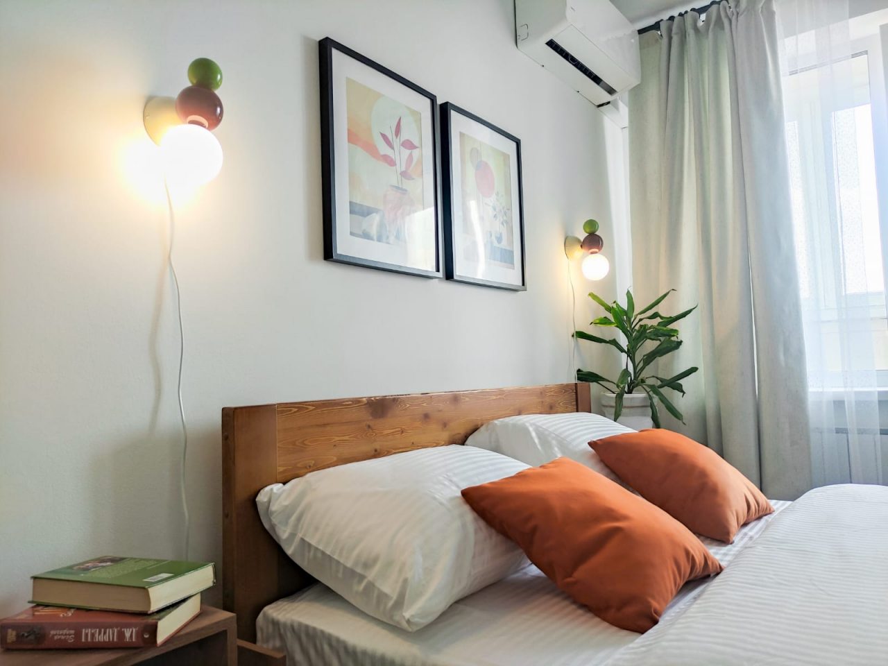 Внутри гостей ожидает стильный дизайн, качественная и функциональная мебель и техника, в том числе удобная двуспальная кровать, мягкий диван, настенные светильники, телевизор, ванная комната со стиральной машиной и средствами для гигиены.