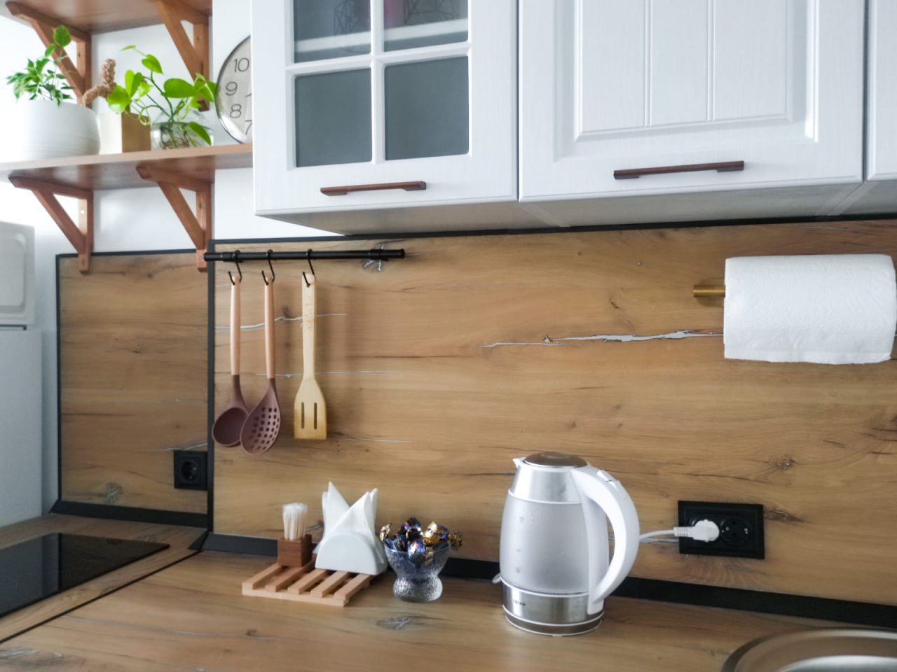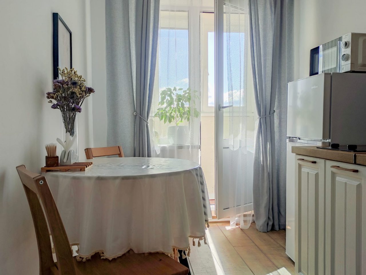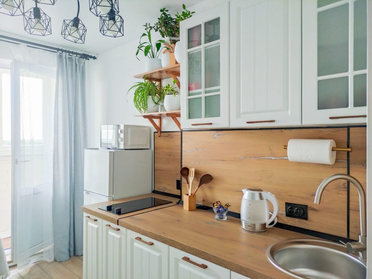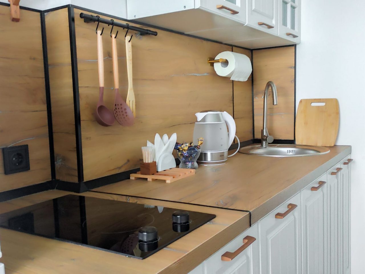 На уютной кухне будет приятно готовить любимые блюда, так как в наличии варочная панель, чайник, СВЧ, холодильник, посуда и красивая обеденная зона.