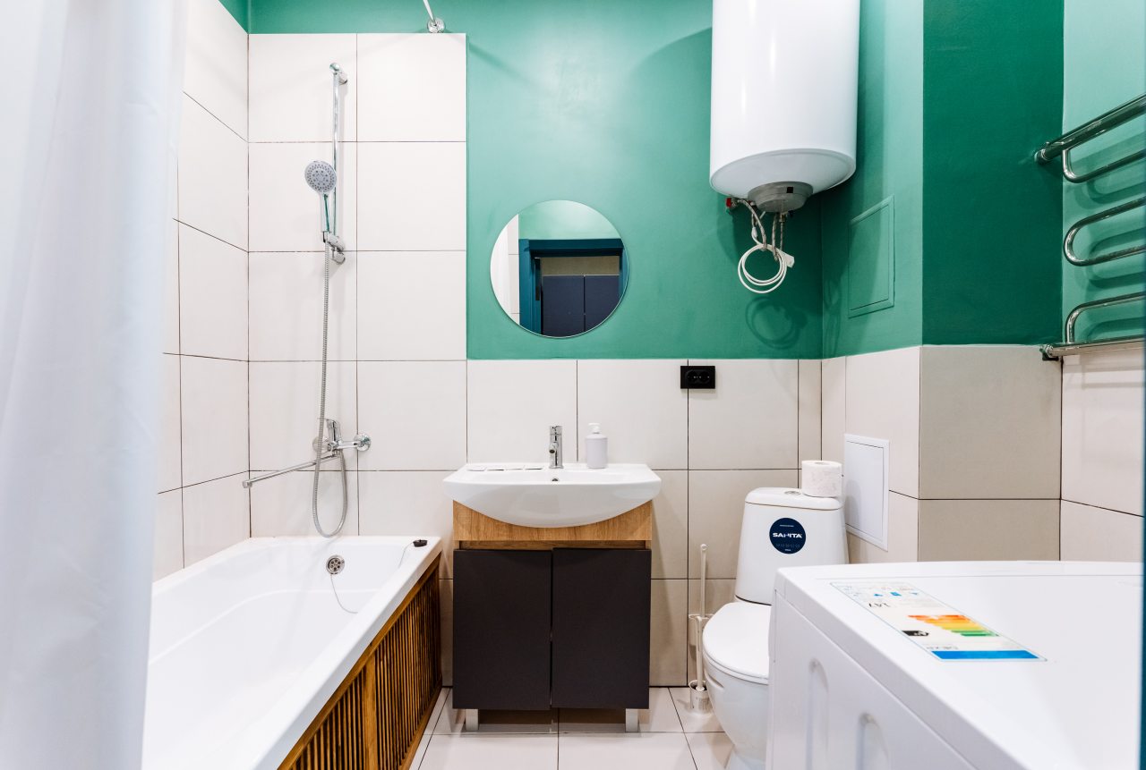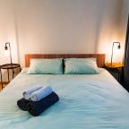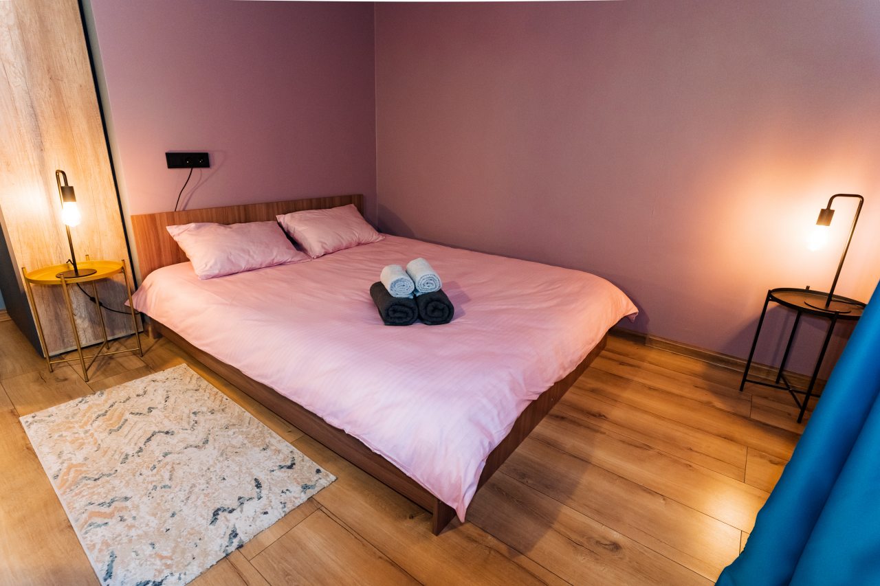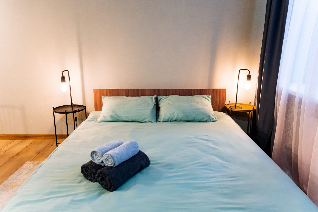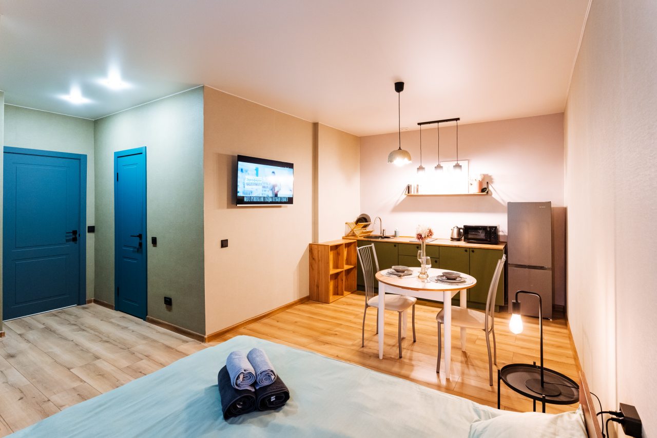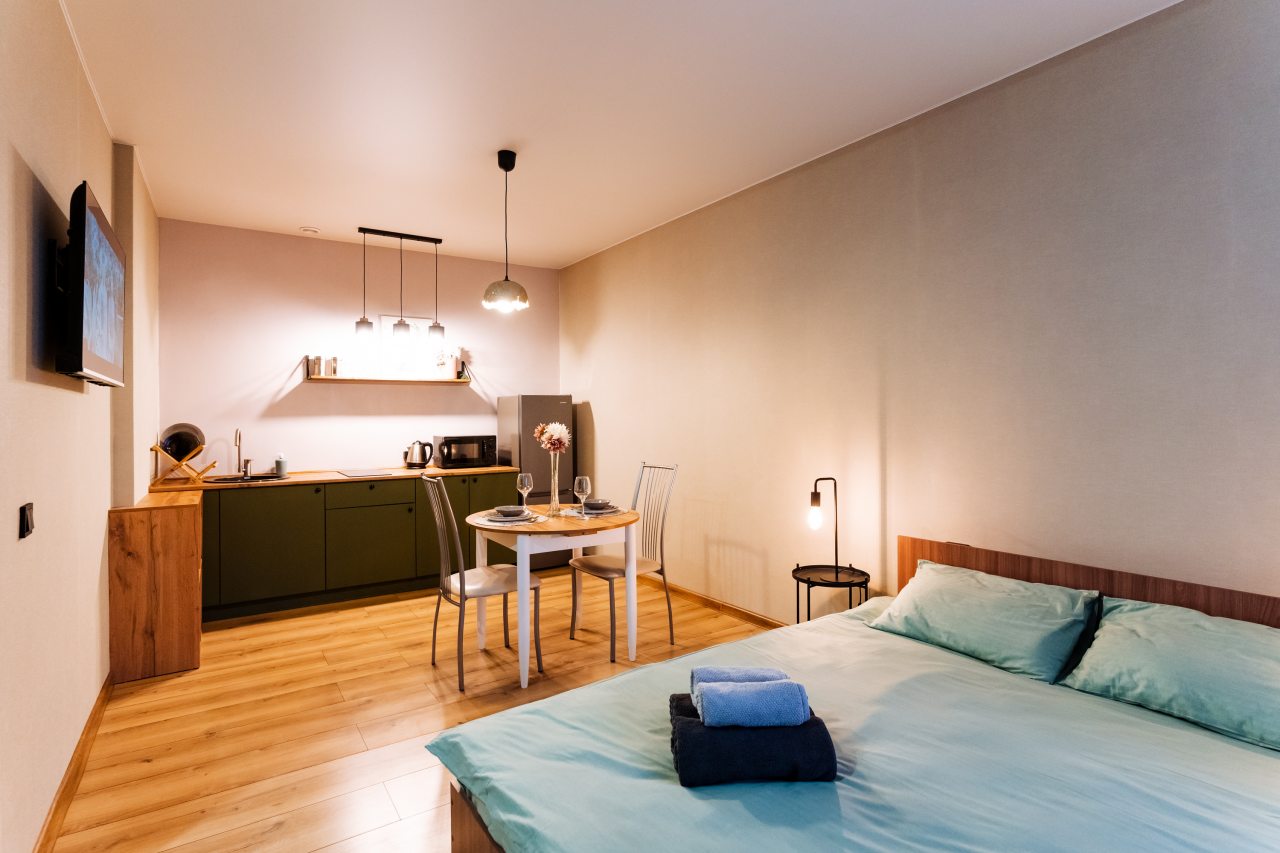 Внутри гостей ожидает стильный дизайн, удобная двуспальная кровать, прикроватные светильники, стиральная машина, набор полотенец, кондиционер. Санузел может быть укомплектован душем или ванной в зависимости от вида апартаментов.