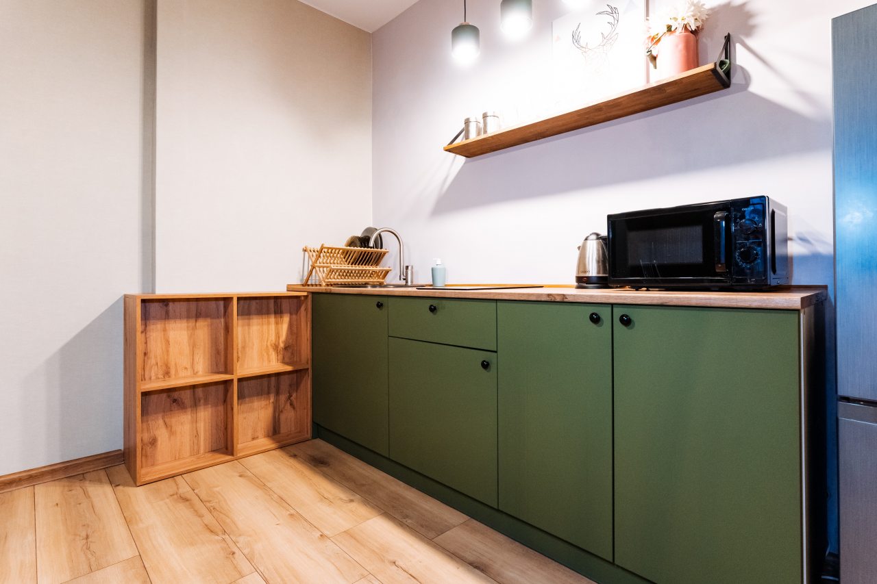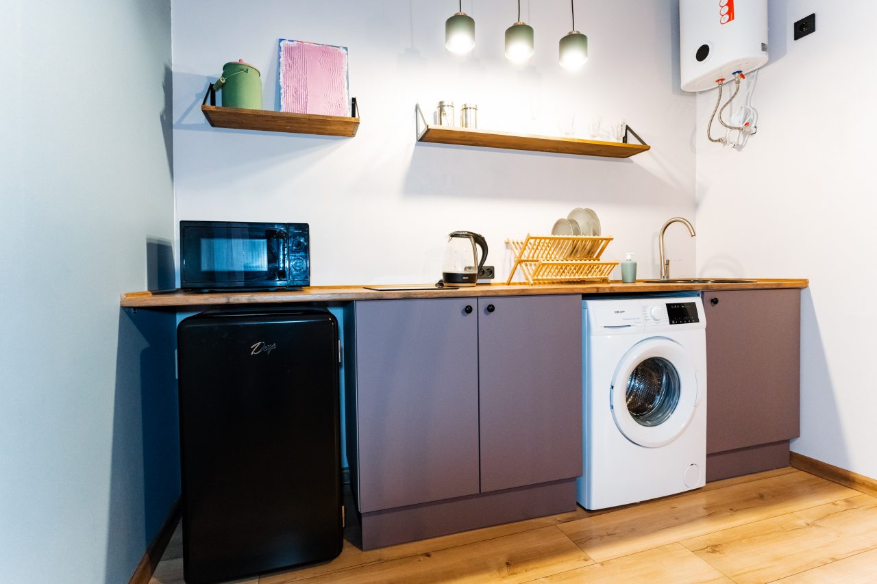 Кухонная зона оснащена холодильником, СВЧ-печью, варочной панелью, чайником и посудой, чтобы вы могли готовить домашние блюда.