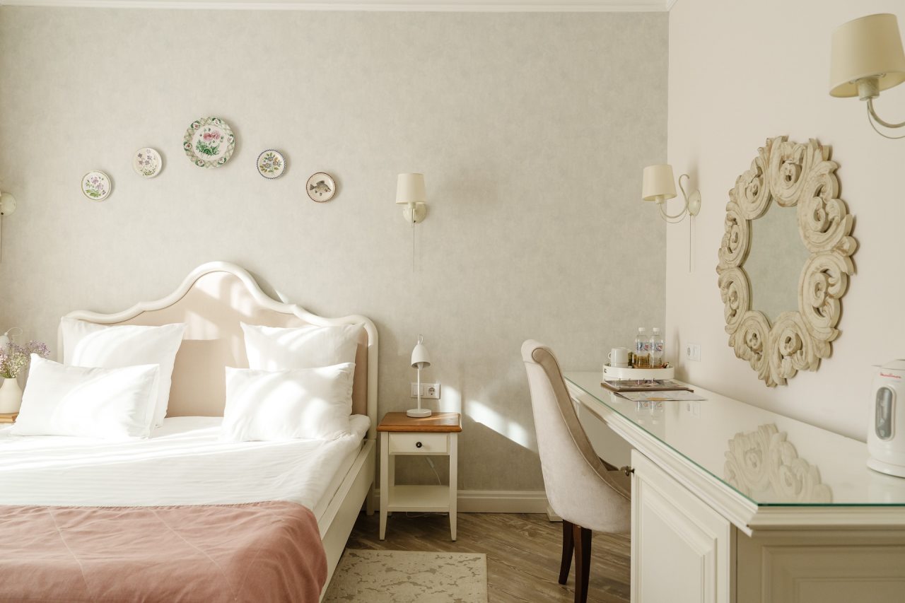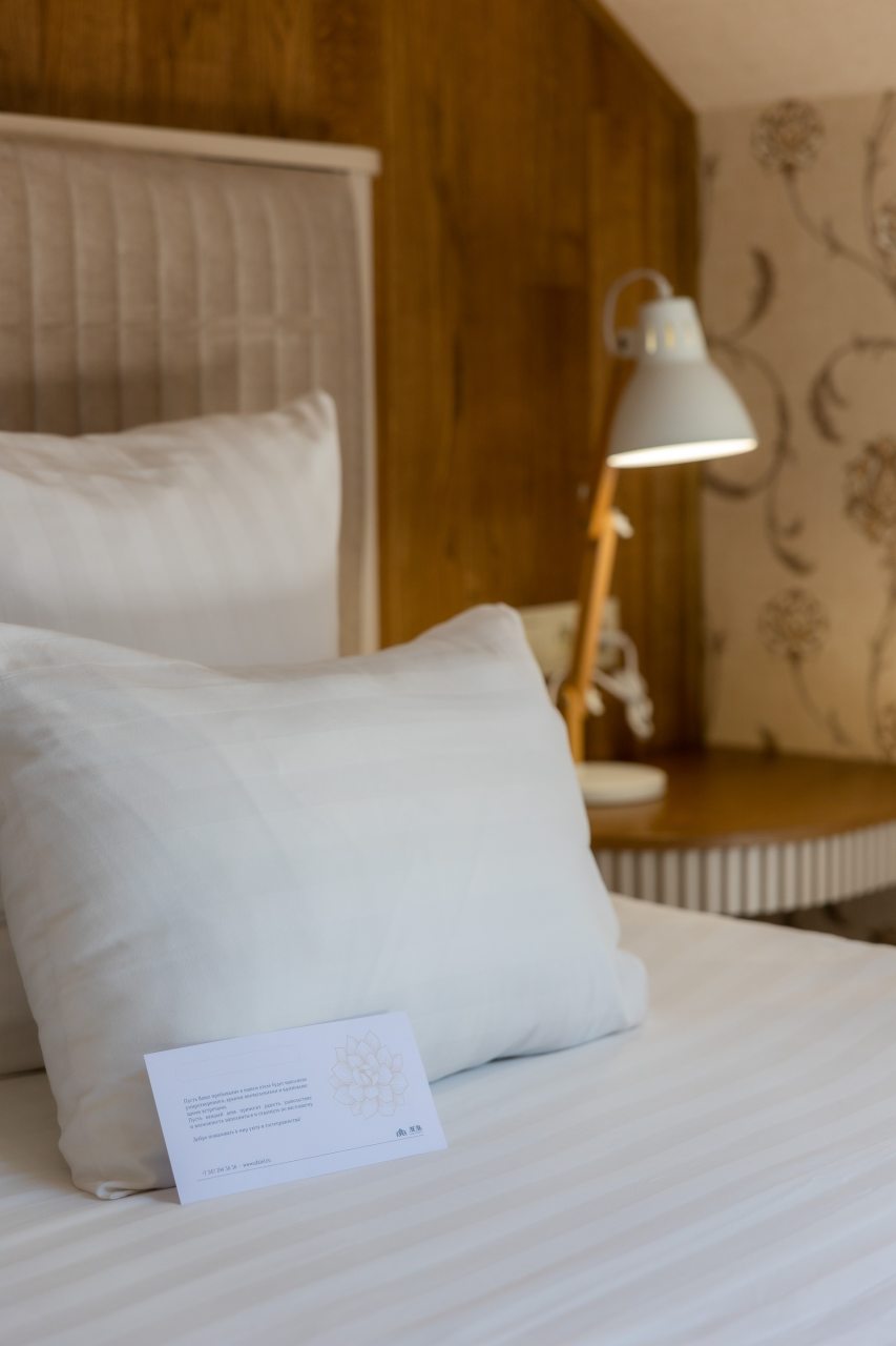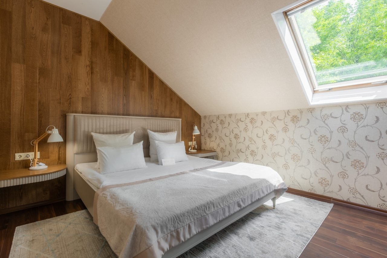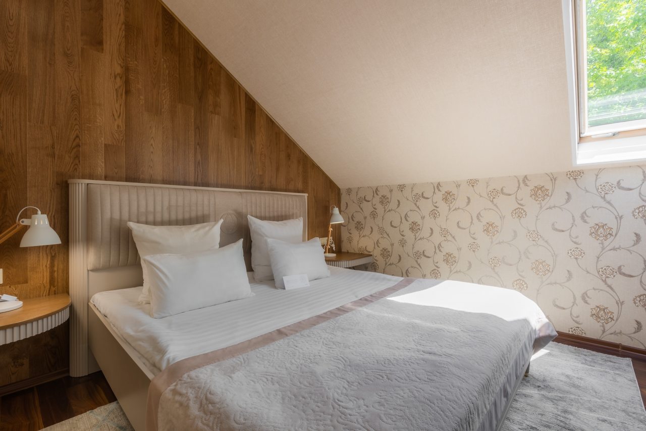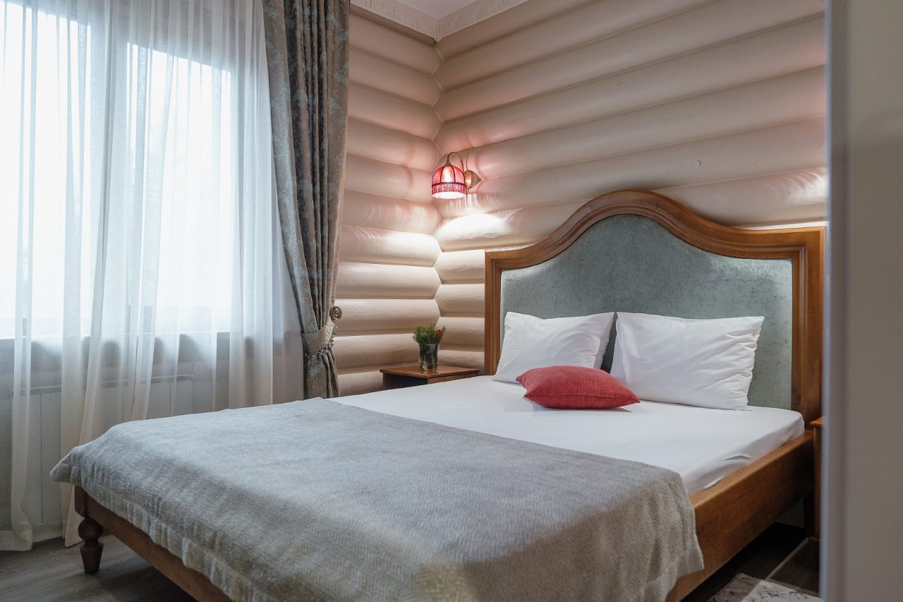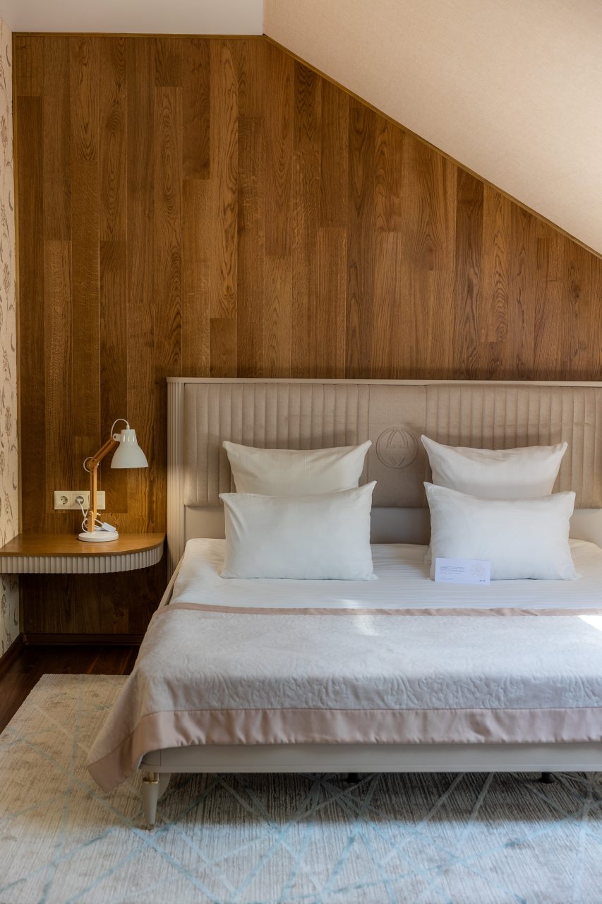 В малом отеле 12 просторных дизайнерских номеров с видом на реку и лес. К услугам: мебель ручной работы из массива дерева, качественные косметические принадлежности, белые махровые полотенца, фен, кондиционер, встроенный шкаф для багажа, утюг с гладильной доской, сейф. Также есть уютные спальные места с ортопедическим матрасом, шкаф для бережного хранения личных вещей, спутниковое телевидение, письменный стол, мягкое кресло, ванная комната.