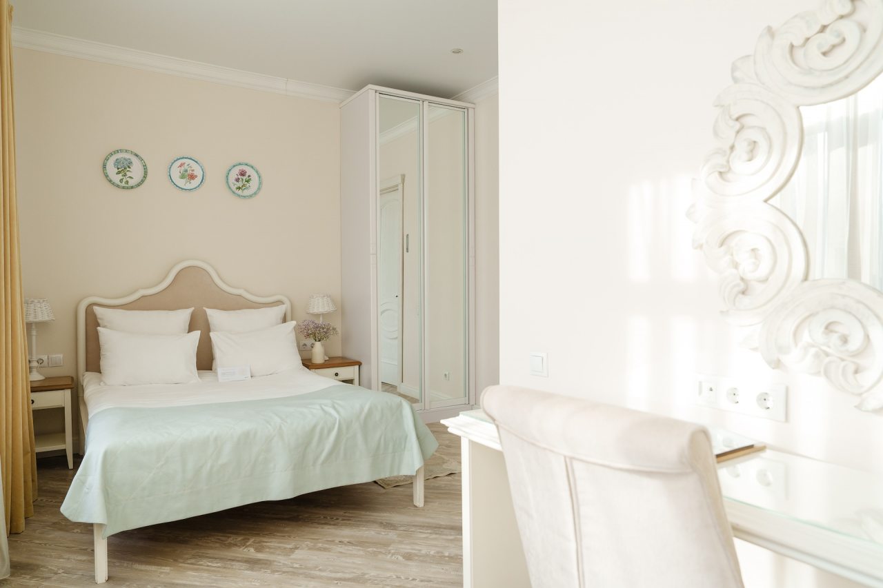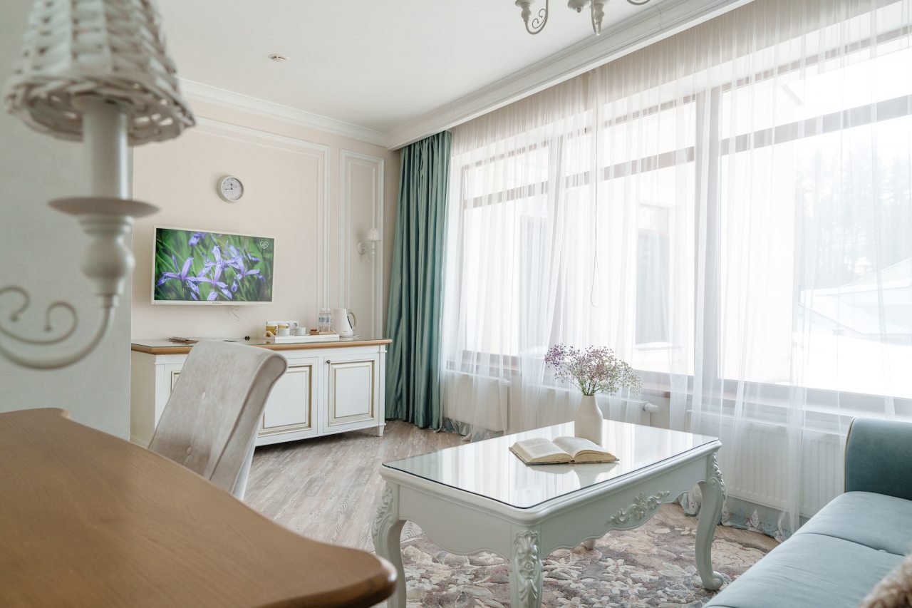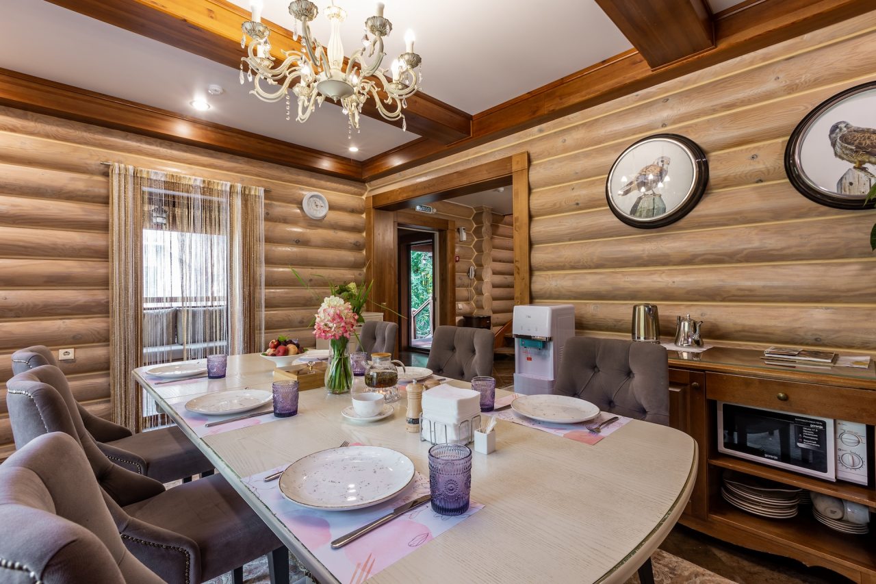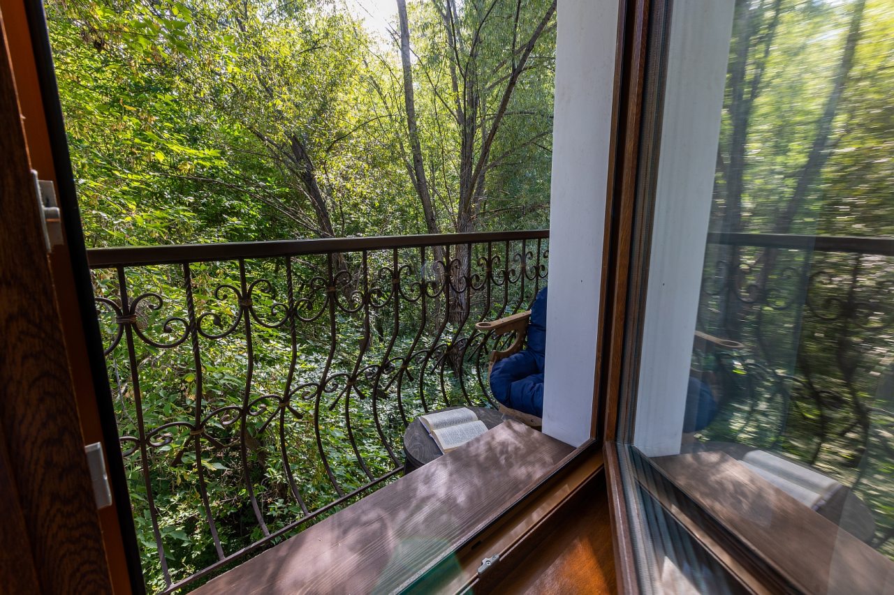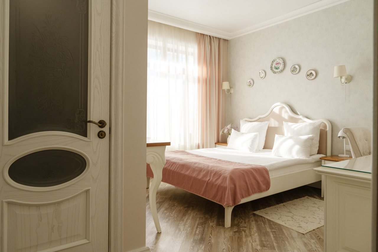 В малом отеле 12 просторных дизайнерских номеров с видом на реку и лес. К услугам: мебель ручной работы из массива дерева, качественные косметические принадлежности, белые махровые полотенца, фен, кондиционер, встроенный шкаф для багажа, утюг с гладильной доской, сейф. Также есть уютные спальные места с ортопедическим матрасом, шкаф для бережного хранения личных вещей, спутниковое телевидение, письменный стол, мягкое кресло, ванная комната.