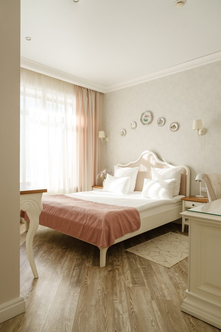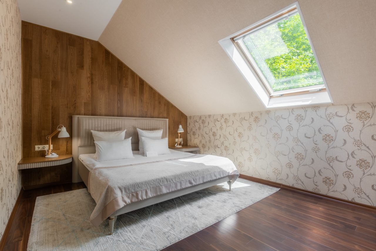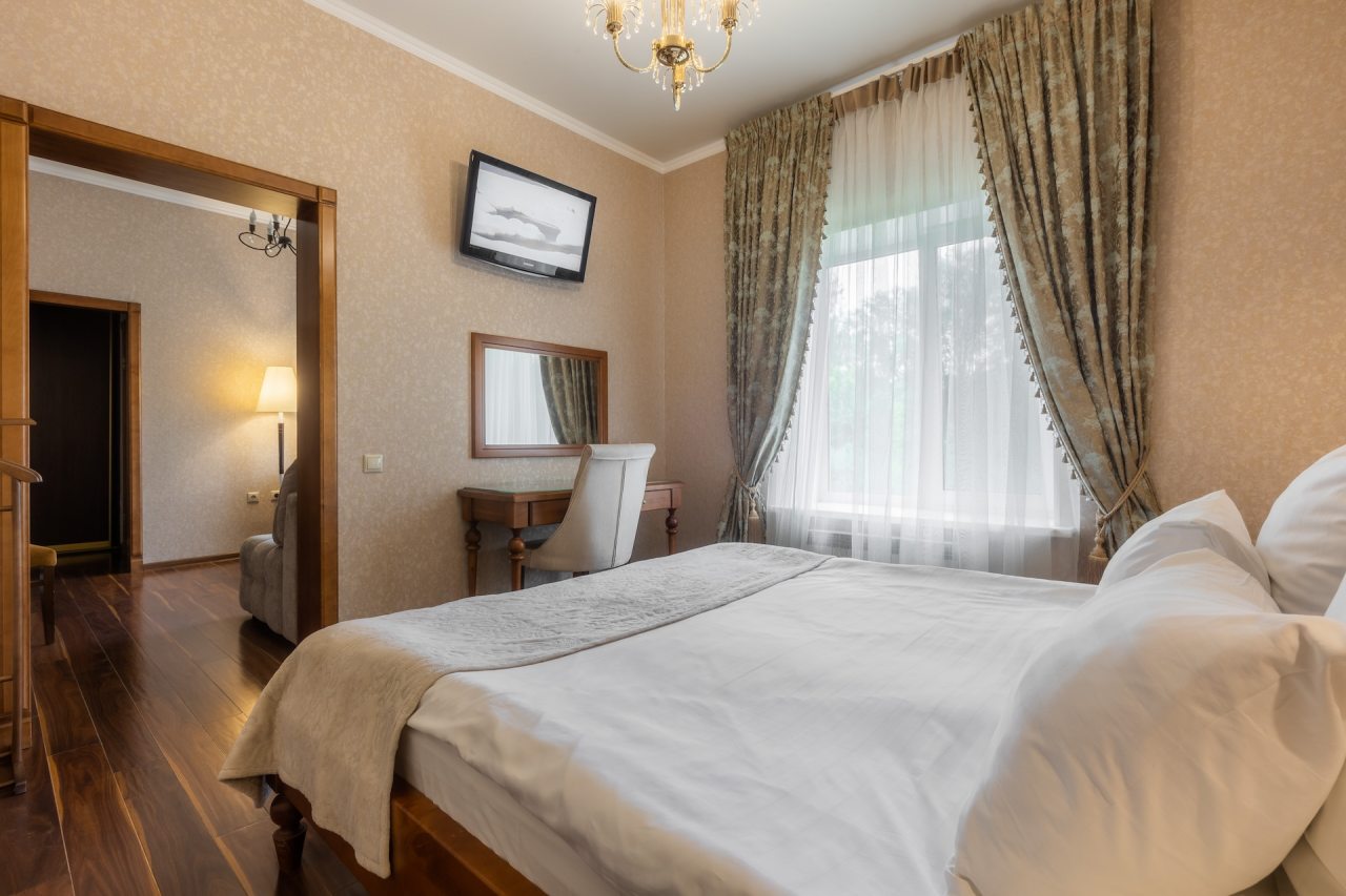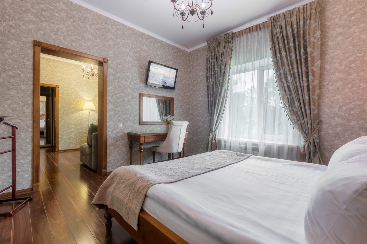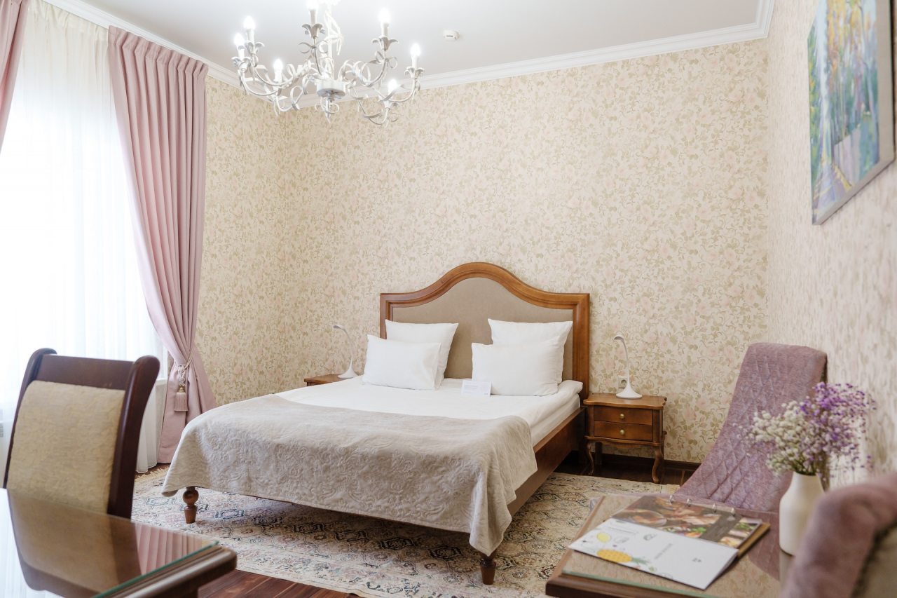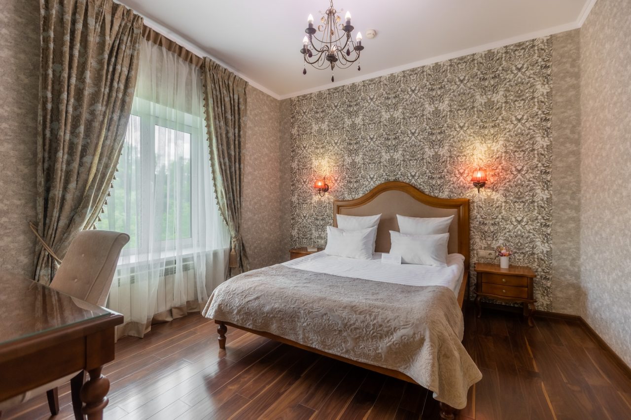 В малом отеле 12 просторных дизайнерских номеров с видом на реку и лес. К услугам: мебель ручной работы из массива дерева, качественные косметические принадлежности, белые махровые полотенца, фен, кондиционер, встроенный шкаф для багажа, утюг с гладильной доской, сейф. Также есть уютные спальные места с ортопедическим матрасом, шкаф для бережного хранения личных вещей, спутниковое телевидение, письменный стол, мягкое кресло, ванная комната.