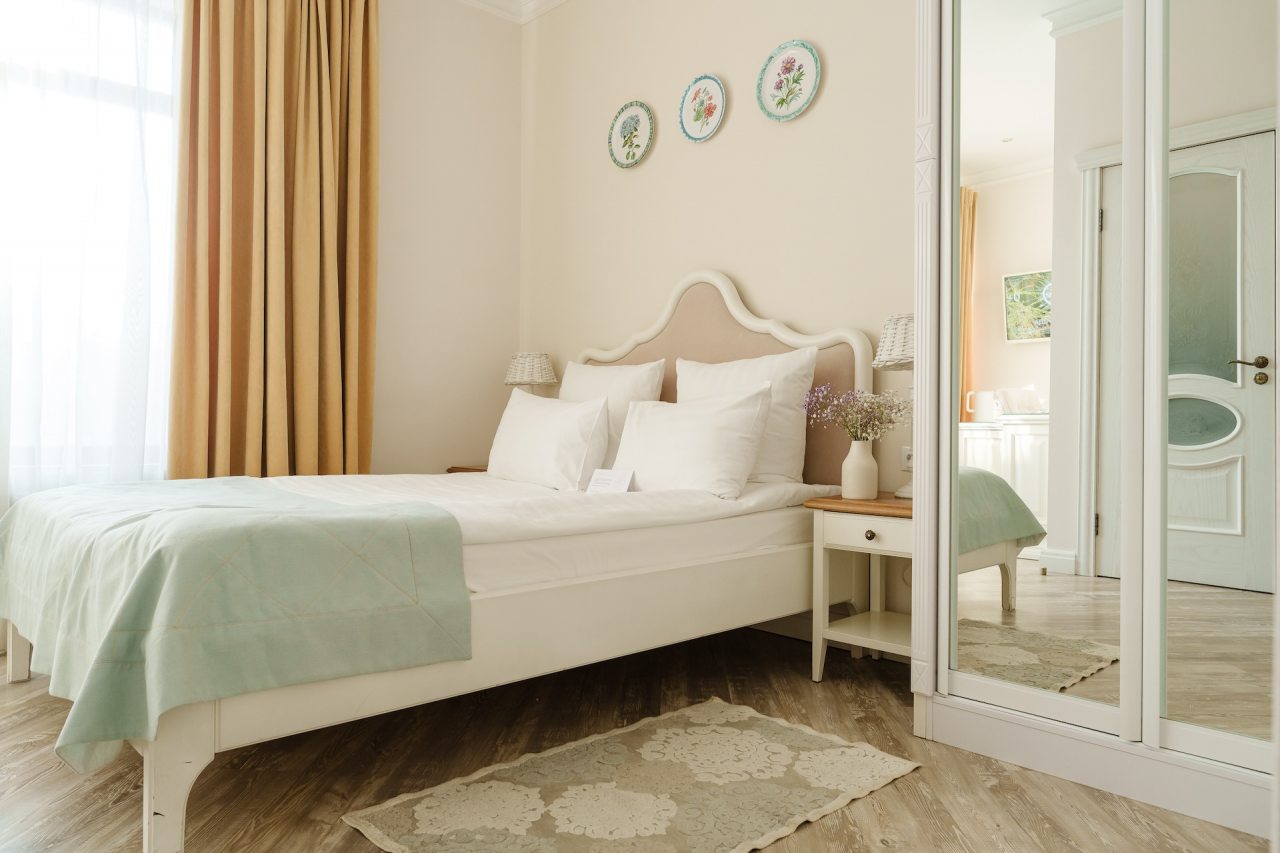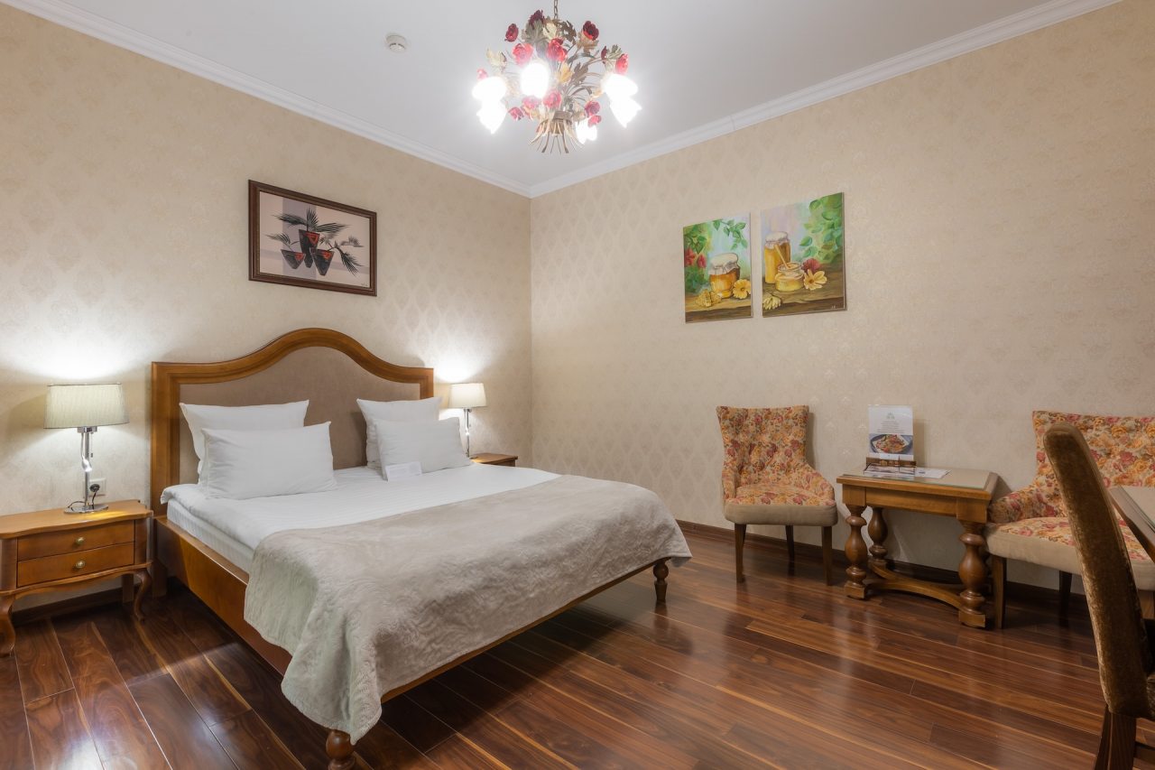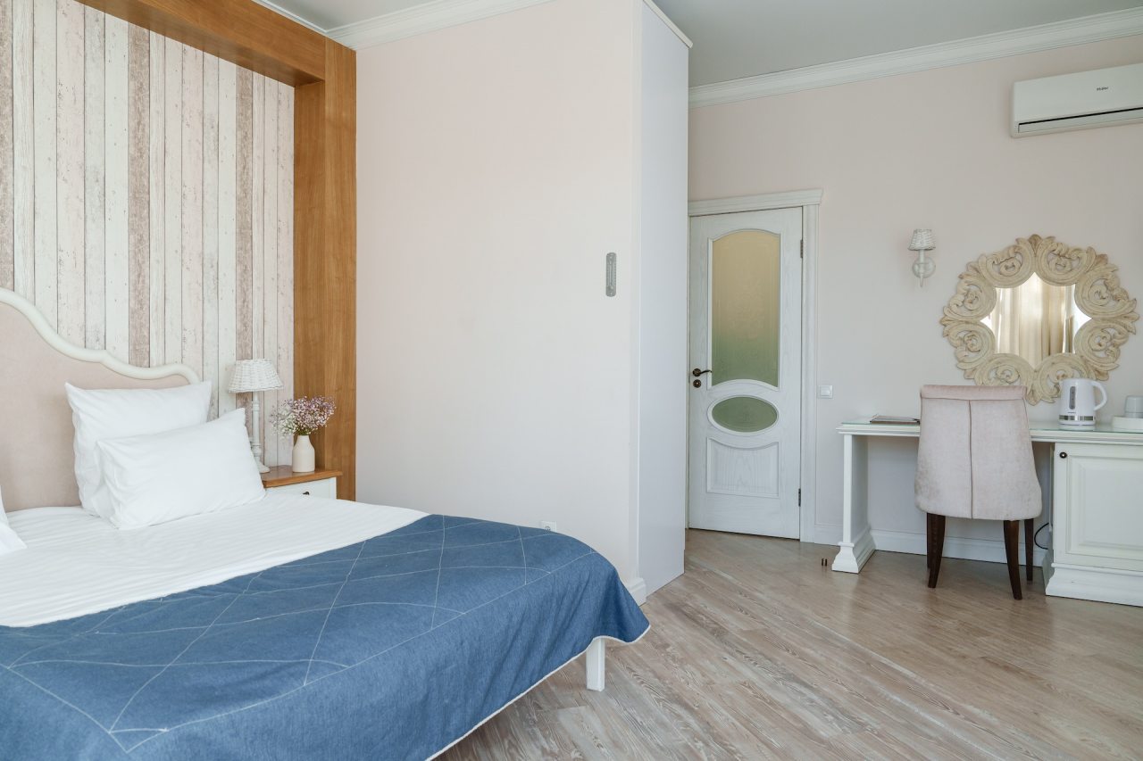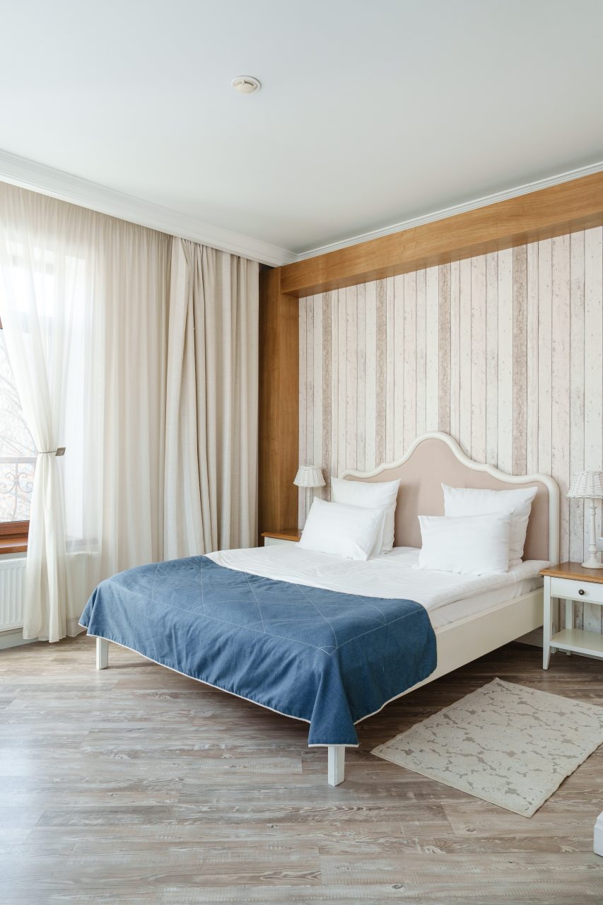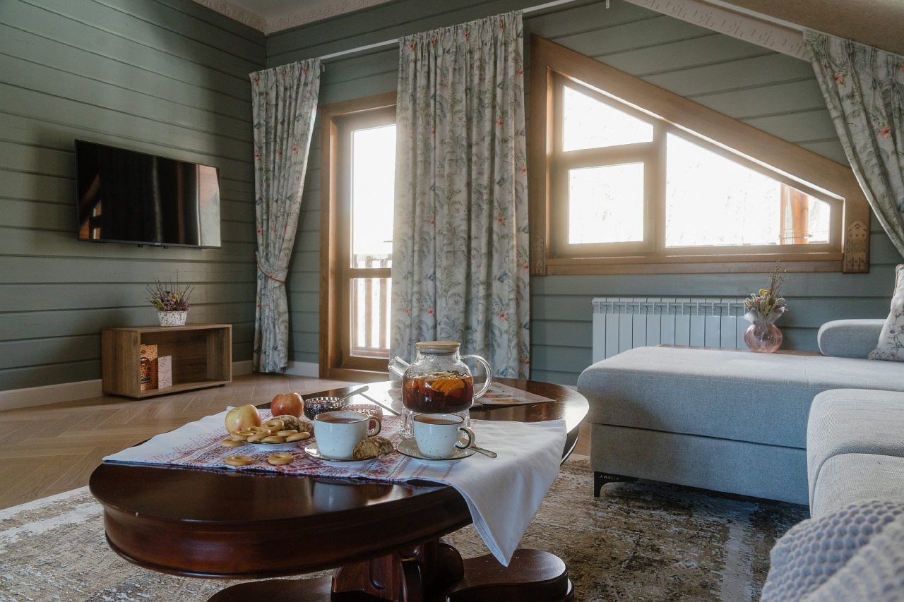 В малом отеле 12 просторных дизайнерских номеров с видом на реку и лес. К услугам: мебель ручной работы из массива дерева, качественные косметические принадлежности, белые махровые полотенца, фен, кондиционер, встроенный шкаф для багажа, утюг с гладильной доской, сейф. Также есть уютные спальные места с ортопедическим матрасом, шкаф для бережного хранения личных вещей, спутниковое телевидение, письменный стол, мягкое кресло, ванная комната.