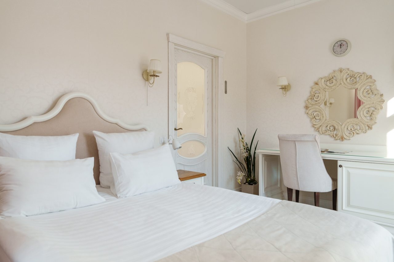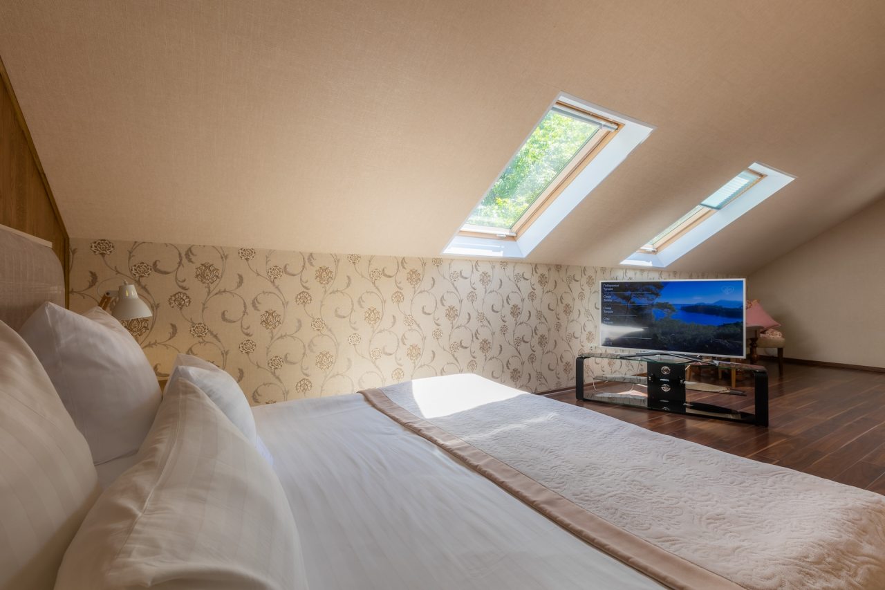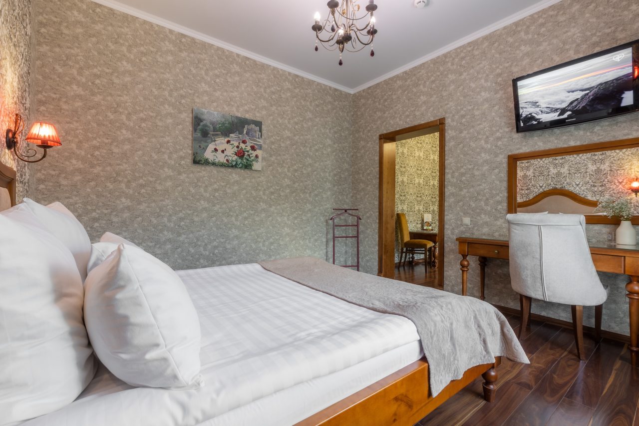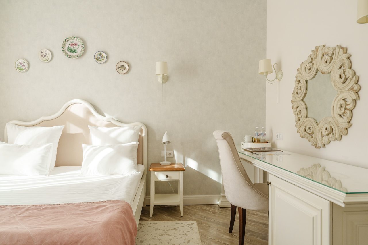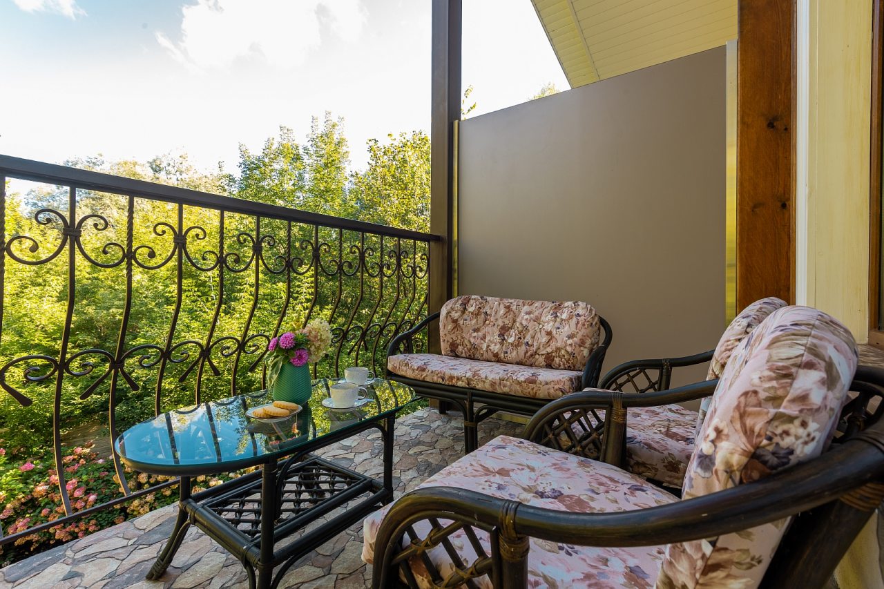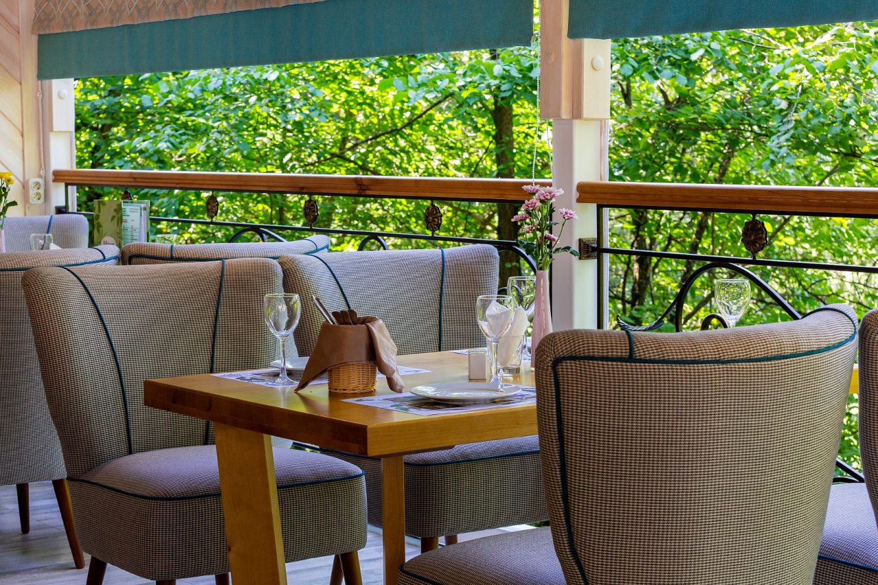 В малом отеле 12 просторных дизайнерских номеров с видом на реку и лес. К услугам: мебель ручной работы из массива дерева, качественные косметические принадлежности, белые махровые полотенца, фен, кондиционер, встроенный шкаф для багажа, утюг с гладильной доской, сейф. Также есть уютные спальные места с ортопедическим матрасом, шкаф для бережного хранения личных вещей, спутниковое телевидение, письменный стол, мягкое кресло, ванная комната.