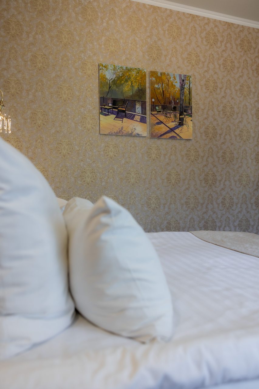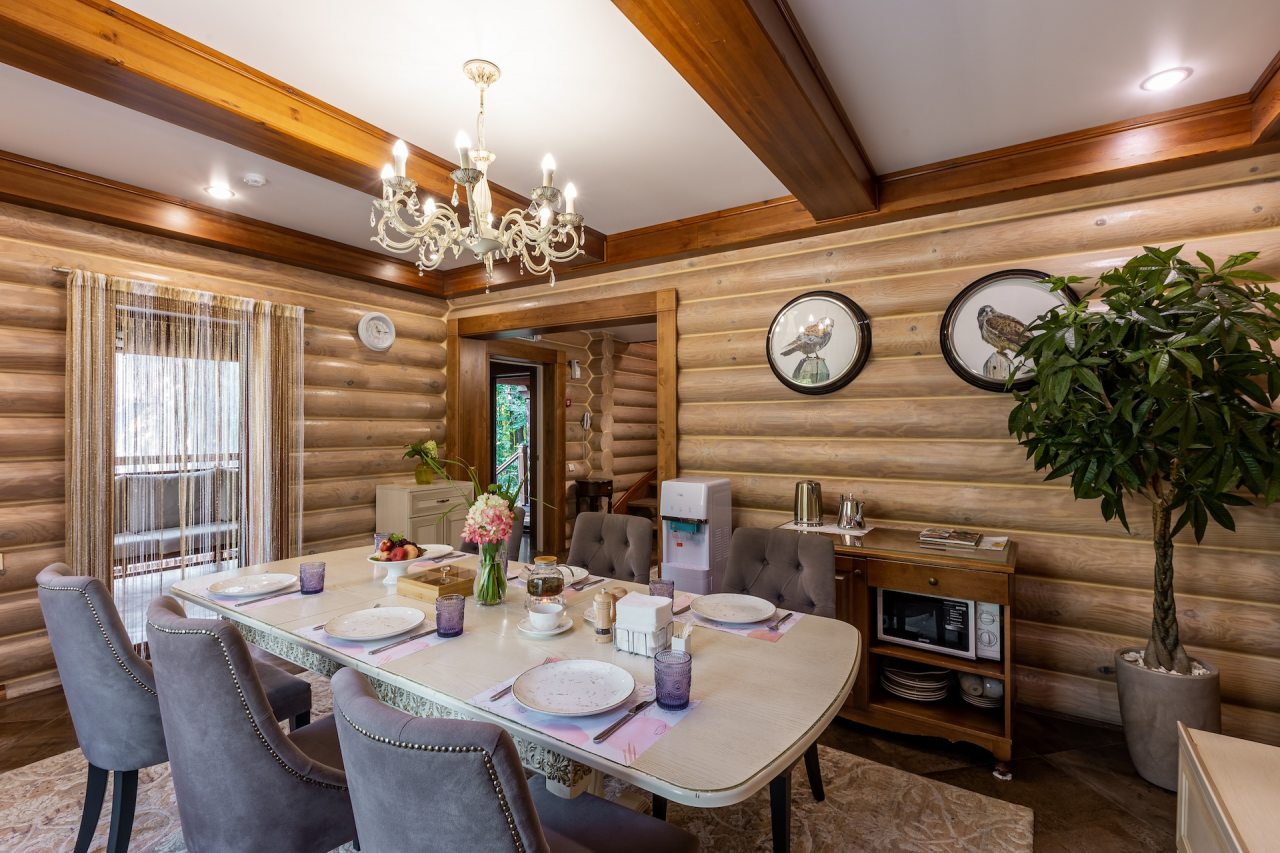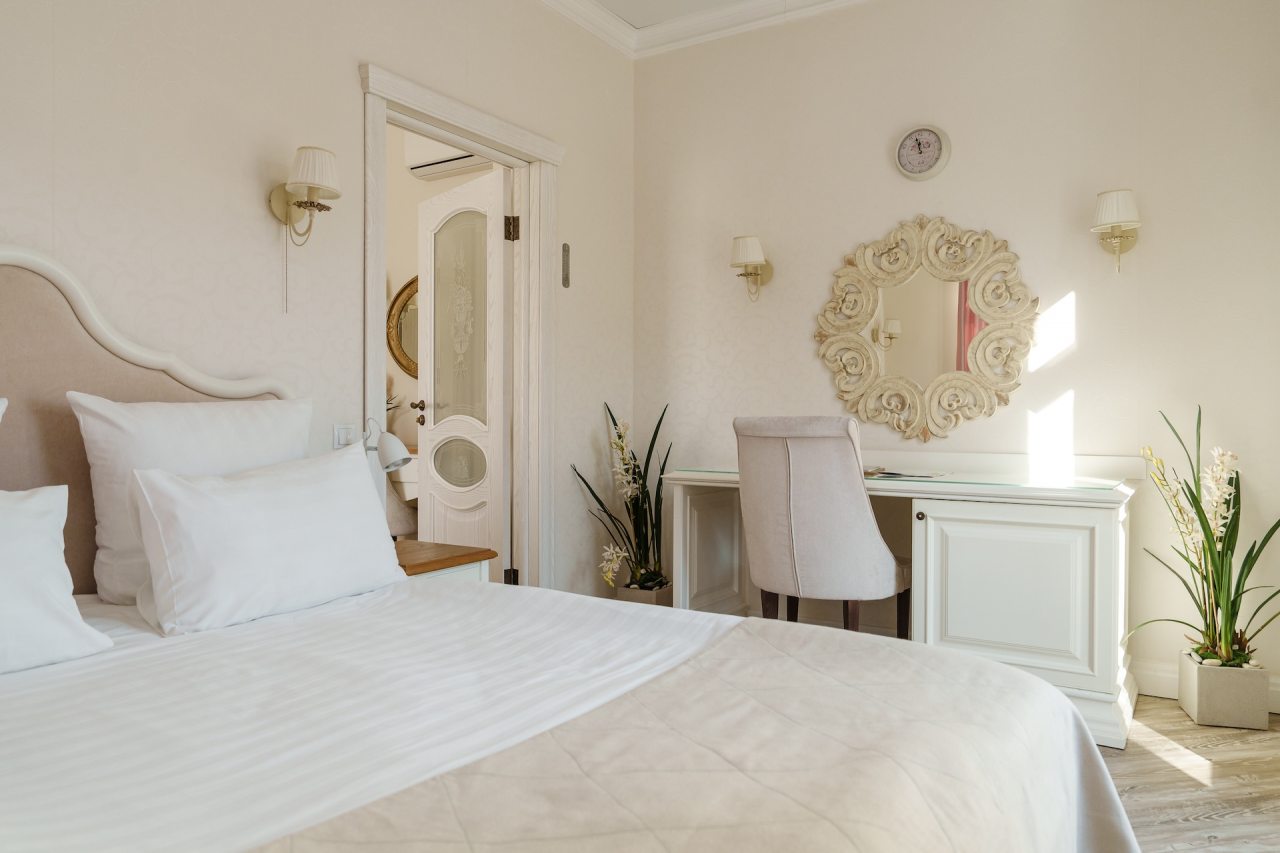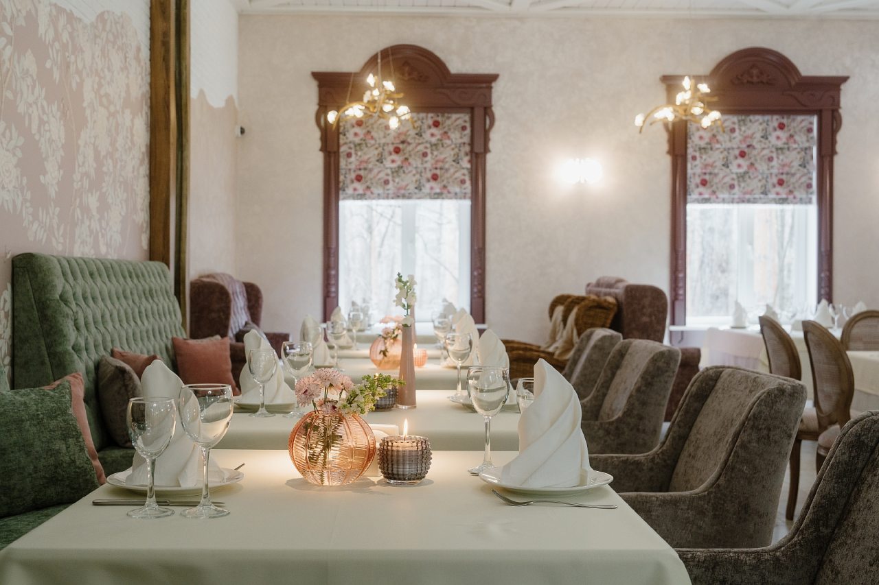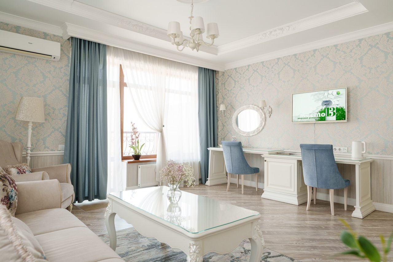 В малом отеле 12 просторных дизайнерских номеров с видом на реку и лес. К услугам: мебель ручной работы из массива дерева, качественные косметические принадлежности, белые махровые полотенца, фен, кондиционер, встроенный шкаф для багажа, утюг с гладильной доской, сейф. Также есть уютные спальные места с ортопедическим матрасом, шкаф для бережного хранения личных вещей, спутниковое телевидение, письменный стол, мягкое кресло, ванная комната.