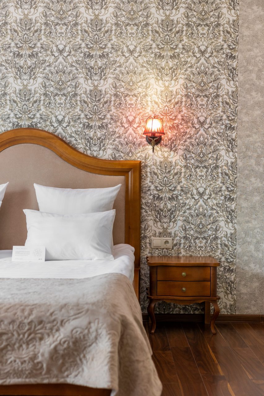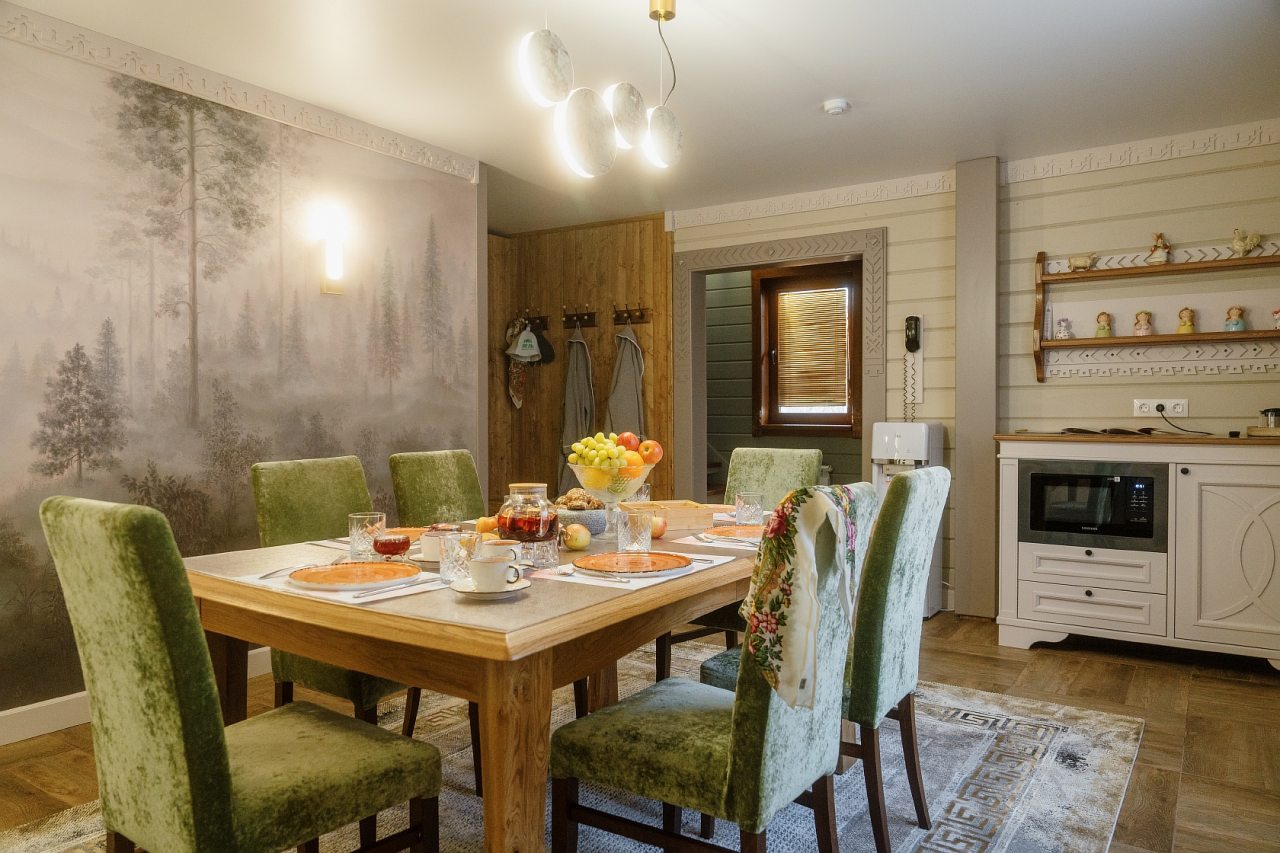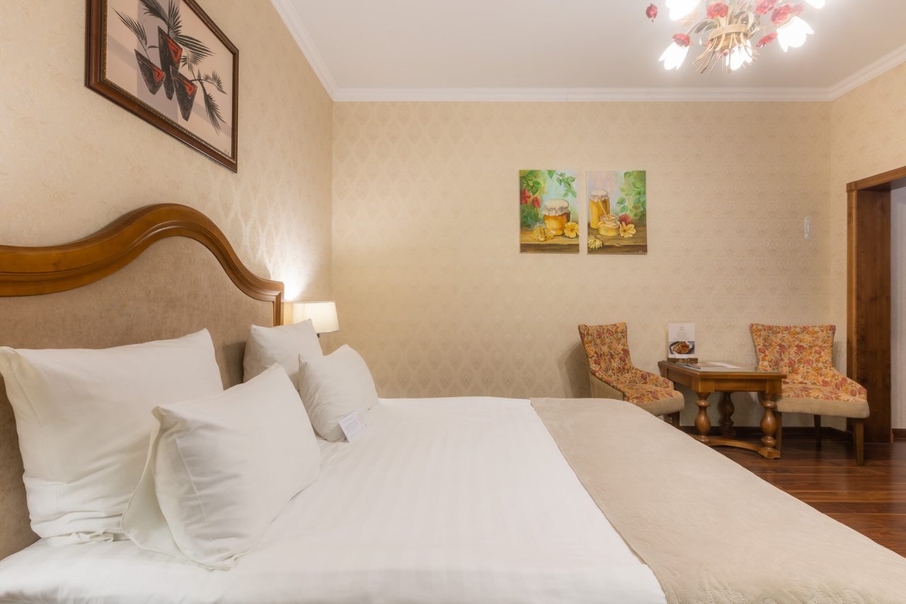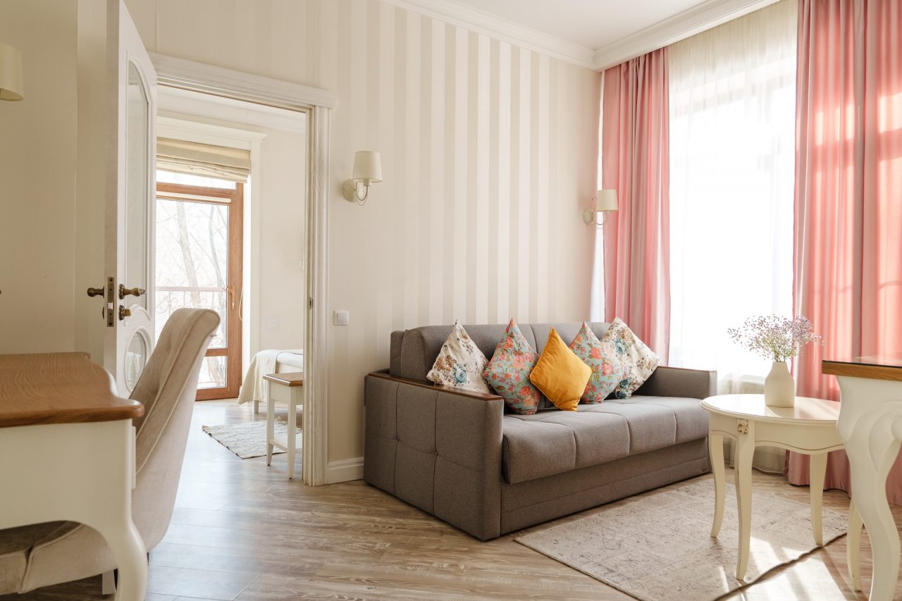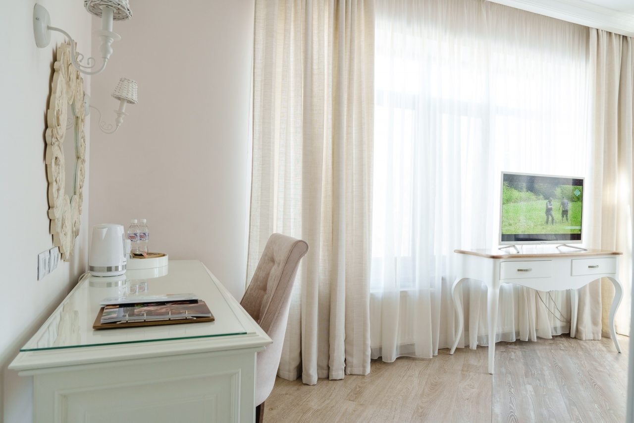 В малом отеле 12 просторных дизайнерских номеров с видом на реку и лес. К услугам: мебель ручной работы из массива дерева, качественные косметические принадлежности, белые махровые полотенца, фен, кондиционер, встроенный шкаф для багажа, утюг с гладильной доской, сейф. Также есть уютные спальные места с ортопедическим матрасом, шкаф для бережного хранения личных вещей, спутниковое телевидение, письменный стол, мягкое кресло, ванная комната.