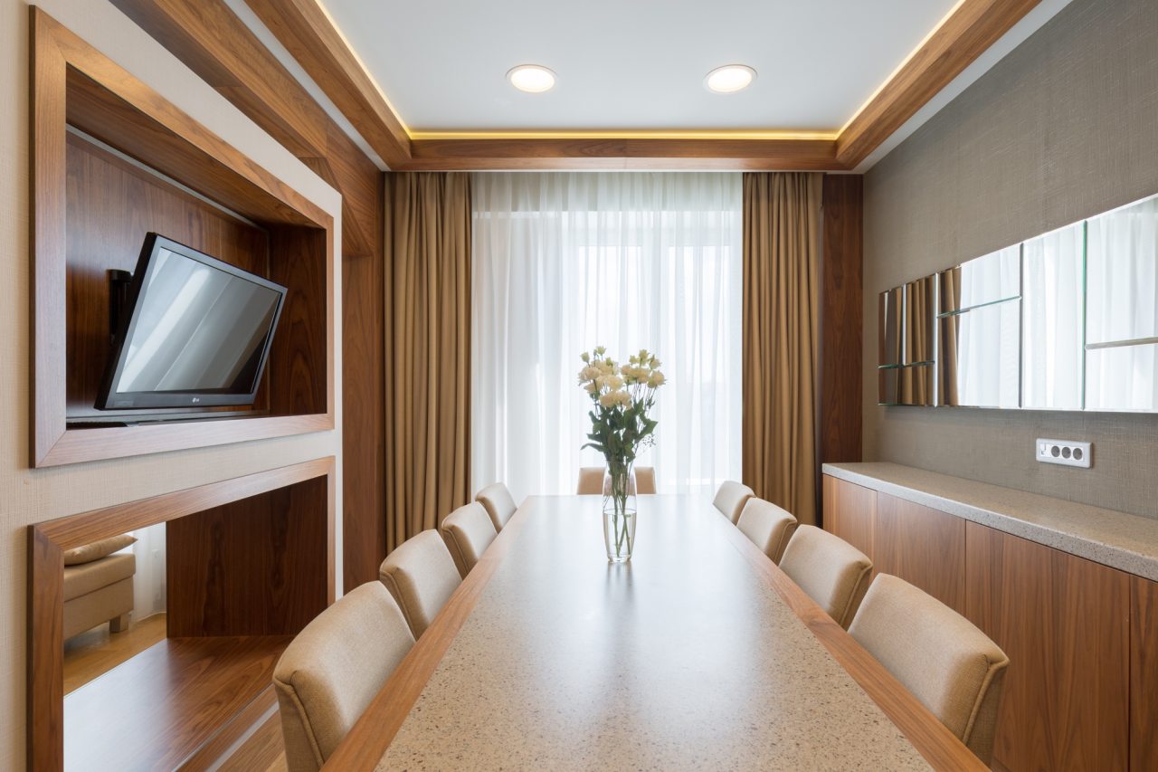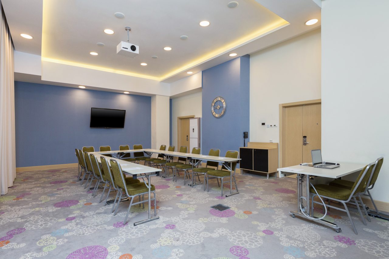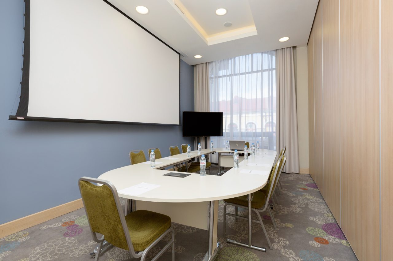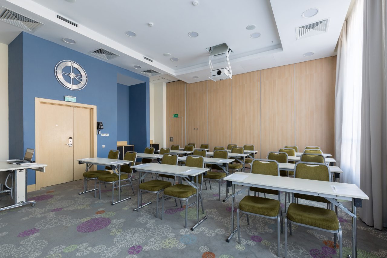 Площадь конференц-зала — 25 кв.м., размещение — до 25 человек.