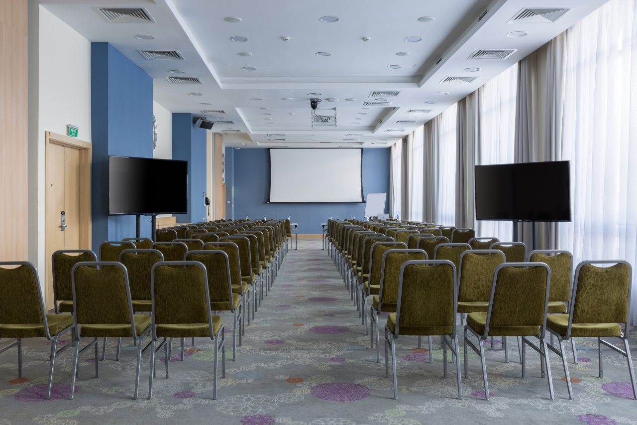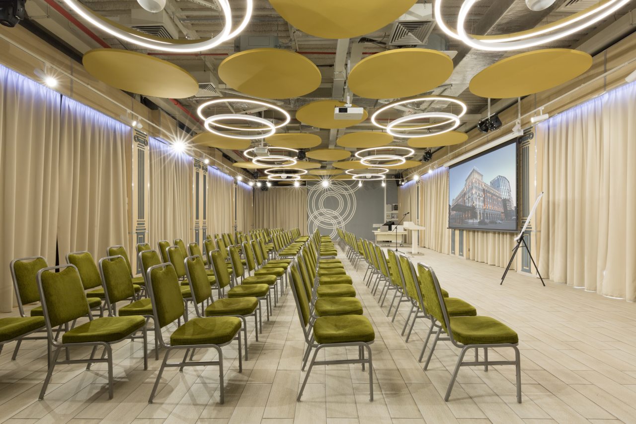 Площадь конференц-зала — 97 кв.м., размещение — до 120 человек.