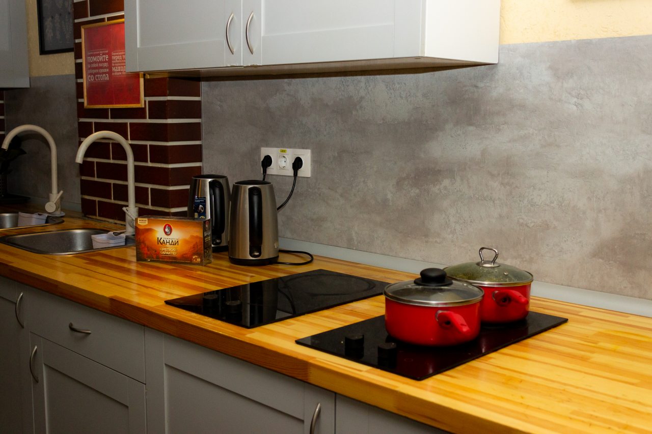 На кухне можно приготовить еду, а также посмотреть телевизор и поработать за ноутбуком.